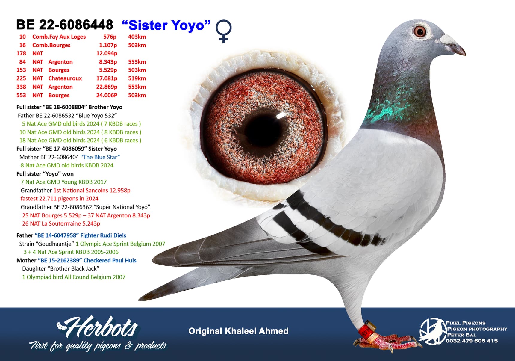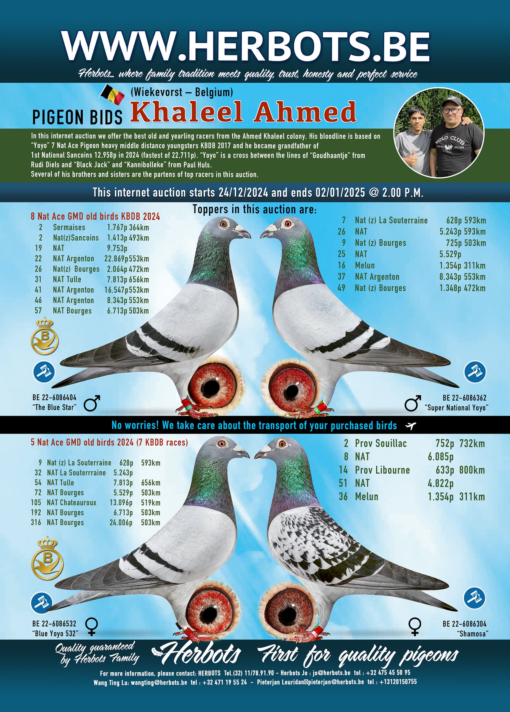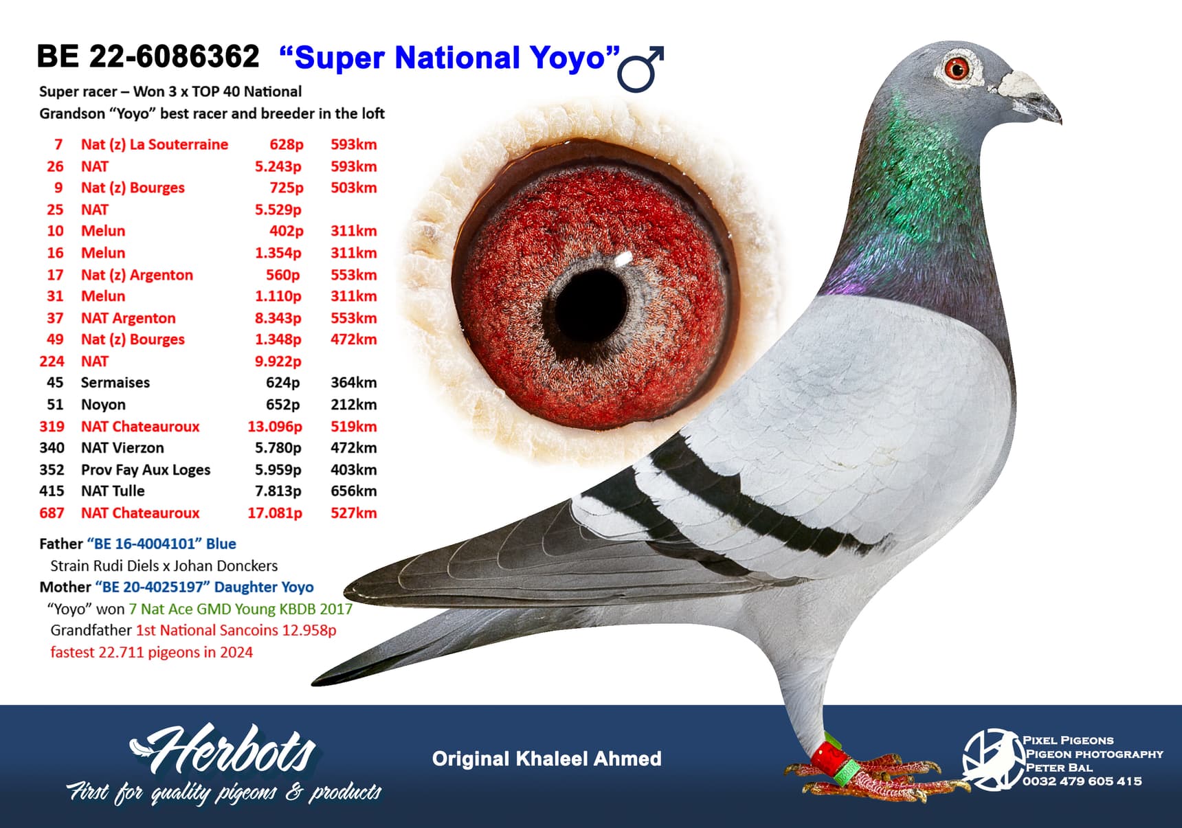 Dans cette vente internet nous vous proposons les meilleurs voyageurs vieux et yearlings de la colonie Ahmed Khaleel. Sa lignée est basée sur le « Yoyo » 7 As Pigeon Nat grand demi-fond pigeonneaux RFCB 2017 et il est devenu grand-père du 1er National Sancoins 12.958p en 2024 (le plus rapide de 22.711p). « Yoyo » est un croisement entre les lignes de « Goudhaantje » Rudi Diels et « Black Jack » et « Kannibolleke » Paul Huls. Plusieurs de ses frères et sœurs sont les pères des meilleurs voyageurs de cette vente.