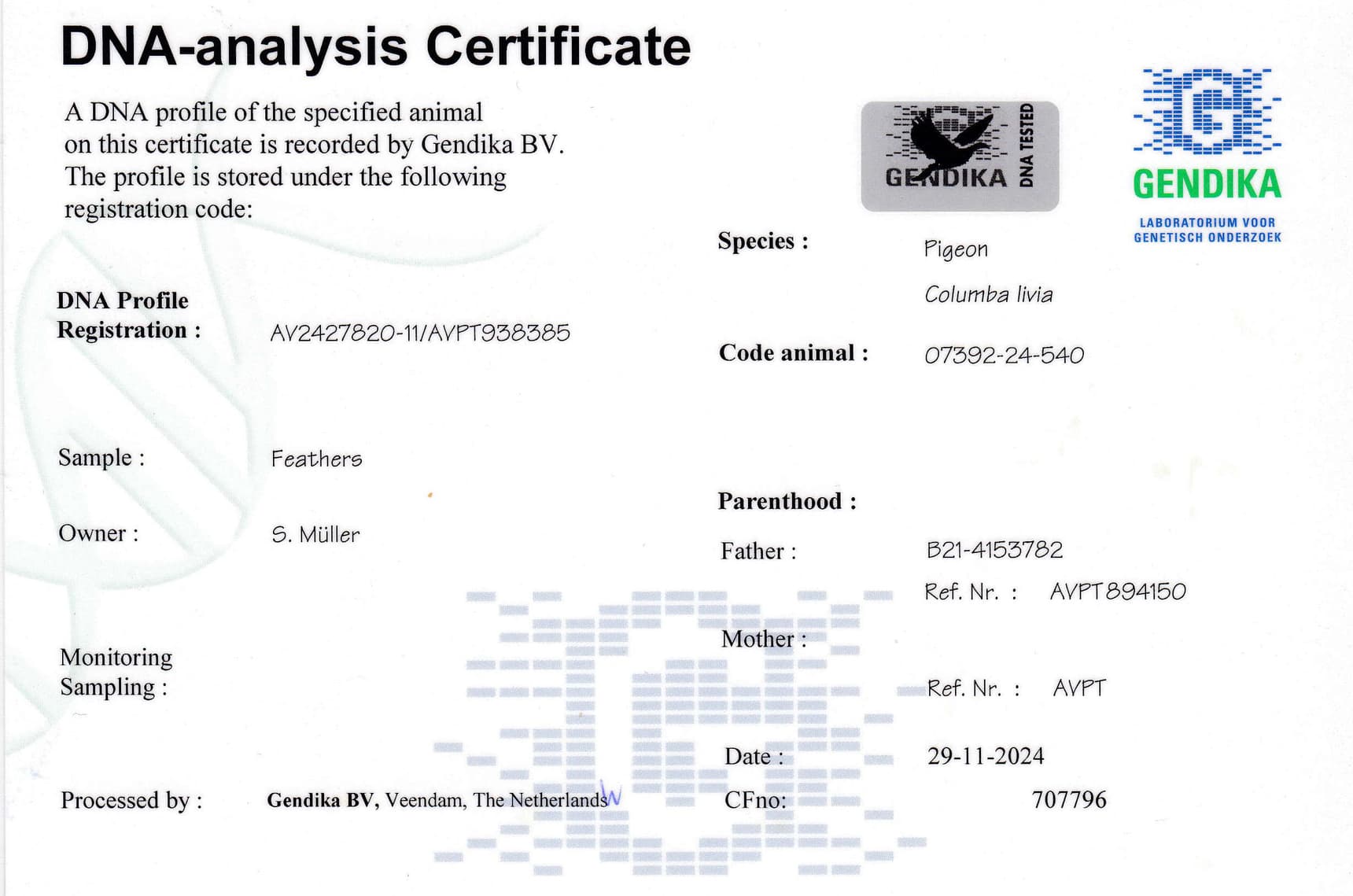 Born out “Best Kittel” (1st and 4th Nat. KBDB ace bird) x “Sister Olympic Rosita” (sister base breeding hen andOlympiad bird “Olympic Rosita” – original Van de Bulck)