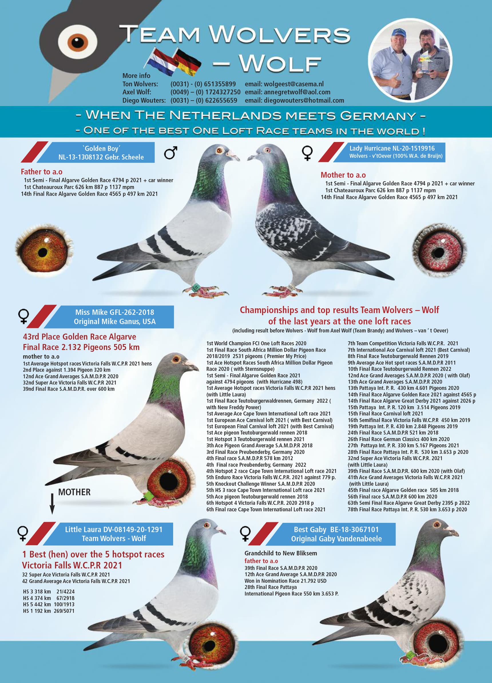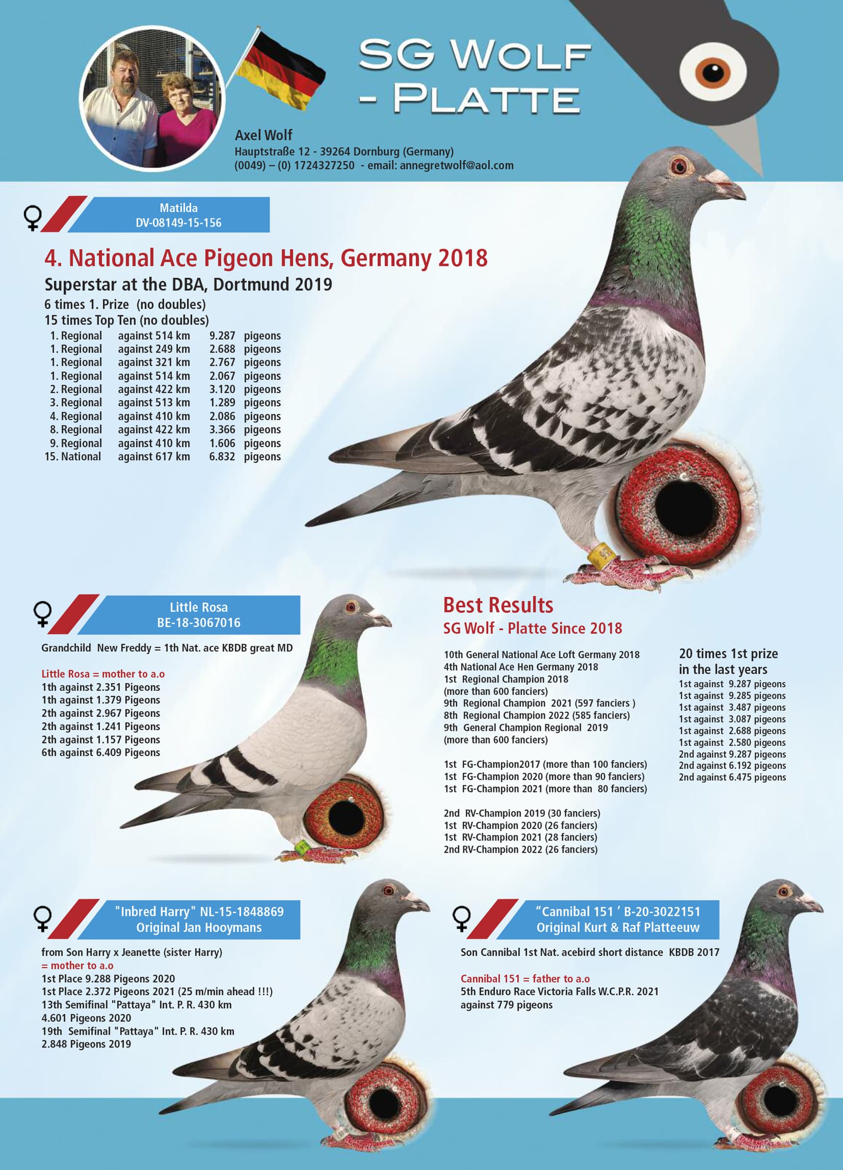 Born out “Freddy Boy” x “Sister Magic Blue”, parents of 8 x 1st prize – 1st Charleville 1,958b. - 1st Rethel 1,148b. – 1st Sezanne 287b. – and so on