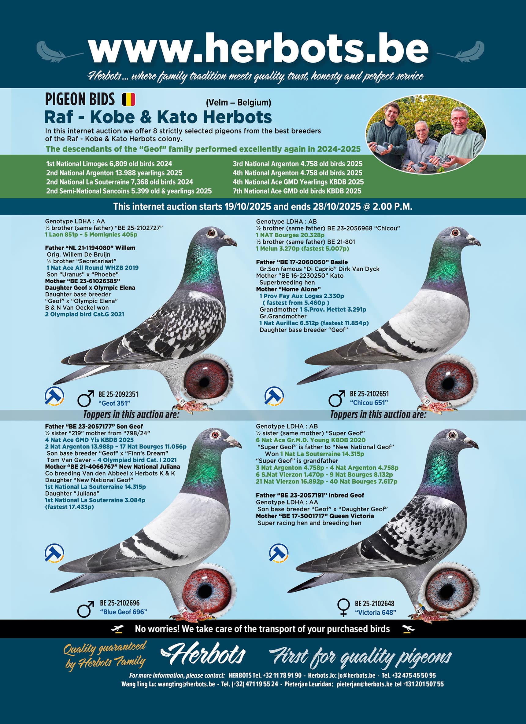 Dans cette vente aux enchères sur Internet, nous proposons 9 pigeons strictement sélectionnés parmi les meilleurs éleveurs de la colonie Raf - Kobe & Kato Herbots.