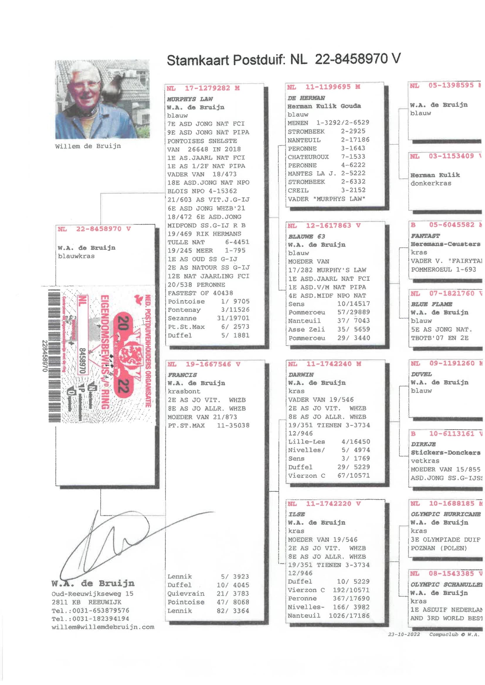 Éleveur : 100% WILLEM DE BRUIJN 纯威廉迪布恩血统