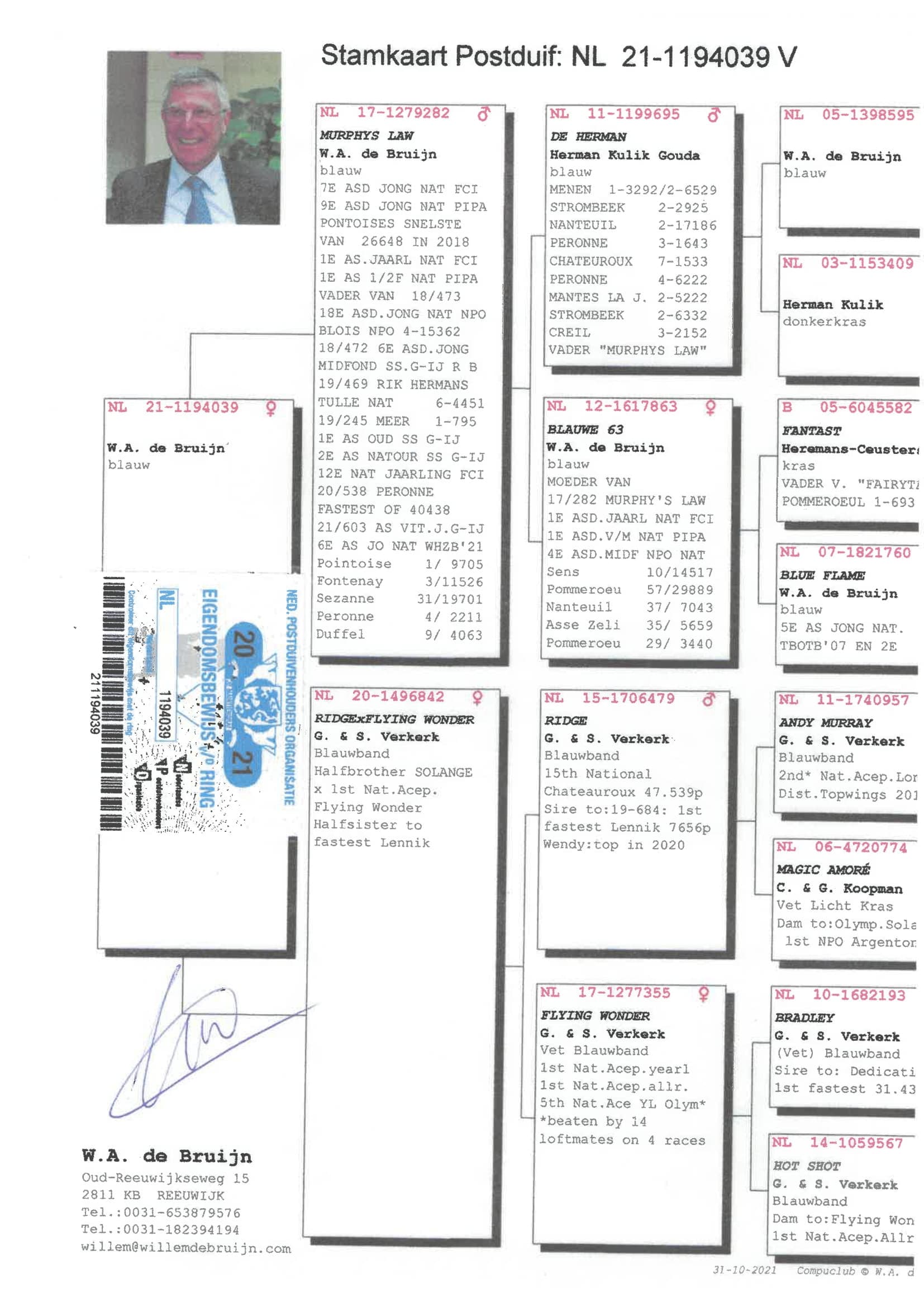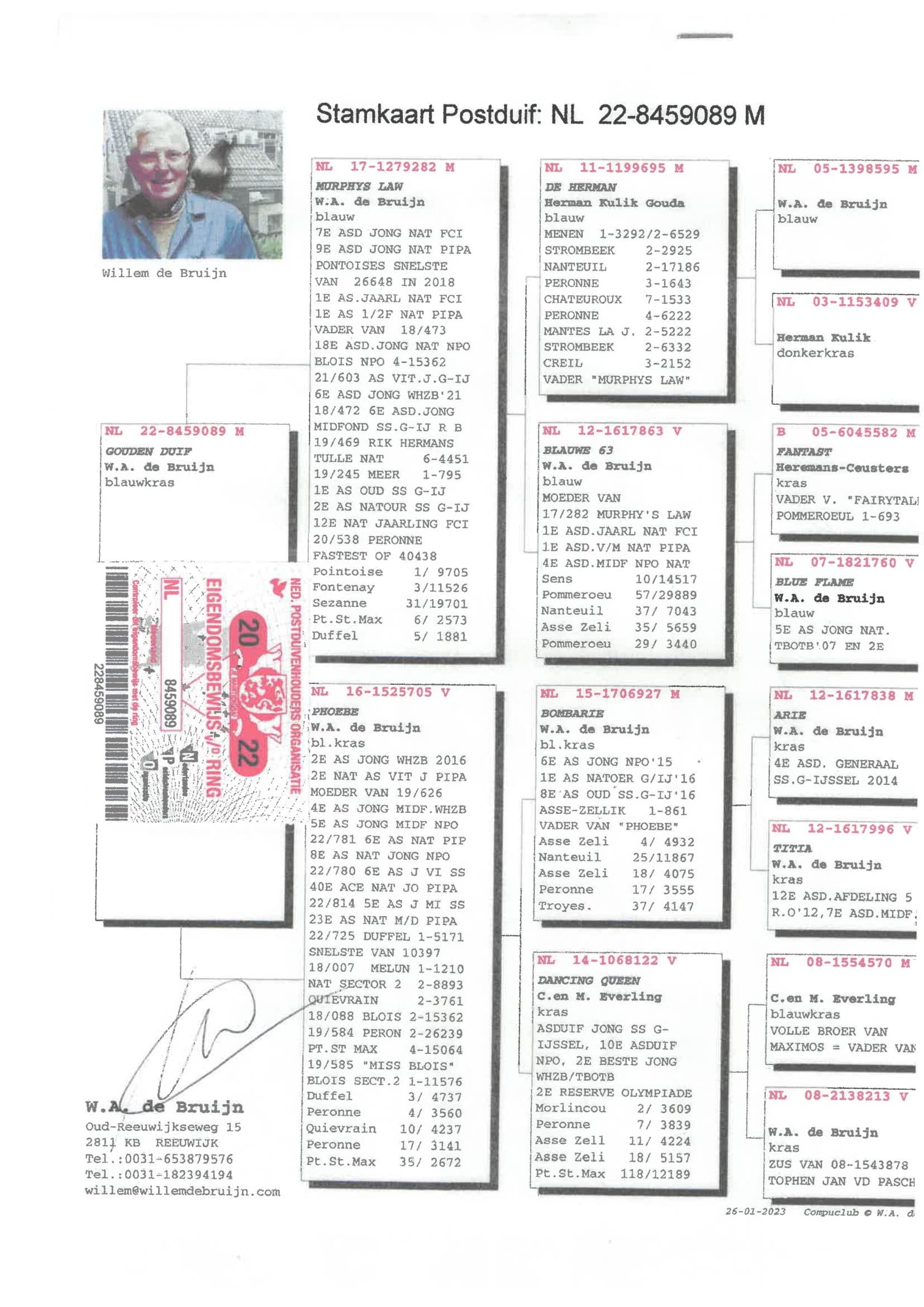 Éleveur : 100% WILLEM DE BRUIJN 纯威廉迪布恩血统