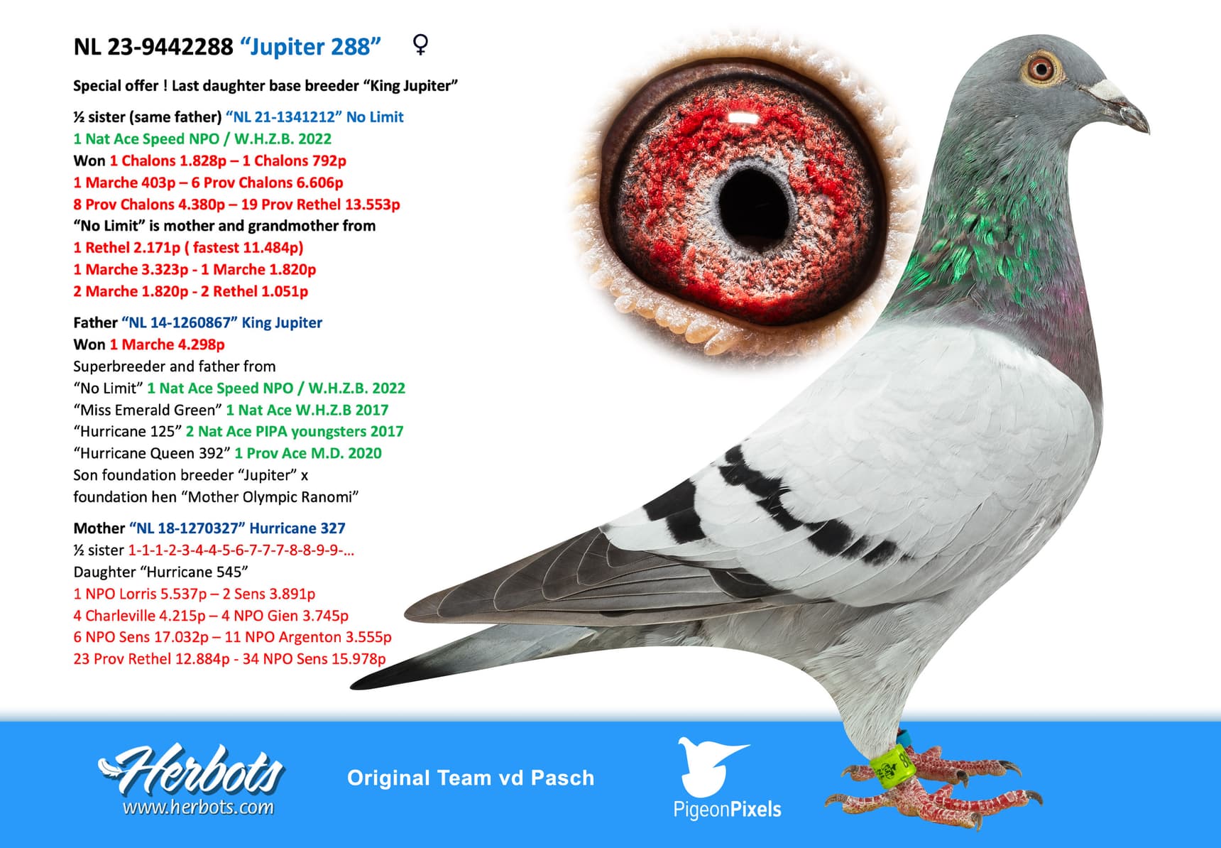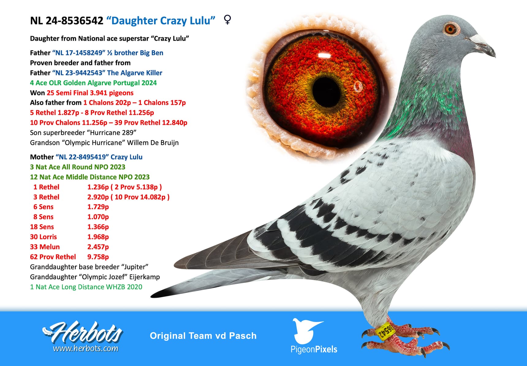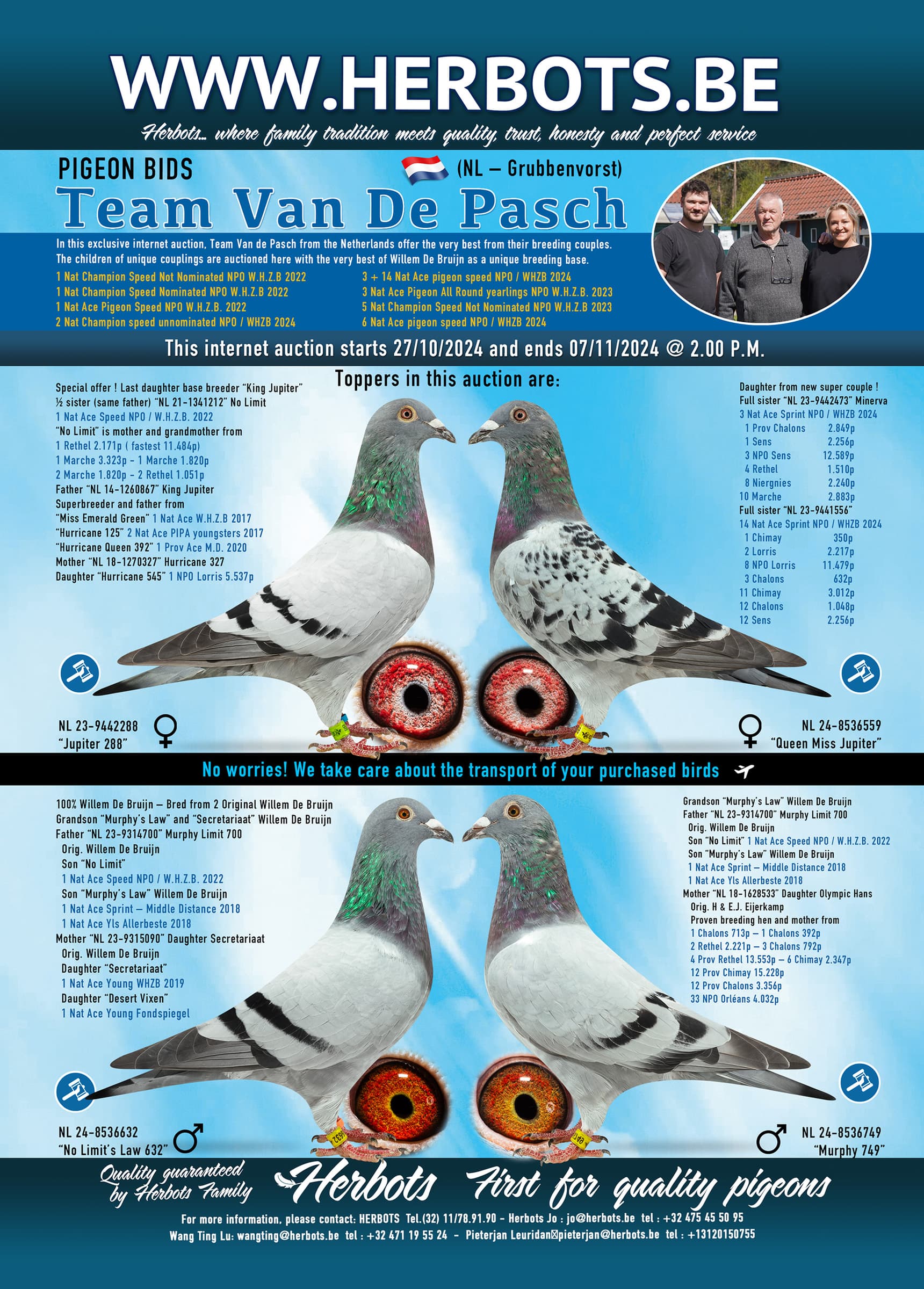 Dans cette vente aux enchères exclusive sur Internet, l'équipe Van de Pasch des Pays-Bas offre le meilleur de ses couples reproducteurs. Les enfants issus d'accouplements uniques sont ici vendus aux enchères avec le meilleur de Willem De Bruijn comme base d'élevage unique.