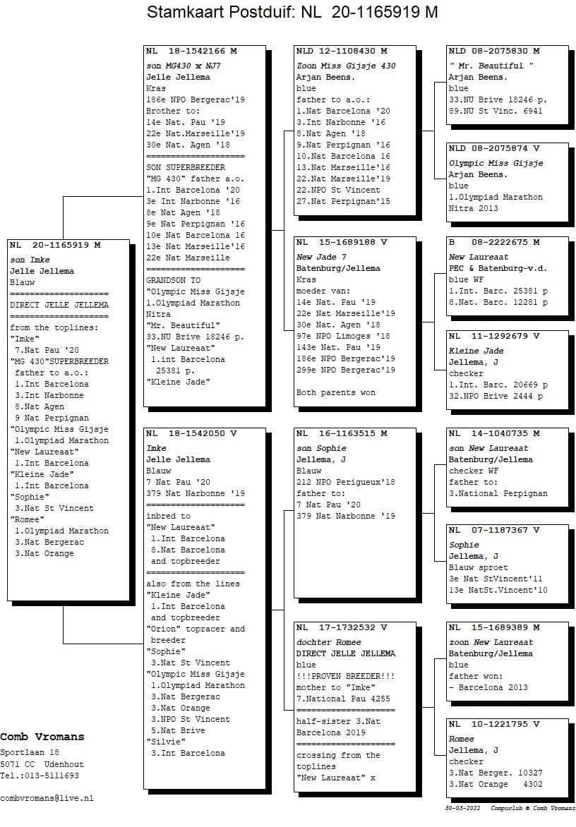 Breeding line 1st Internat. Barcelona “New Laureaat” and “Romee” (3rd Nat. Bergerac 10,327b. – 3rd Nat. Orange 4,302b.)