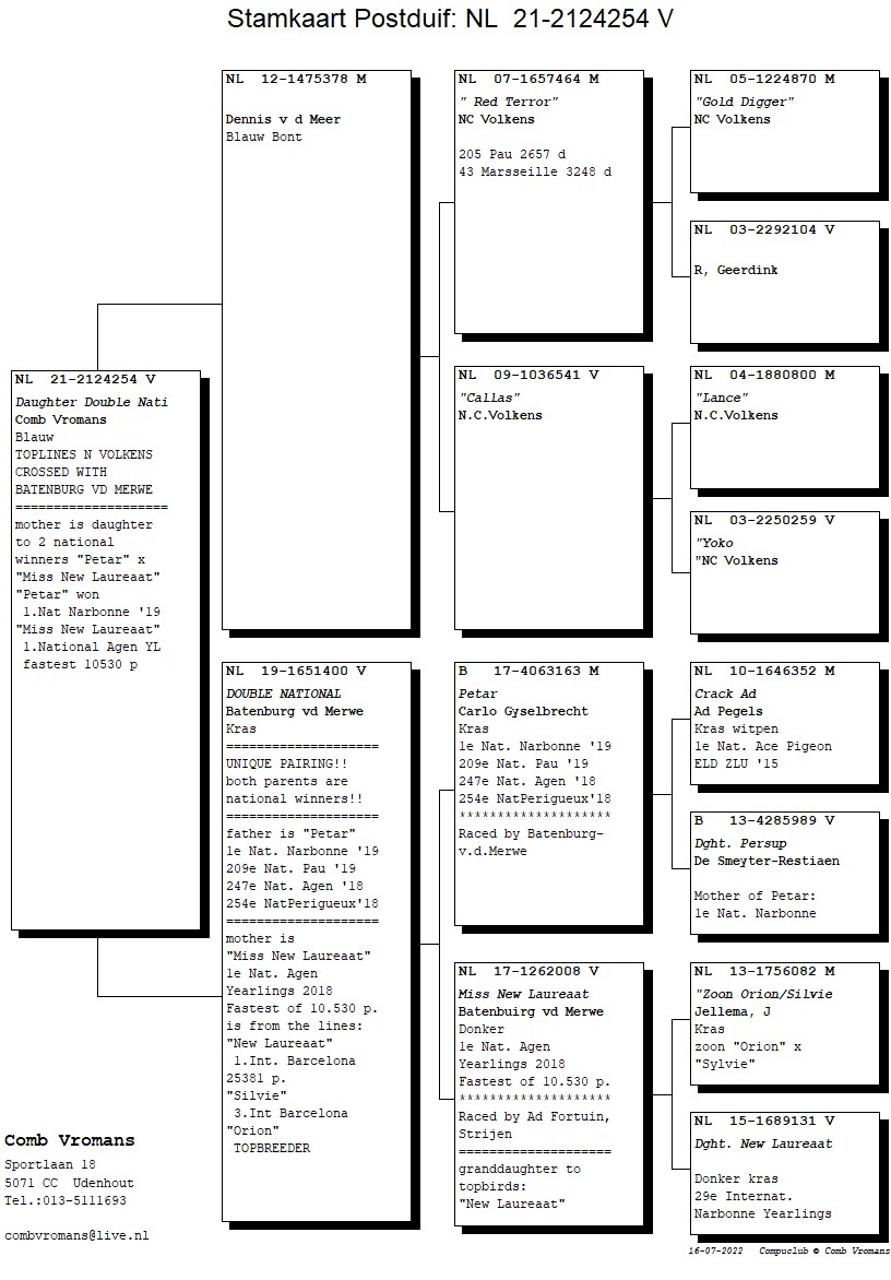 Granddaughter “New Laureaat” (1st Internat. Barcelona 25,381b.) x “Daughter Jonge Witbuik”