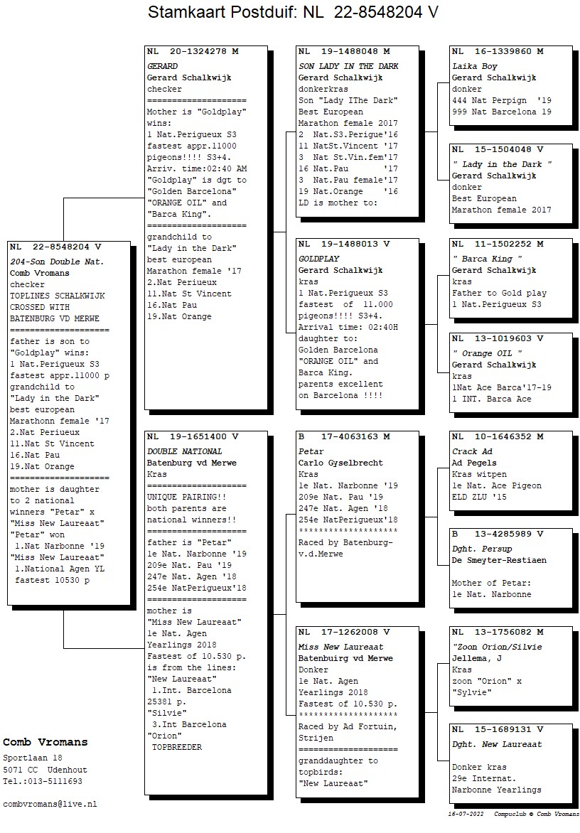 Born out “Laika Boy” (is a half-brother to “Lady In The Dark” and to winners of: 3rd Nat. Perigueux, 33rd Nat. Agen) x “Lady In The Dark”(Best Marathon