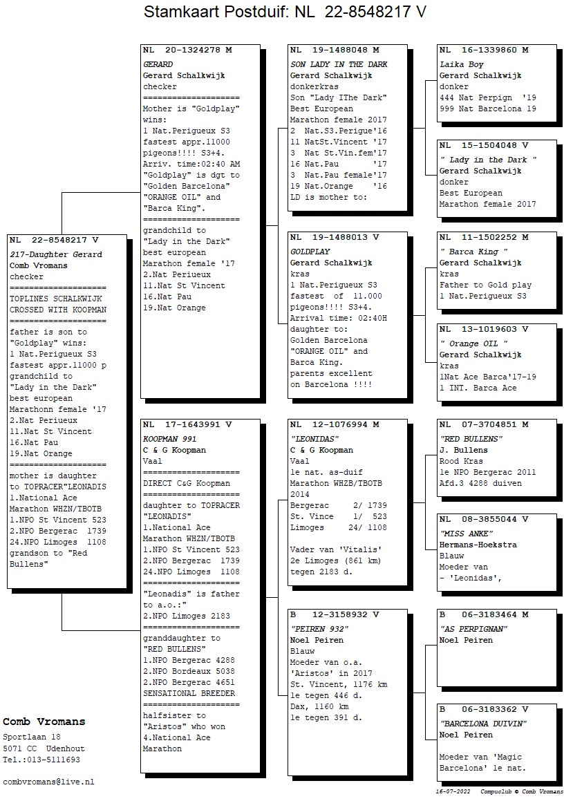 Born out “Laika Boy” (is a half-brother to “Lady In The Dark” and to winners of: 3rd Nat. Perigueux, 33rd Nat. Agen) x “Lady In The Dark”(Best Marathon