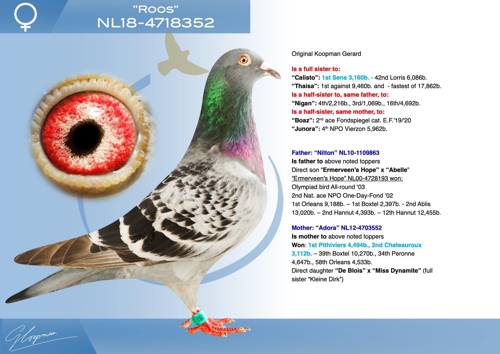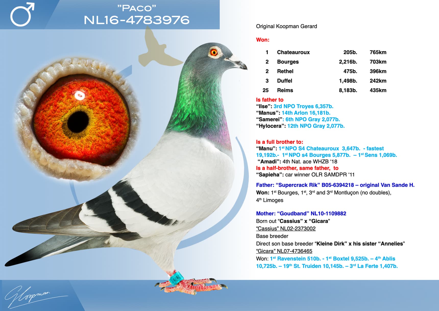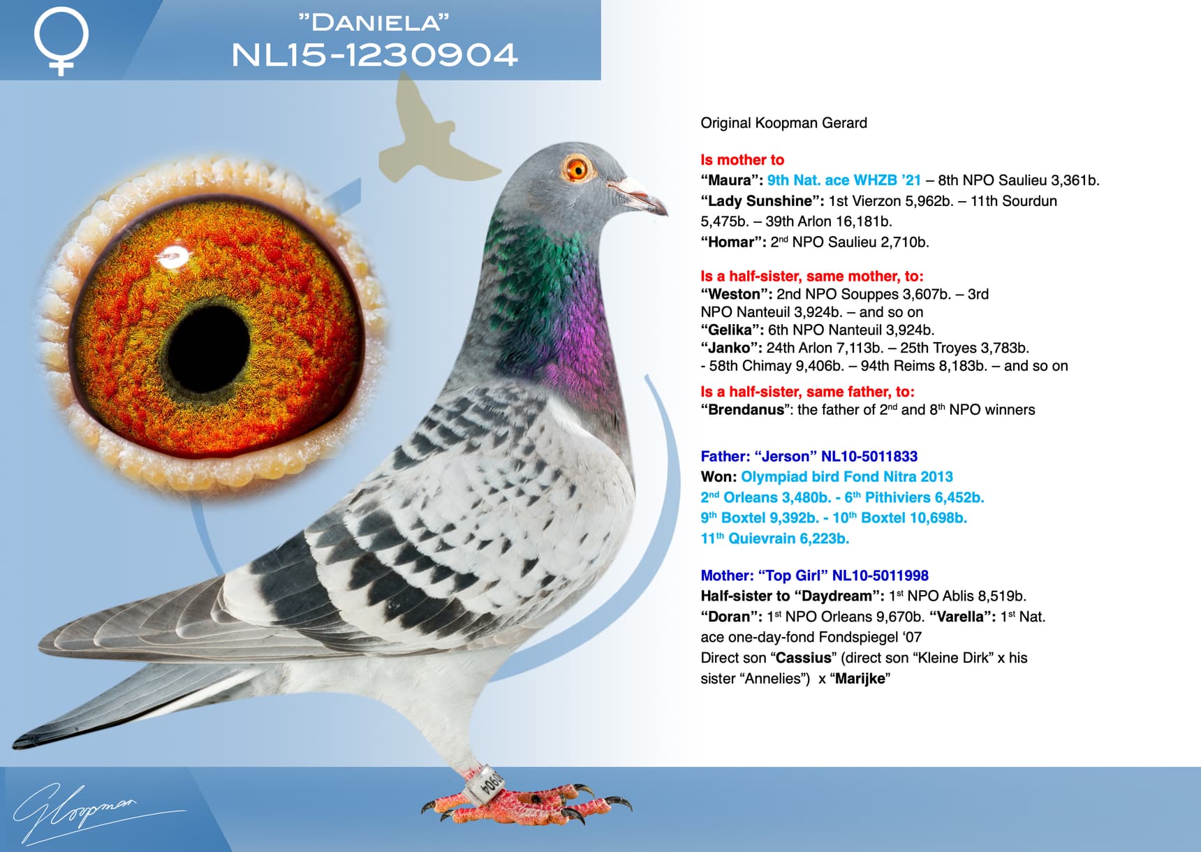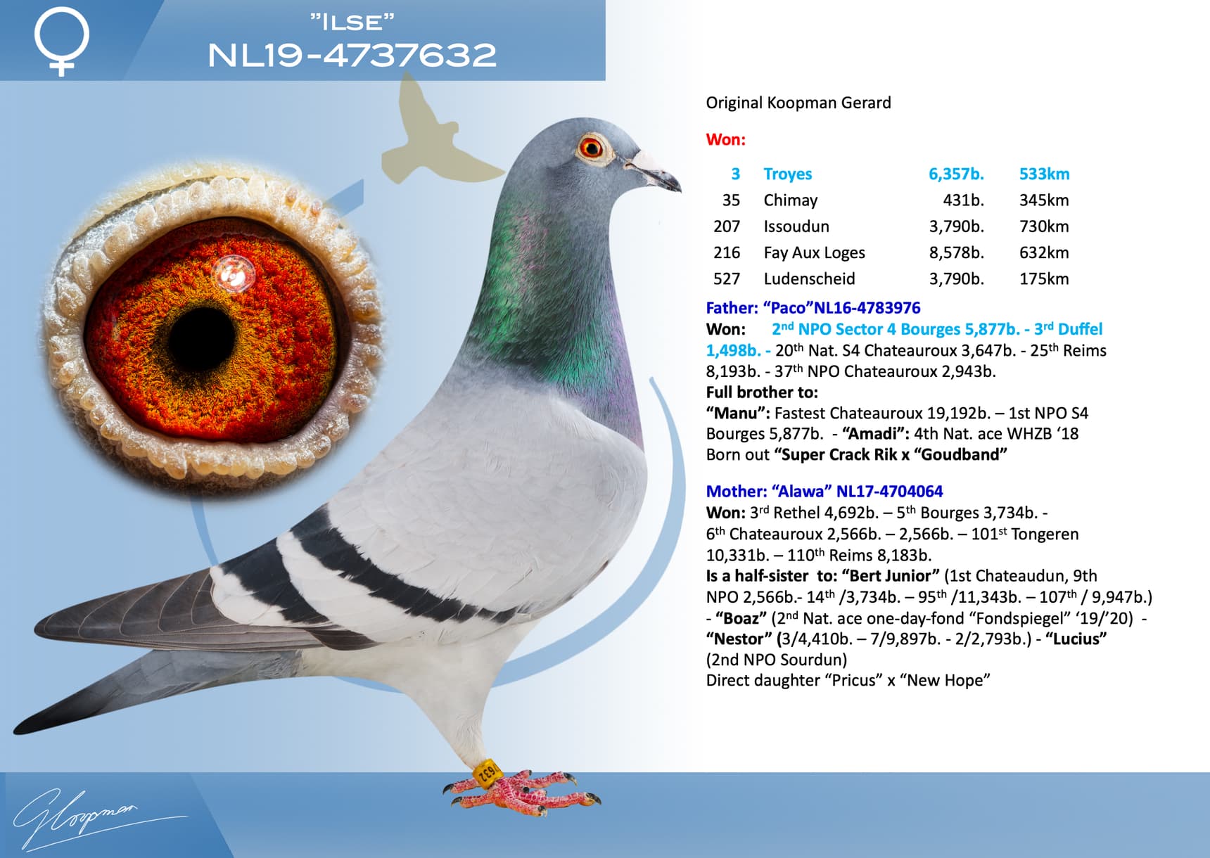 Direct son “Damir” (born out “Golden Capri” x “Goudband”) x his half-sister world-famous “Manu” (1st NPO sector 4 Chateauroux 3,647b. - fastest 19,192b. – 1st NPO sector 4 Bourges 5,877b. – 1st Sens 1,069b.)