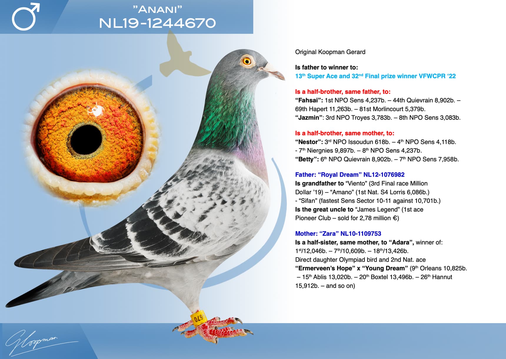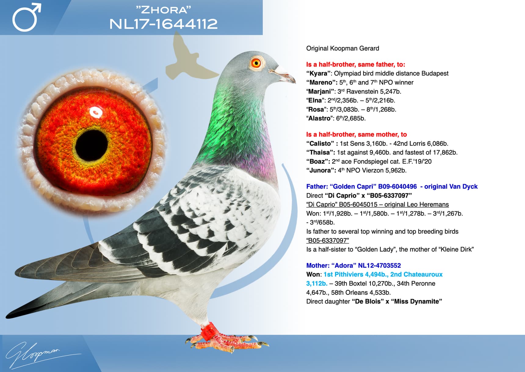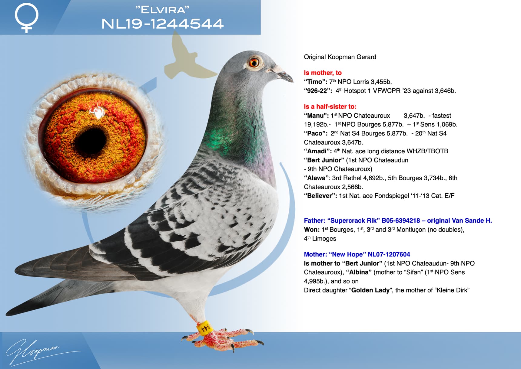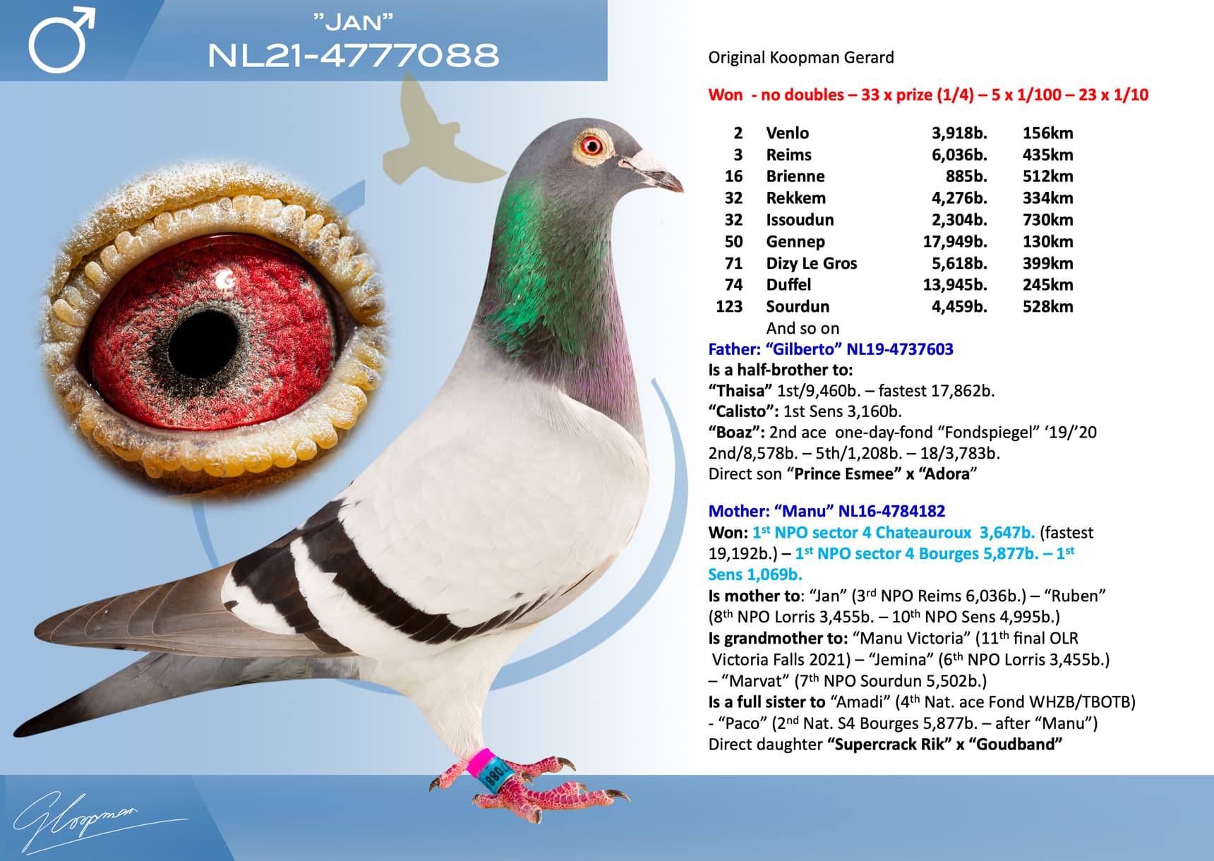 Direct son “Damir” (born out “Golden Capri” x “Goudband”) x his half-sister world-famous “Manu” (1st NPO sector 4 Chateauroux 3,647b. - fastest 19,192b. – 1st NPO sector 4 Bourges 5,877b. – 1st Sens 1,069b.)