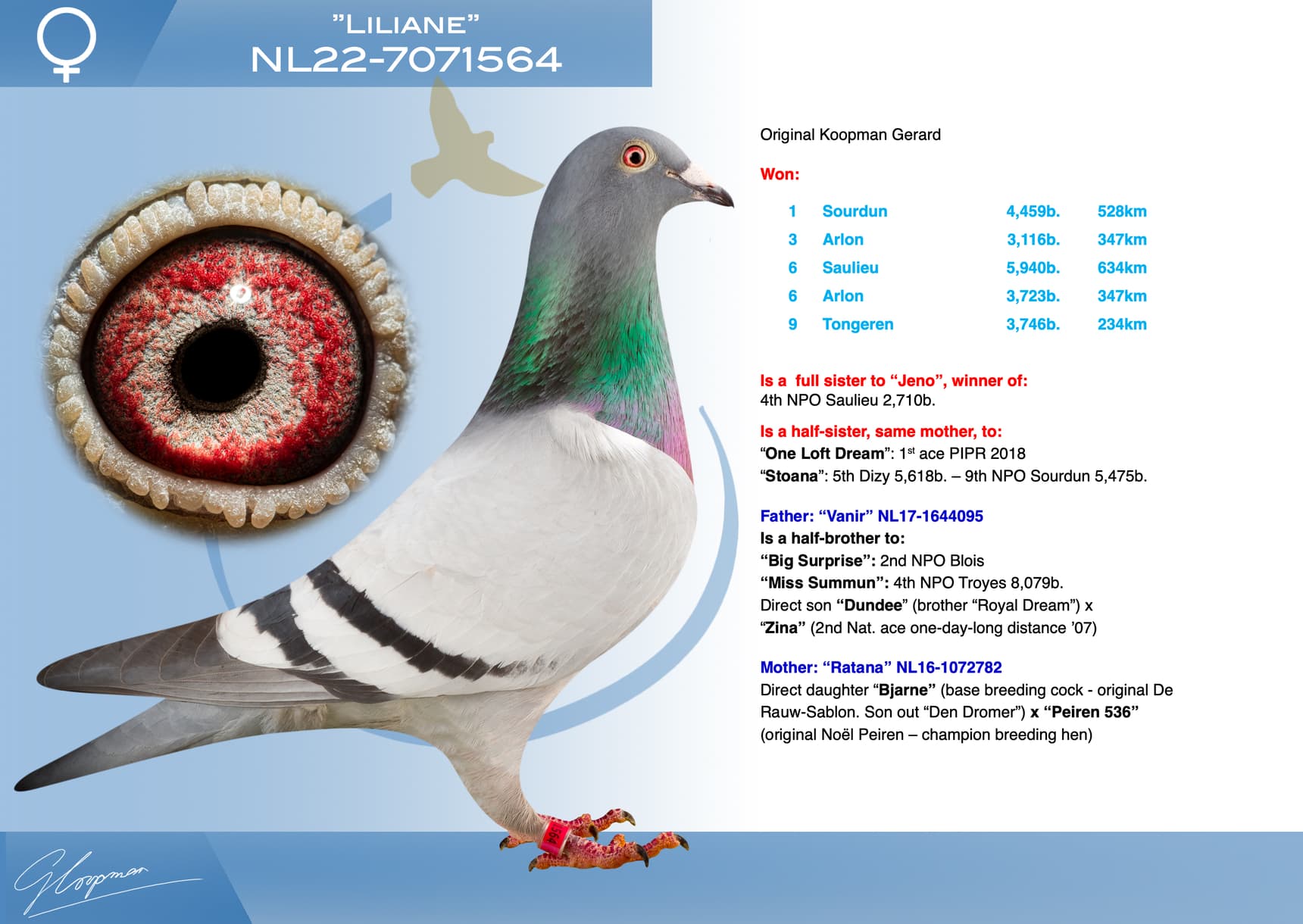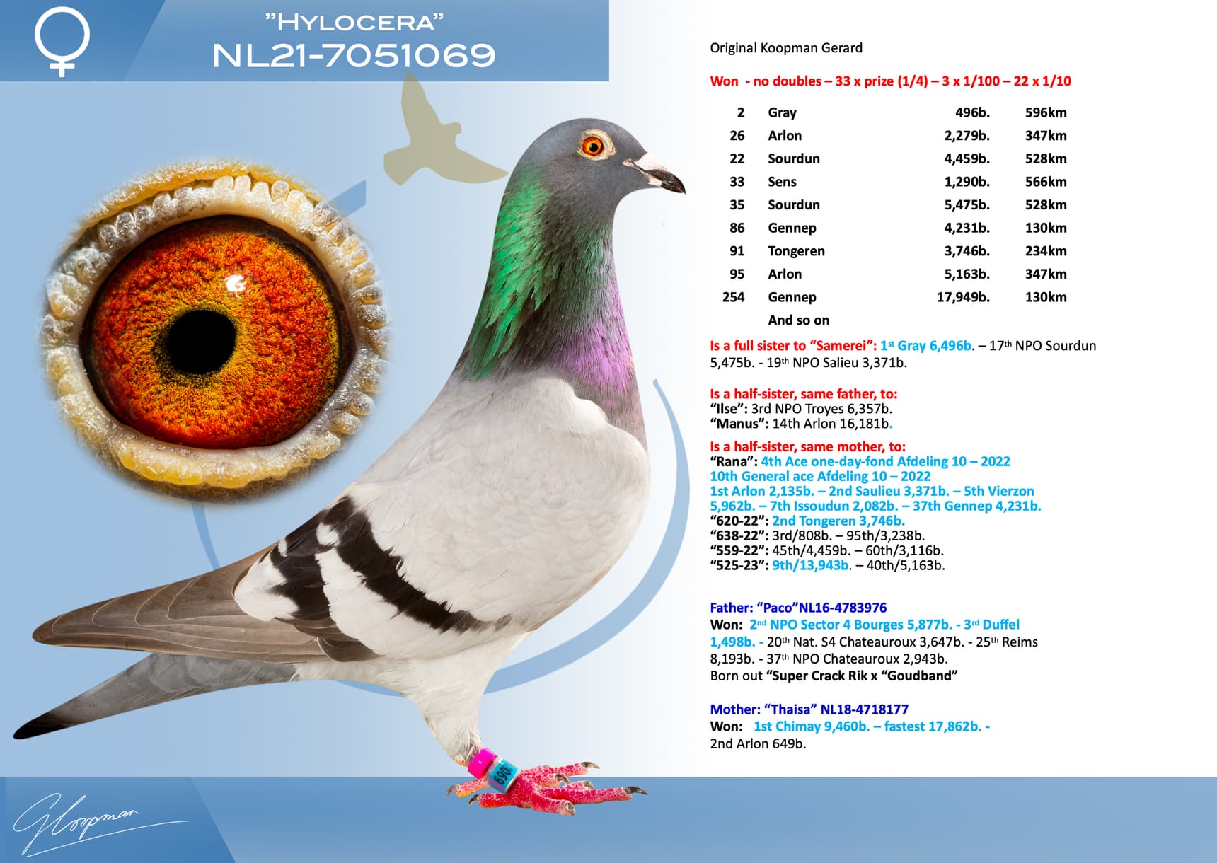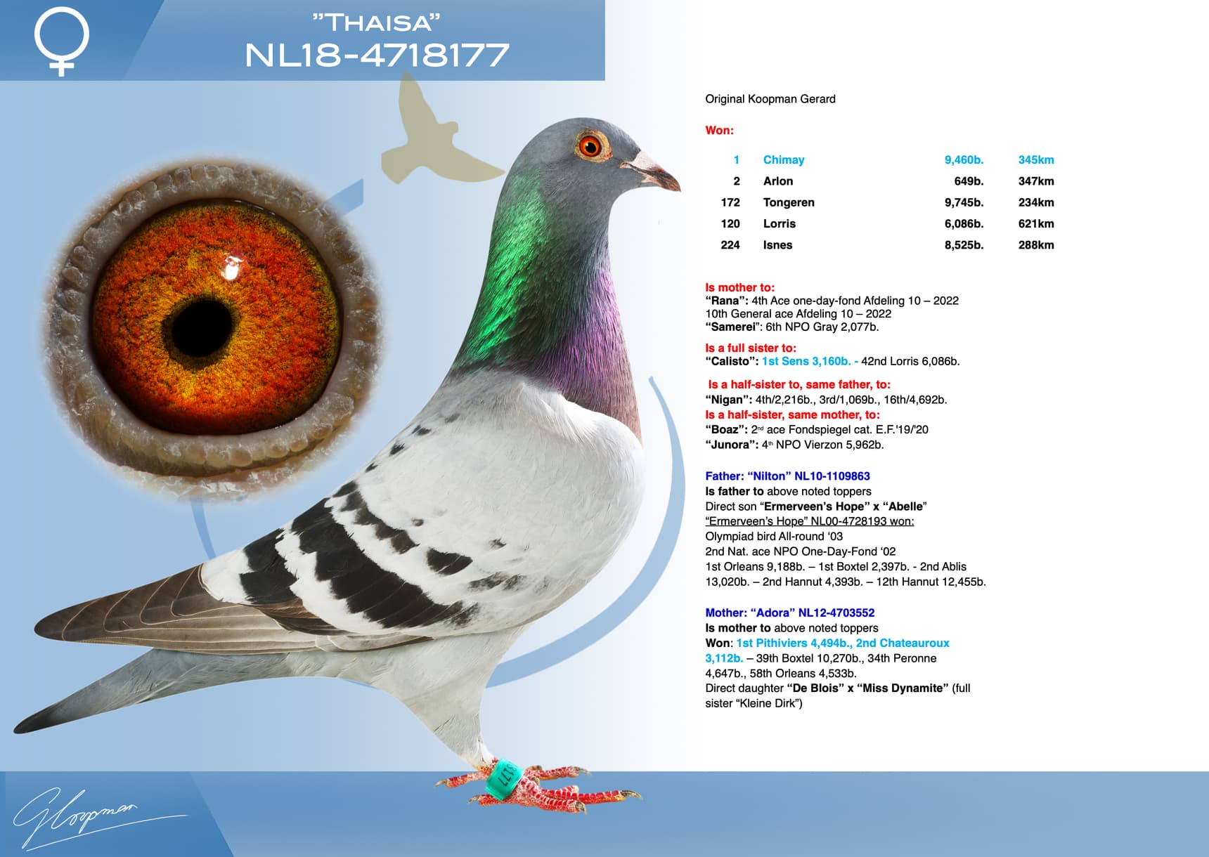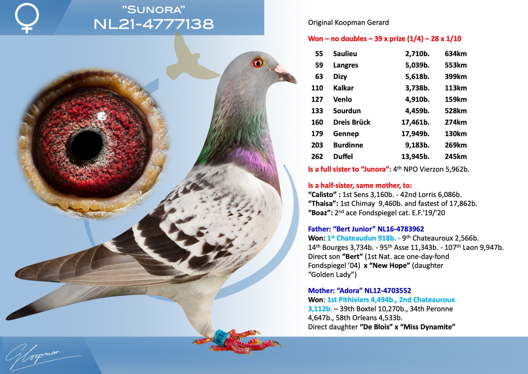 Direct son “Damir” (born out “Golden Capri” x “Goudband”) x his half-sister world-famous “Manu” (1st NPO sector 4 Chateauroux 3,647b. - fastest 19,192b. – 1st NPO sector 4 Bourges 5,877b. – 1st Sens 1,069b.)