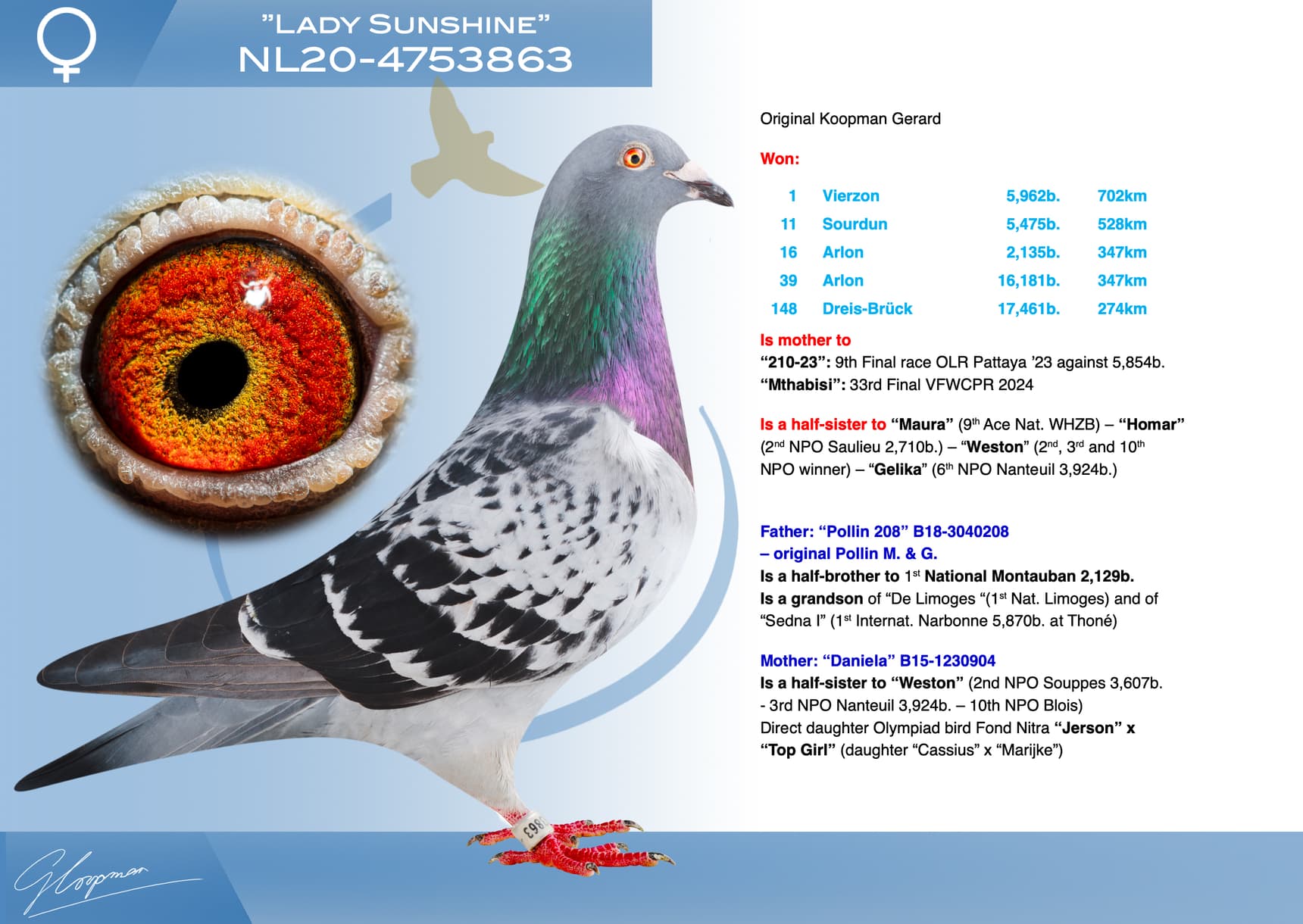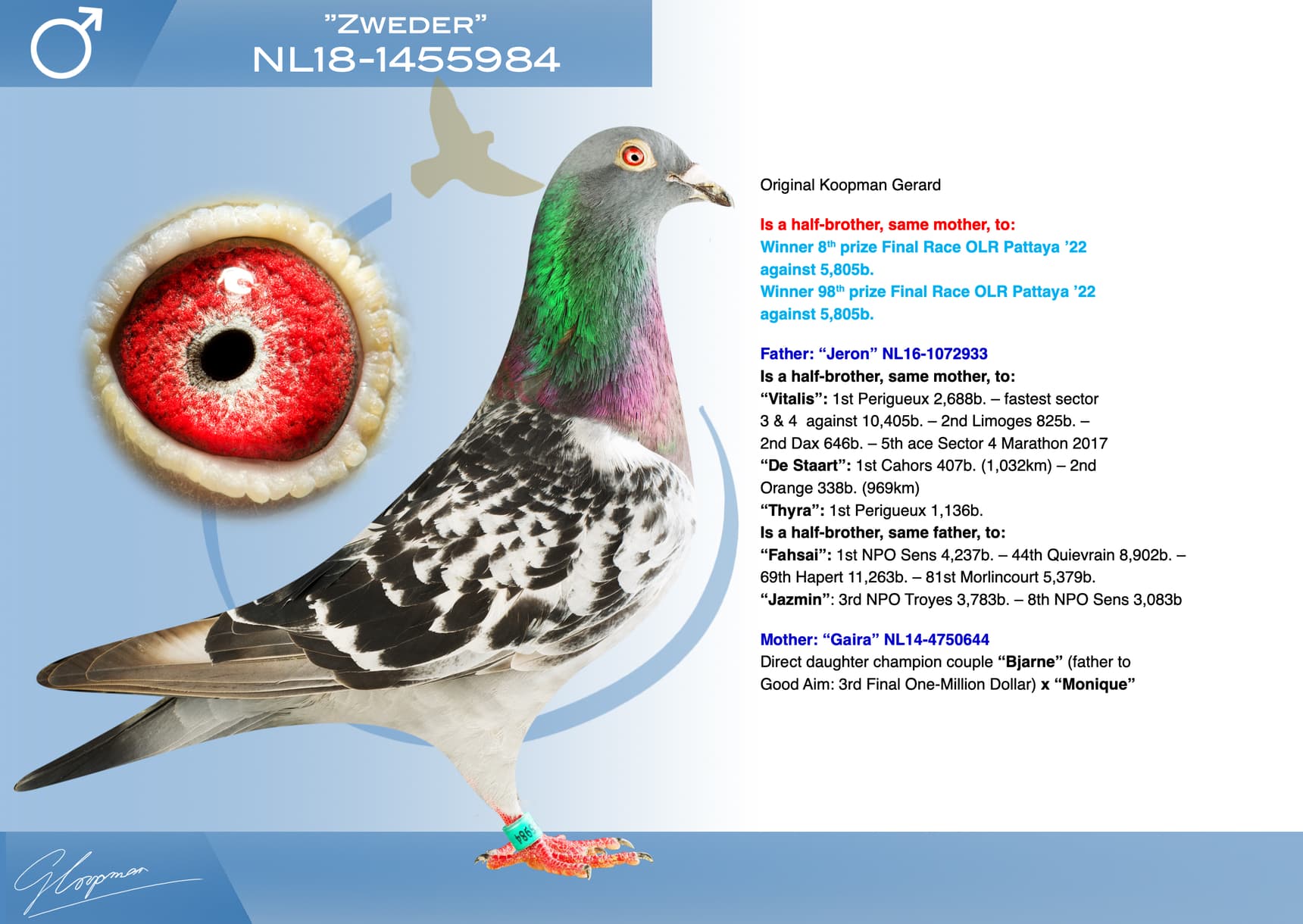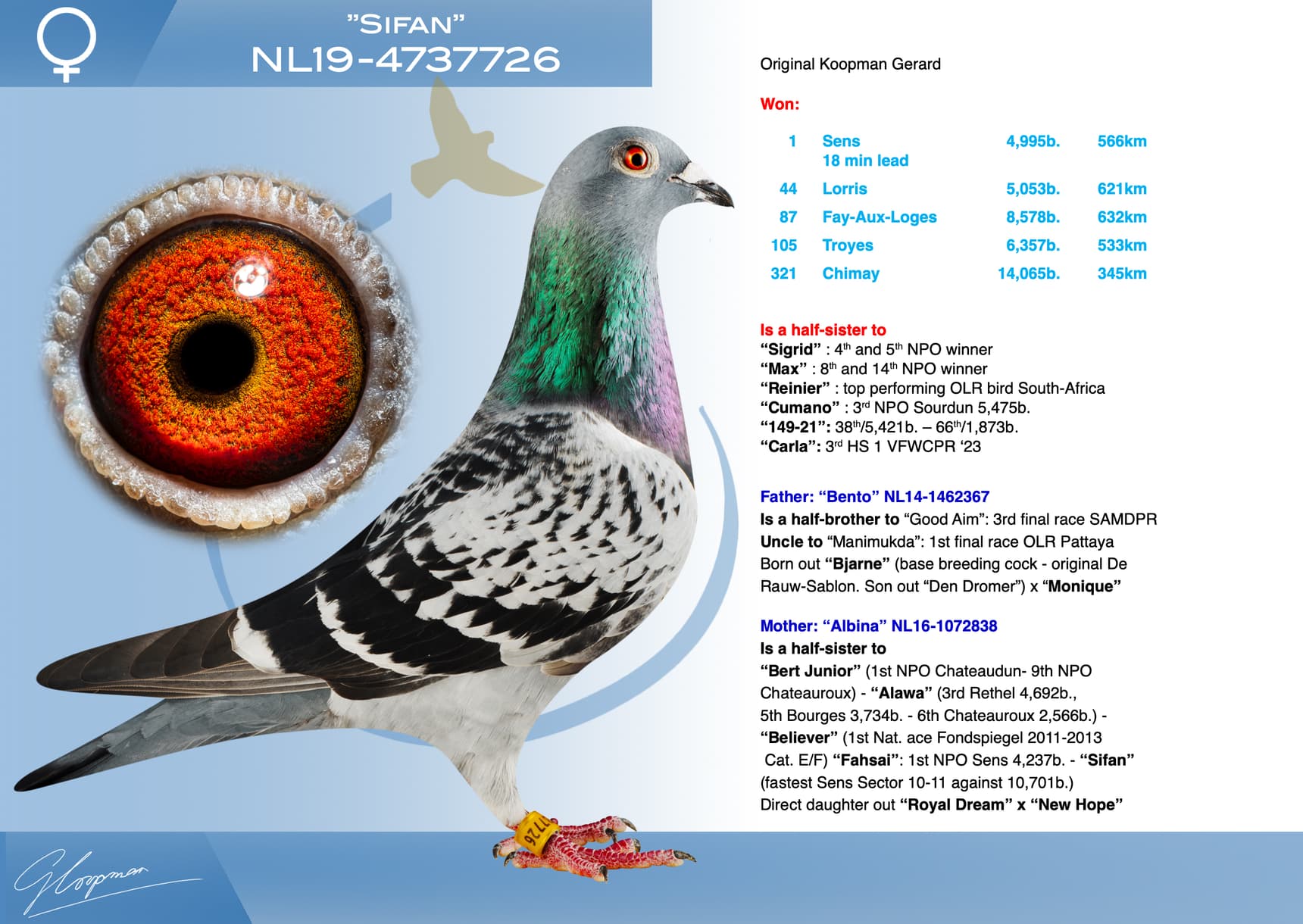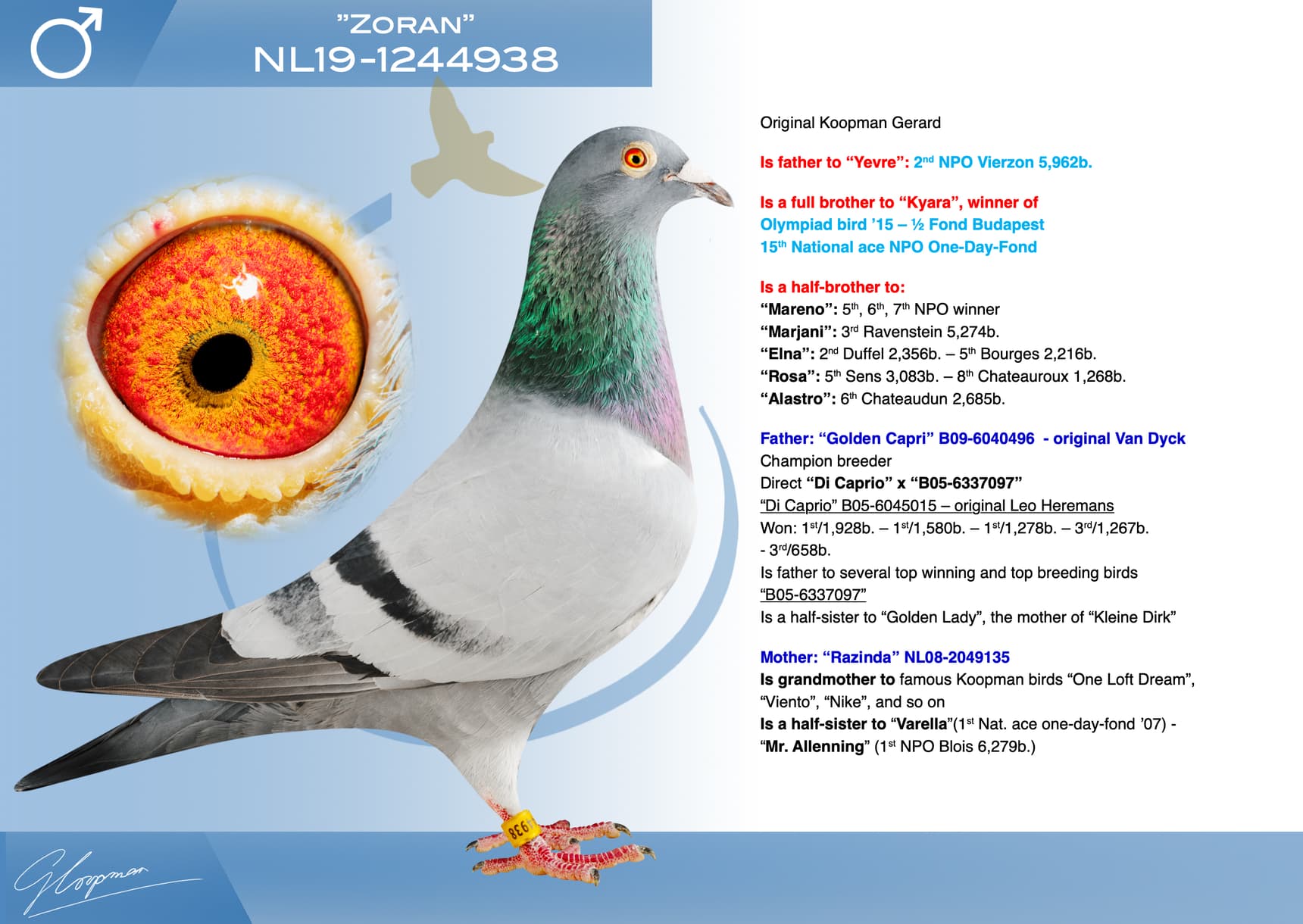 Is a grandson of Olympiad bird “Dortmunder” x “Sedna I” (1st Internat. Narbonne 5,870 yearbirds)
