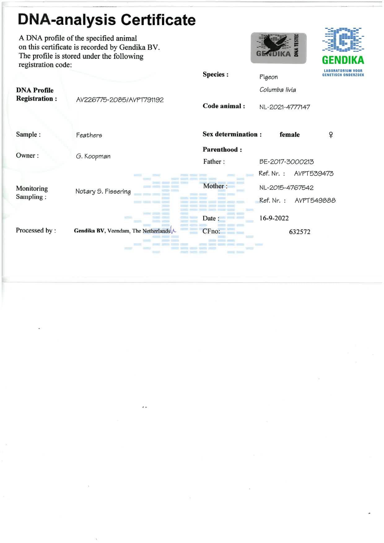 Direct daughter “Cayenne” (original Veenstra – brother 1st Nat. ace “Dolce Vita” and “Chanel N 5”)x “Drissa” (half-sister Olympiad bird “Kyara”)