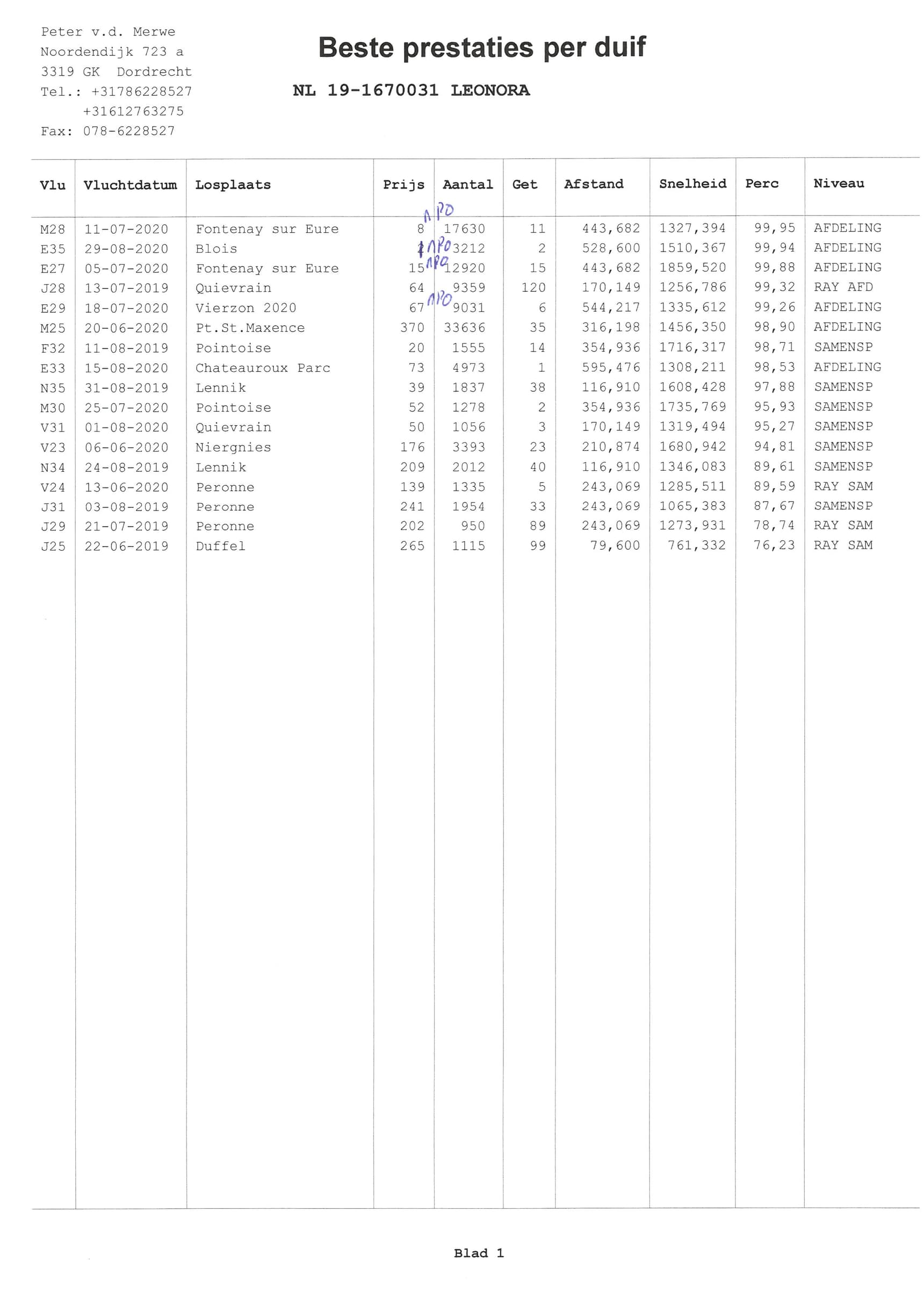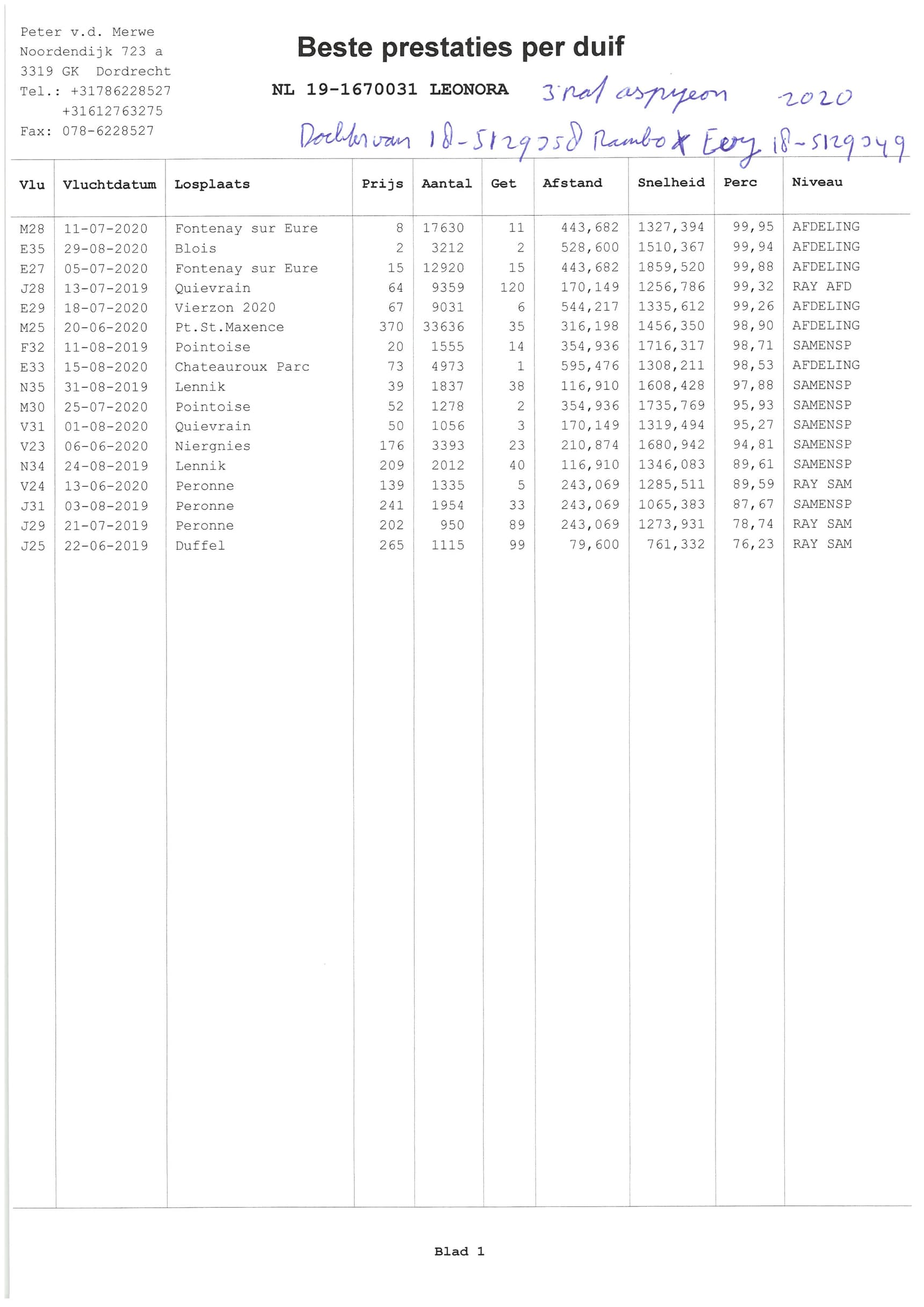2nd Olympiad bird 1/2 Fond. - “Leonora” (3rd and 5th Nat. ace winner)