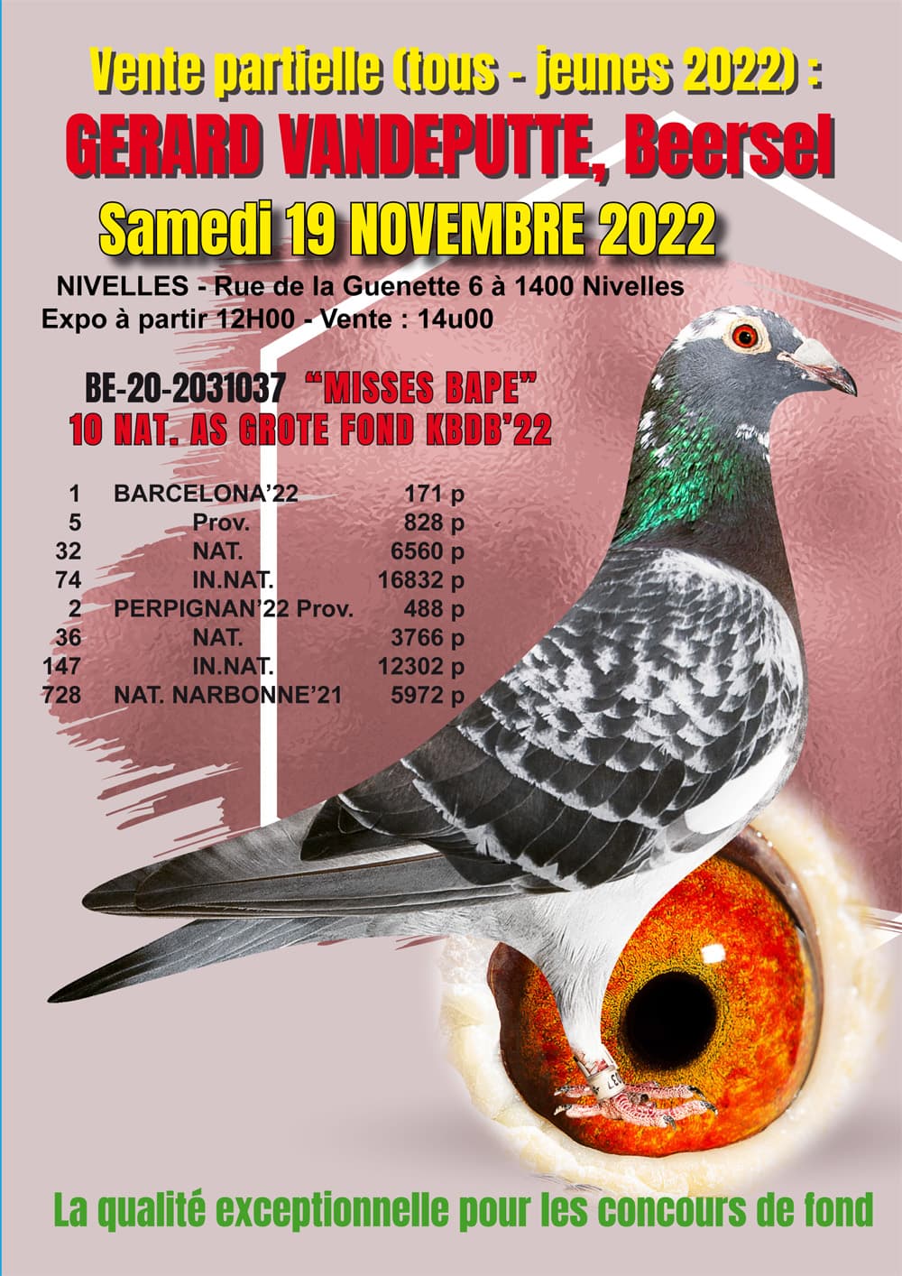 Vente partielle de tous les pigeons, sauf les jeunes 2022. La qualité exceptionnelle pour les concours de fond. 4 Champion Nat. 1 + 2 Fond Vx. 2021. Le '048-19' 2 As Nat. Rhône 2022; le '037-20' 10 As Nat. Grand Fond RFCB'22, ...