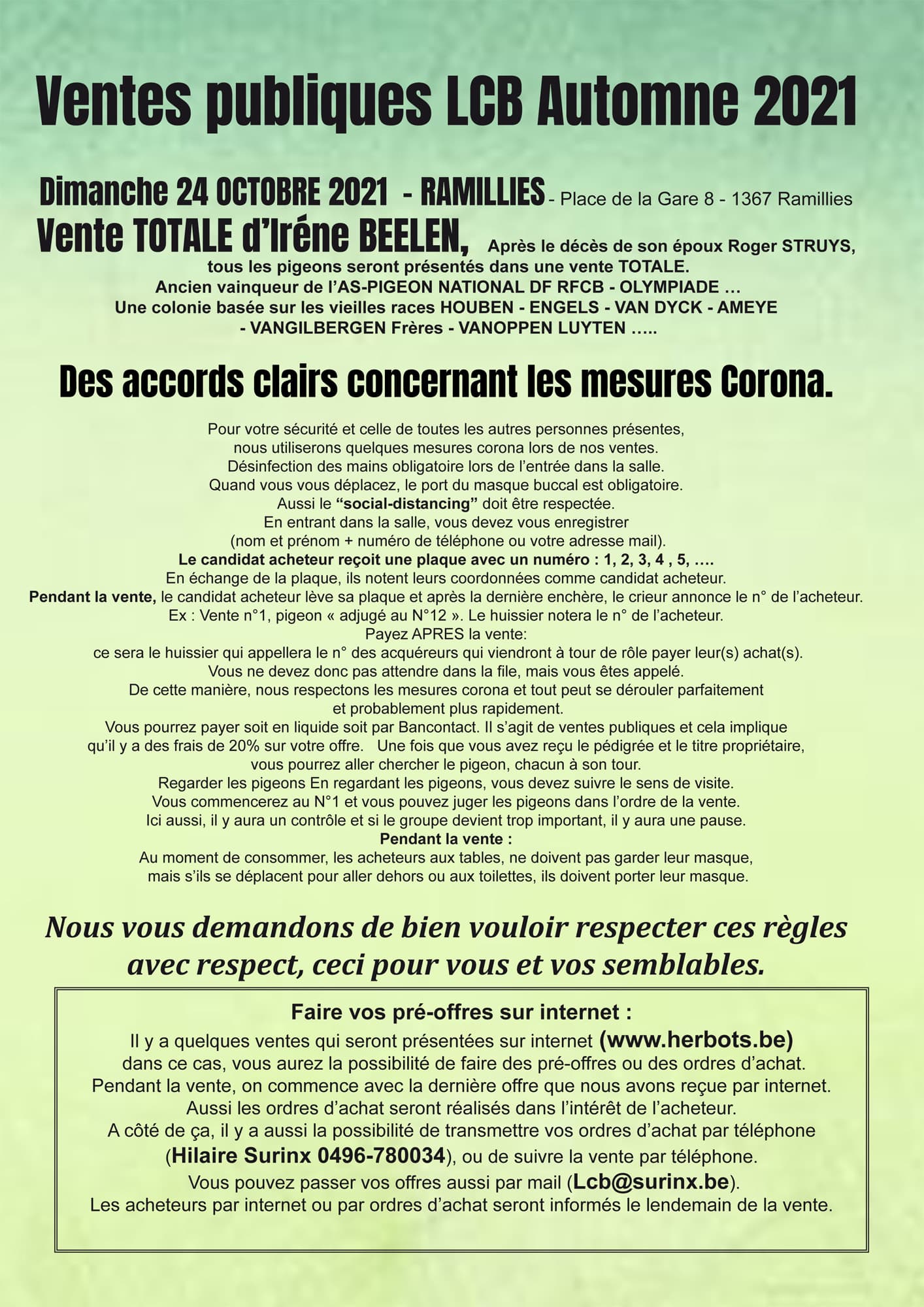 Cette vente est présentée sur www.herbots.be section Pigeon Bids / Public auctions