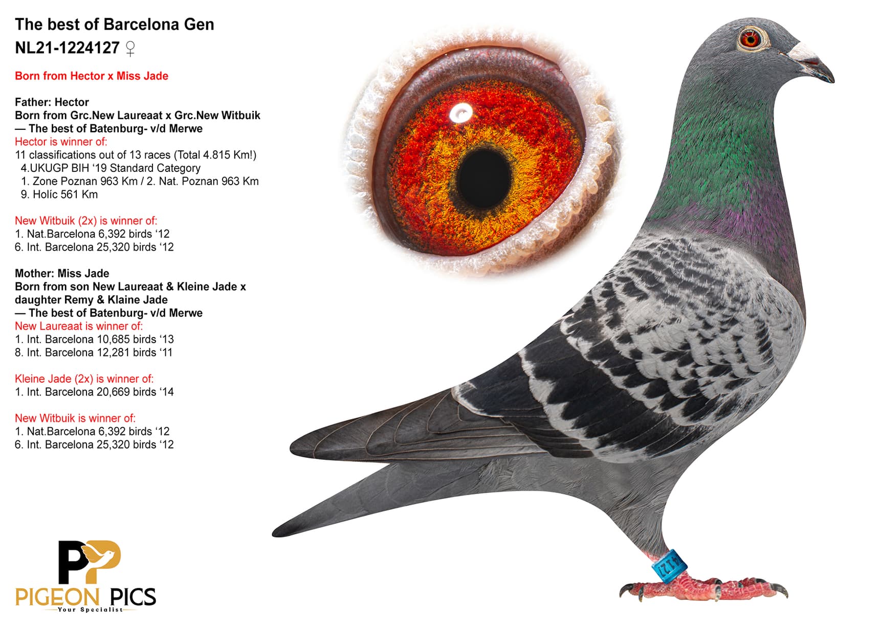 Daughter 2nd Nat. Poznan 963 Km. Also in pedigree Laureaat (3x) Kleine Jade (2x), New Remy, Cindy & New Witbuik.