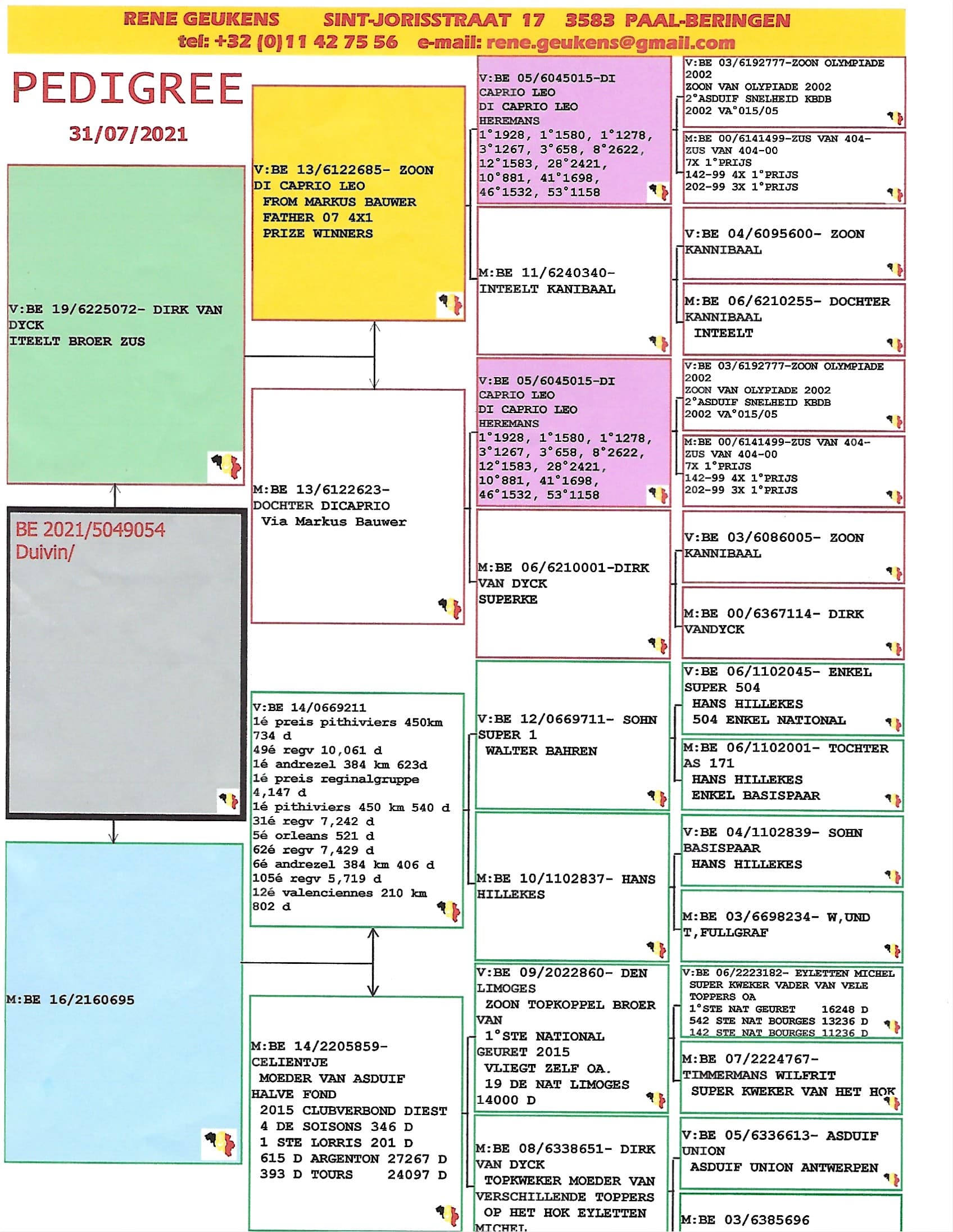 René a commencé à s'occuper de ses propres pigeons en '76. Son père était également colombophile mais pas aussi fanatique et ne l'empêchait pas de dormir si son seul nom était mentionné sur la liste des résultats avec son adresse. Tout a changé pour René lorsque ses amis Gilbert et Henri Van Loo lui ont apporté un panier rempli de jeunes. Les résultats ont grimpé en flèche mais comme René était arbitre (il l'a fait pendant 27 ans), il n'a couru qu'avec des jeunes pendant cette période. Beaucoup de choses ont changé entre-temps, aussi la base de la colonie peut être ramenée aux noms de : Dirk Van Dyck (souche "Olympic Niels" et aussi logiquement "Di Caprio"), Danny Van Dyck (Pulle) Michel Eyletten (Diest) et Markus Bauer (Lochristi où il a un accord de co-élevage avec).