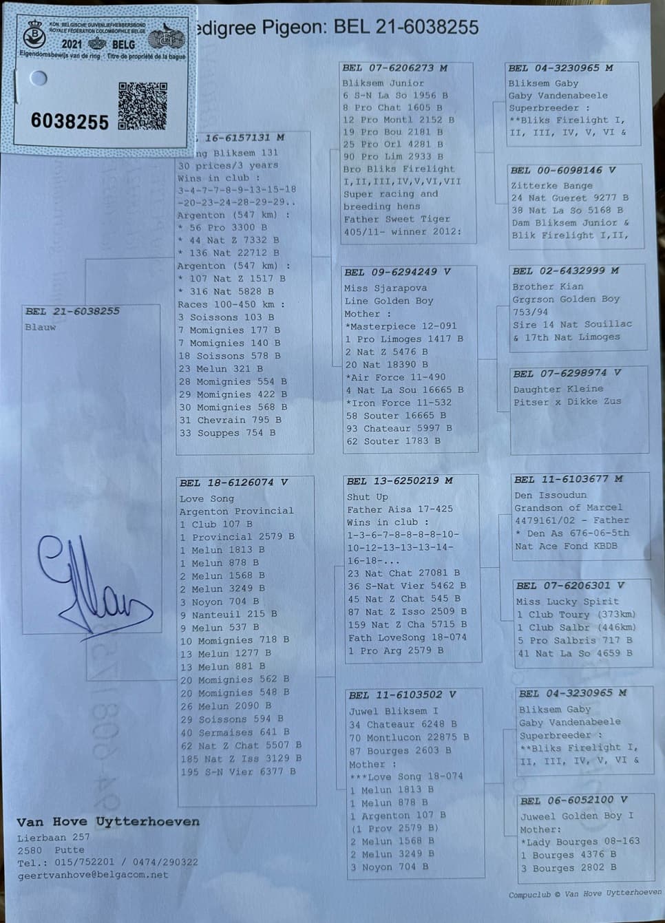 En tant que jeune pigeon, le vainqueur a volé deux fois premier au sprint, ce à quoi je ne m'attendais pas car les parents viennent tous deux de Van Hove - Uytterhoeven et sont destinés à un travail plus dur. Mais c’était déjà un bon signal. En tant que yearling, elle a déjà effectué un vol national et s'est classée par 10. La phase de test bat encore son plein ici sur les vols nationaux et dans peu de temps, Wilfried sera certainement en compétition avec les meilleurs ici chaque semaine. Cette année elle a également volé Vierzon et Bourges et elle a également été classée par 10.