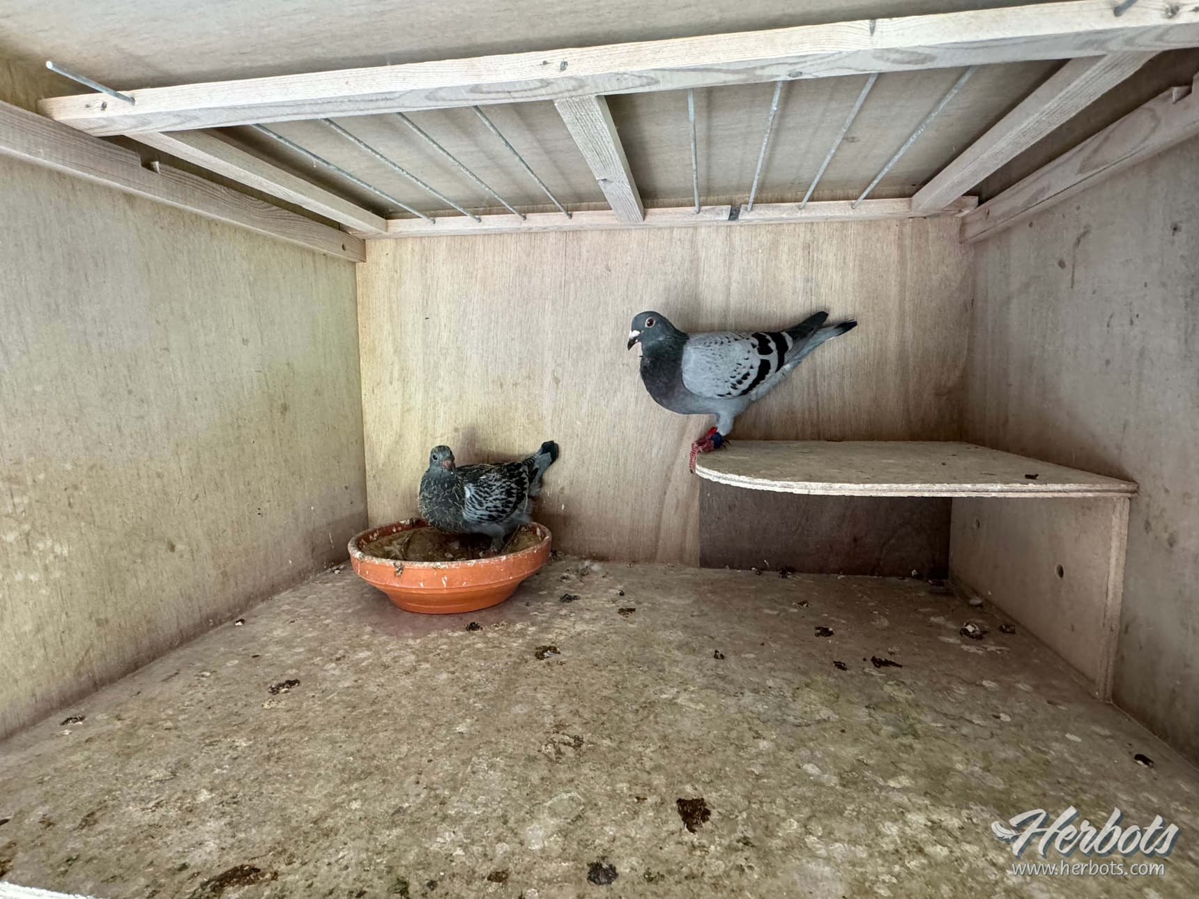 Les femelles sont dans un colombier d'élevage avec une petite volière devant le colombier. Ces poules ont d'abord été jouées au veuvage et maintenant au nid vers la fin de la saison. Au début, les boxes d'élevage sont fermés et des chapelles sont placées pour les boxes d'habitation durant la semaine. Ce n'est que le jour de l'enlogement que le partenaire est présenté et prêt. C'est simple, mais Wilfried n'a peut-être pas eu le jeu de poule sous sa surveillance depuis longtemps, mais un pigeon ne sait que trop bien pourquoi il doit rentrer chez lui.