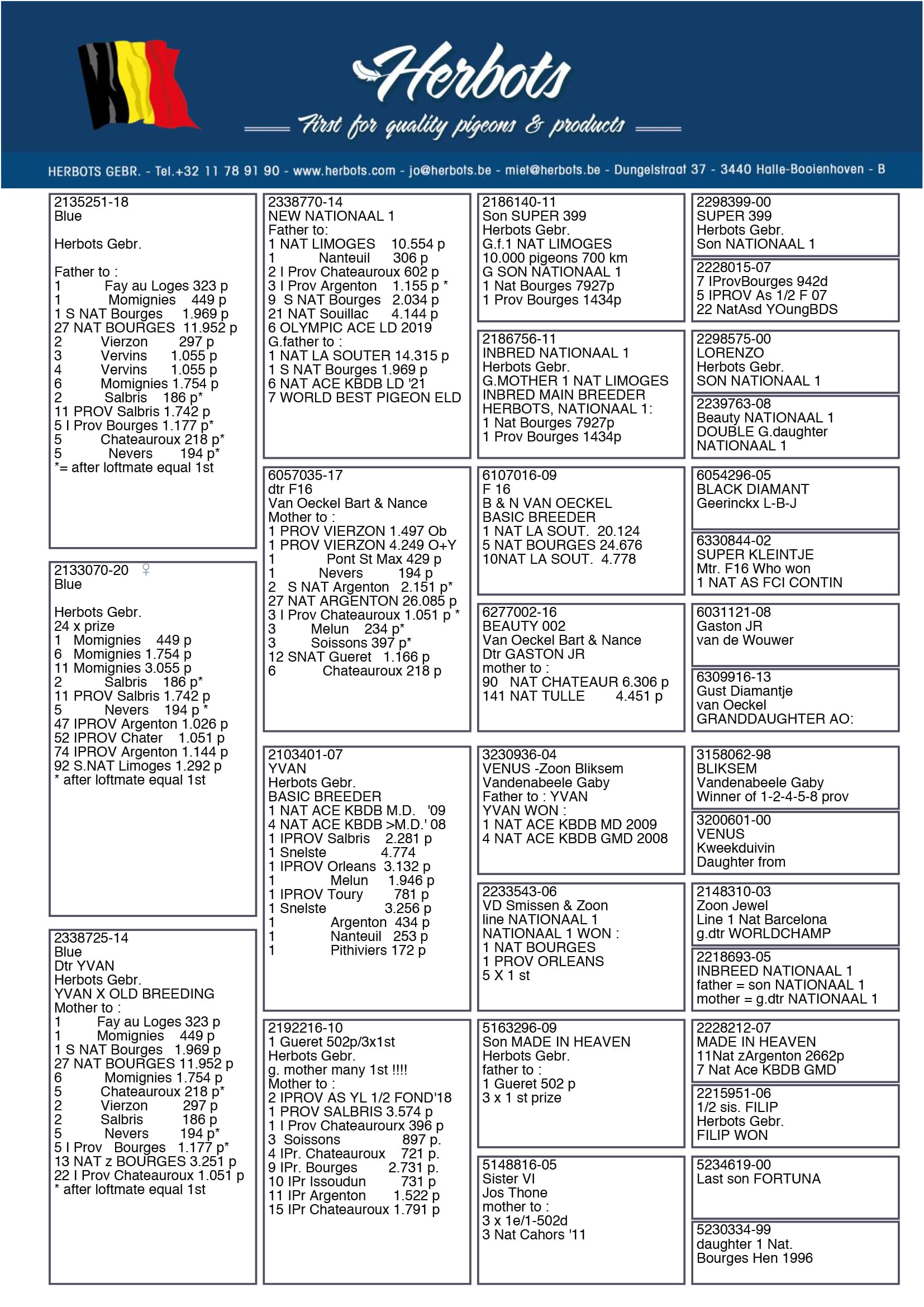 Bonjour, je viens vous donner des nouvelles d'un jeune de la femelle N° 2133070-20 que vous m'avez offerte viens de faire 2ème union sur 1080 pigeons sur Vendeuil 152km .Un grand merci à vous pour ce cadeau .Amitiés colombophiles