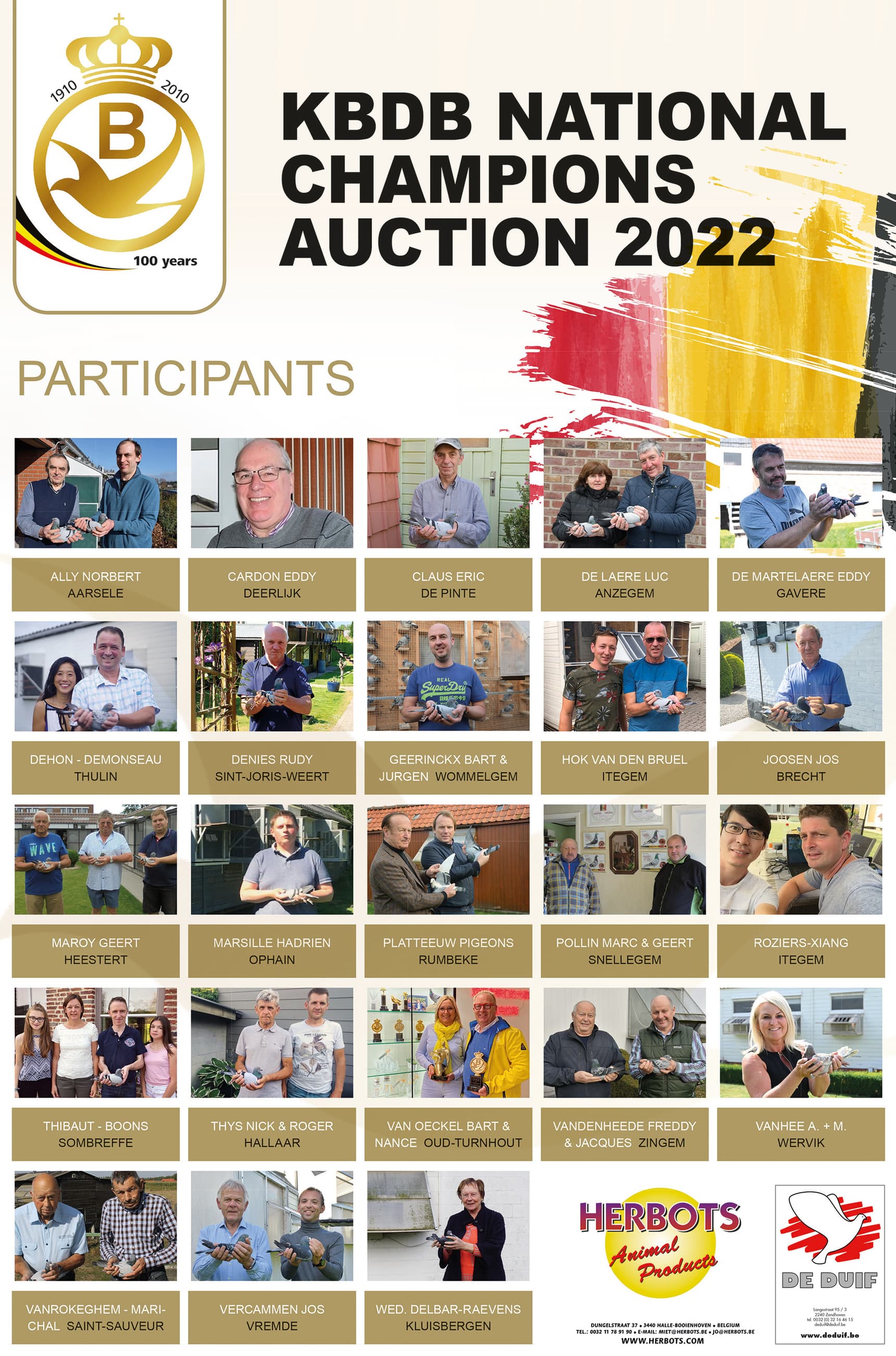 In navolging van de National Champions Auctions 2019 & 2020/2021, zal opnieuw, in het kader van de nationale dagen 2022, een veiling worden georganiseerd. Als teken van steun aan de KBDB en de Nationale Dagen hebben onze nationale kampioenen 2022 het beste van het beste uit hun kolonie getoverd.