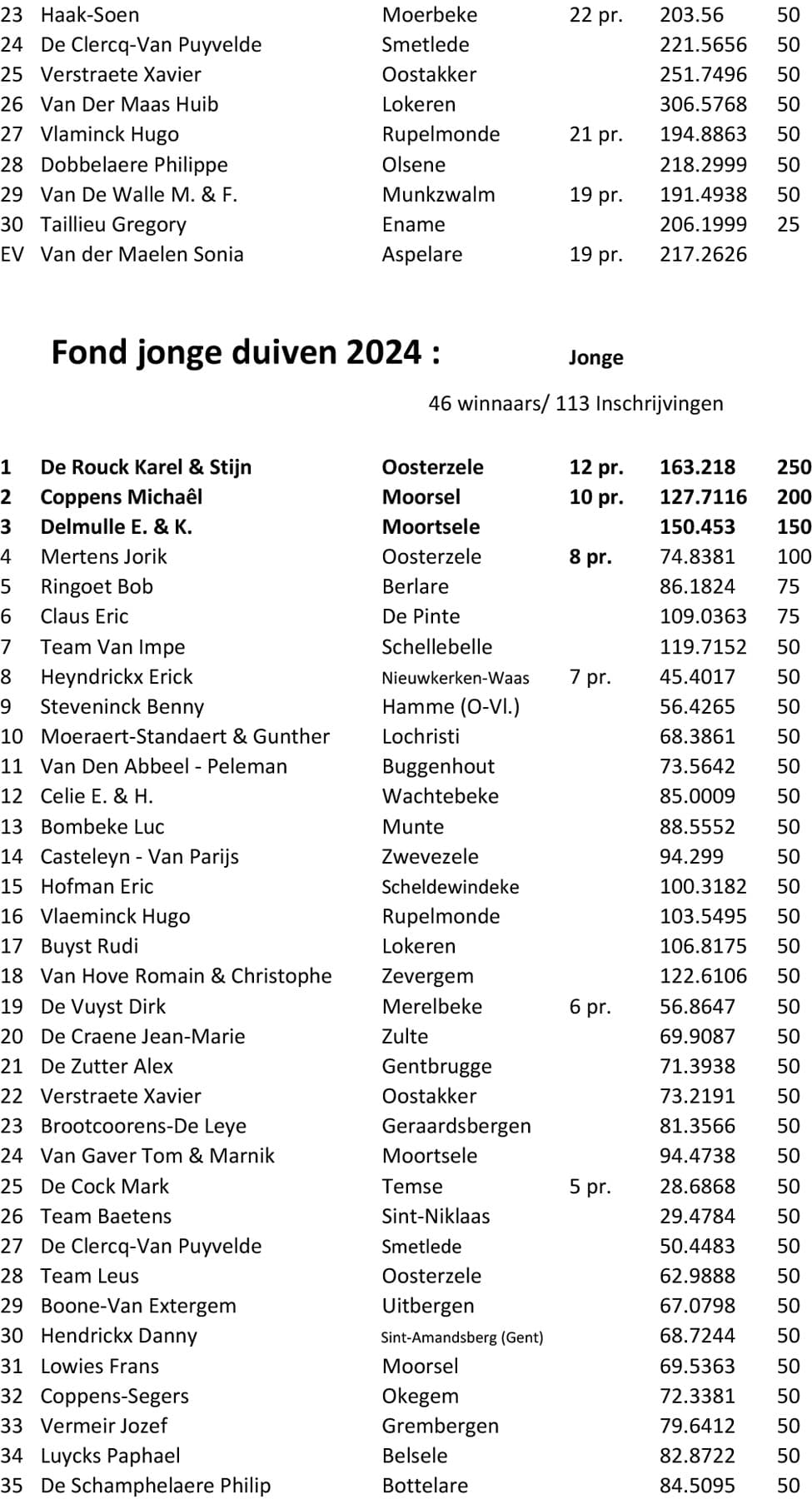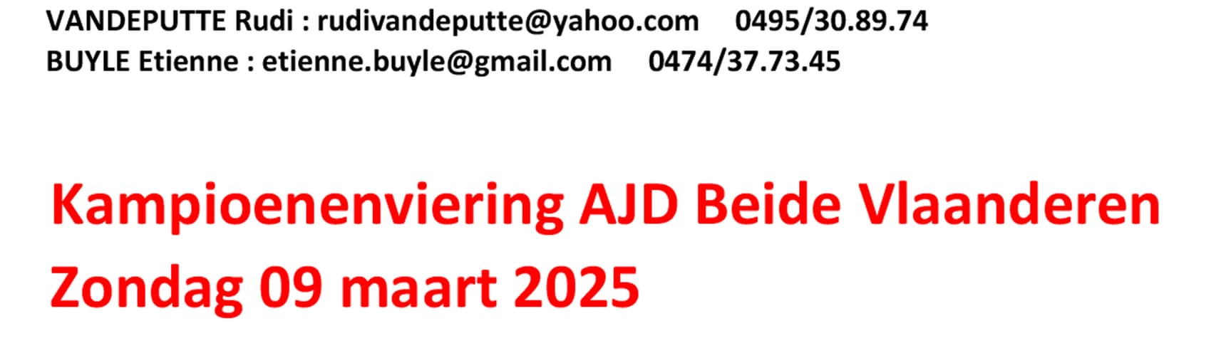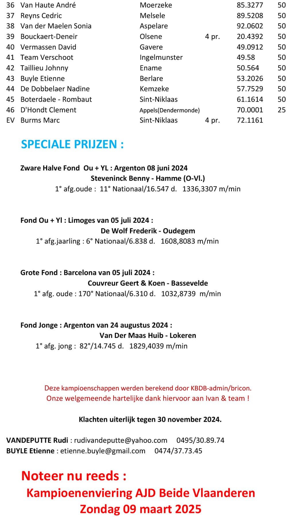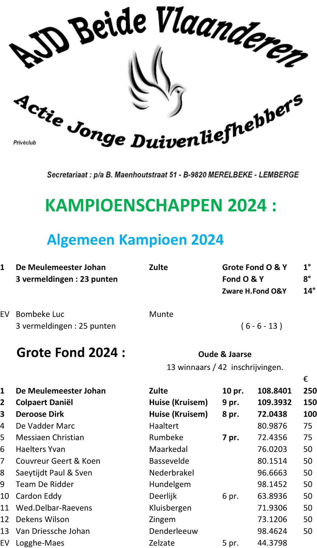 ajd beide vlaanderen : voorlopige uitslagen kampioenschappen, bonvluchten edm.