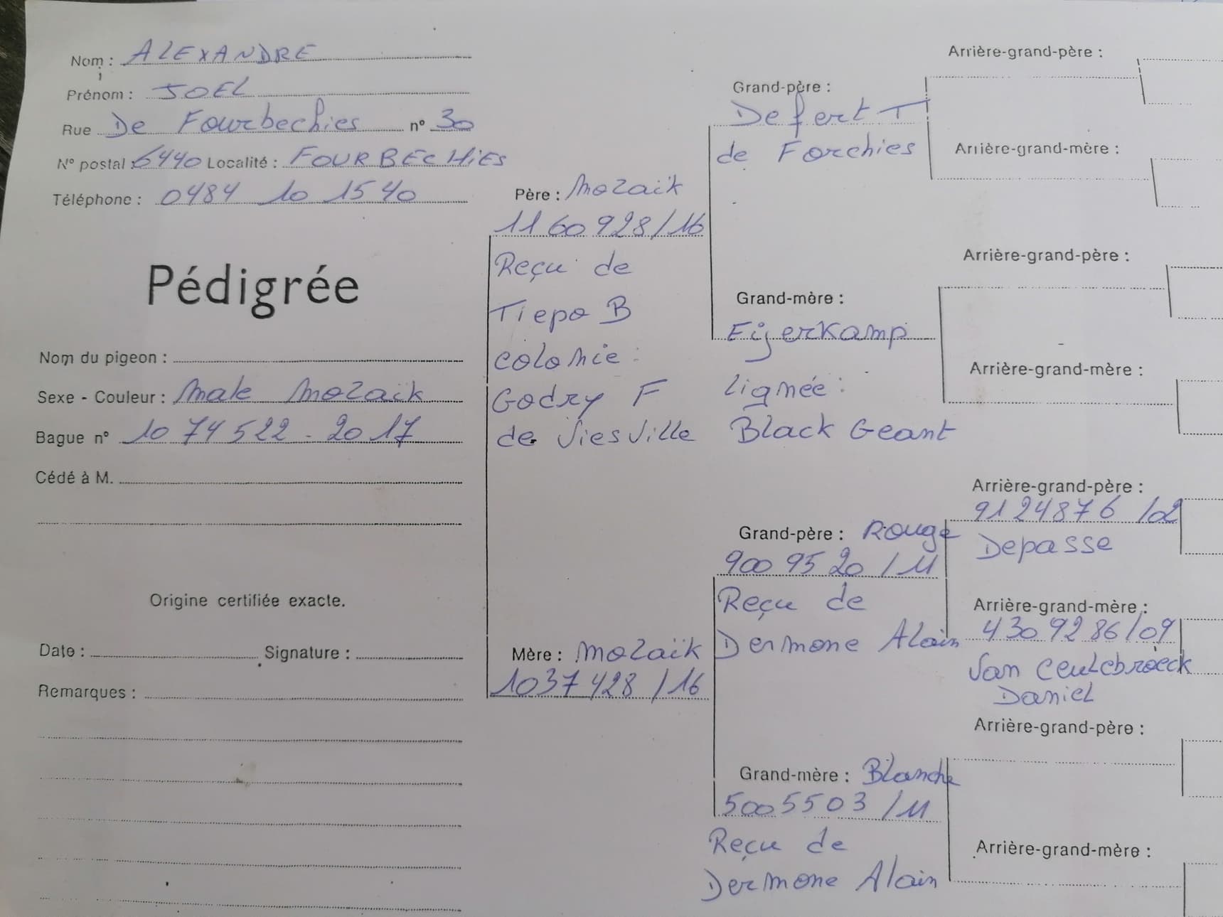 Fourbechies: Eerlijk gezegd we dienden eerst nog eens snel op Google Maps te kijken om te weten welke richting we dienden te rijden om de nationale winnaar Aurillac te gaan bezoeken. Fourbechies ligt namelijk in de schaduw van het beter gekende Froidchapelle en daar in dat rustige Henegouws dorpje werd afgelopen WE door de mozaïek kleurige duiver B17-1074522 een unieke prestatie op papier gezet. Hij werd door zijn baasje als enige richting Aurillac gestuurd en hij ontgoochelde niet. Alexandre vertelt: “Aangezien de rui al ver gevorderd was had ik mijn 8 overgebleven weduwnaars verdeeld over Aurillac en Perpignan. De verdeling was wat ongelijk…1 naar Aurillac en de andere naar Perpignan. Op de dag van inkorving had ik alle weduwnaars hun duivin getoond en in plaats van mijn “522” zijn duivin weg te nemen liet ik ze gedurende 3 dagen bij hem. Vanuit de paardestal werd een handvol stro genomen en op de grond van het hok gesmeten. De “522” mocht doen wat hij wou en sleurde elke strohalm van de vloer naar zijn woonbak… blijkbaar heeft hij hier de motivatie gevonden om het hele peloton van 5.853 Aurillac vliegers zijn staart te laten zien.