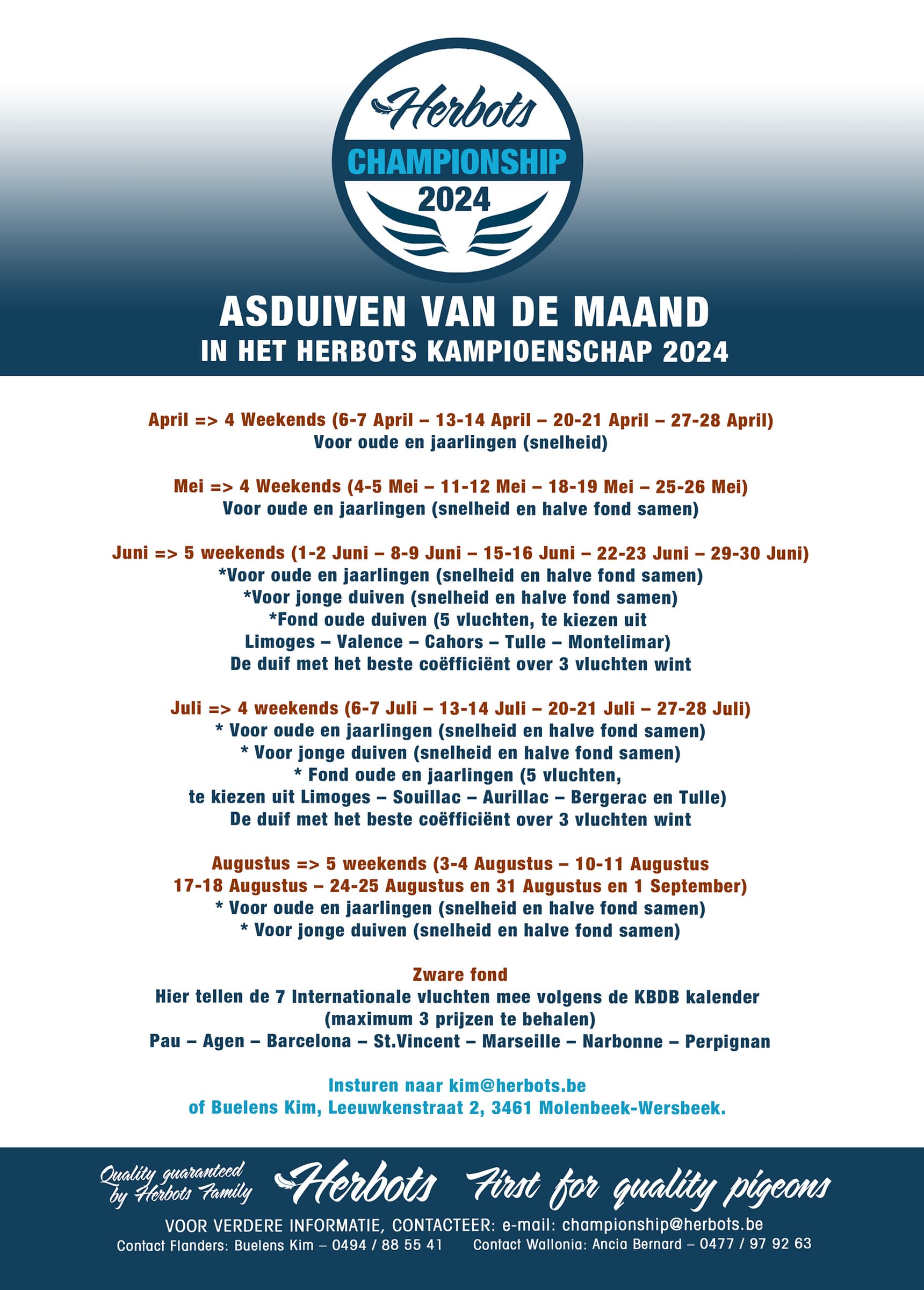 De winnaars van de maand worden gratis uitgenodigd op onze kampioenenviering van het Herbots Kampioenschap en krijgt een reportage van hun asduif samen met de eerste 3 laureaten op onze website www.herbots.be