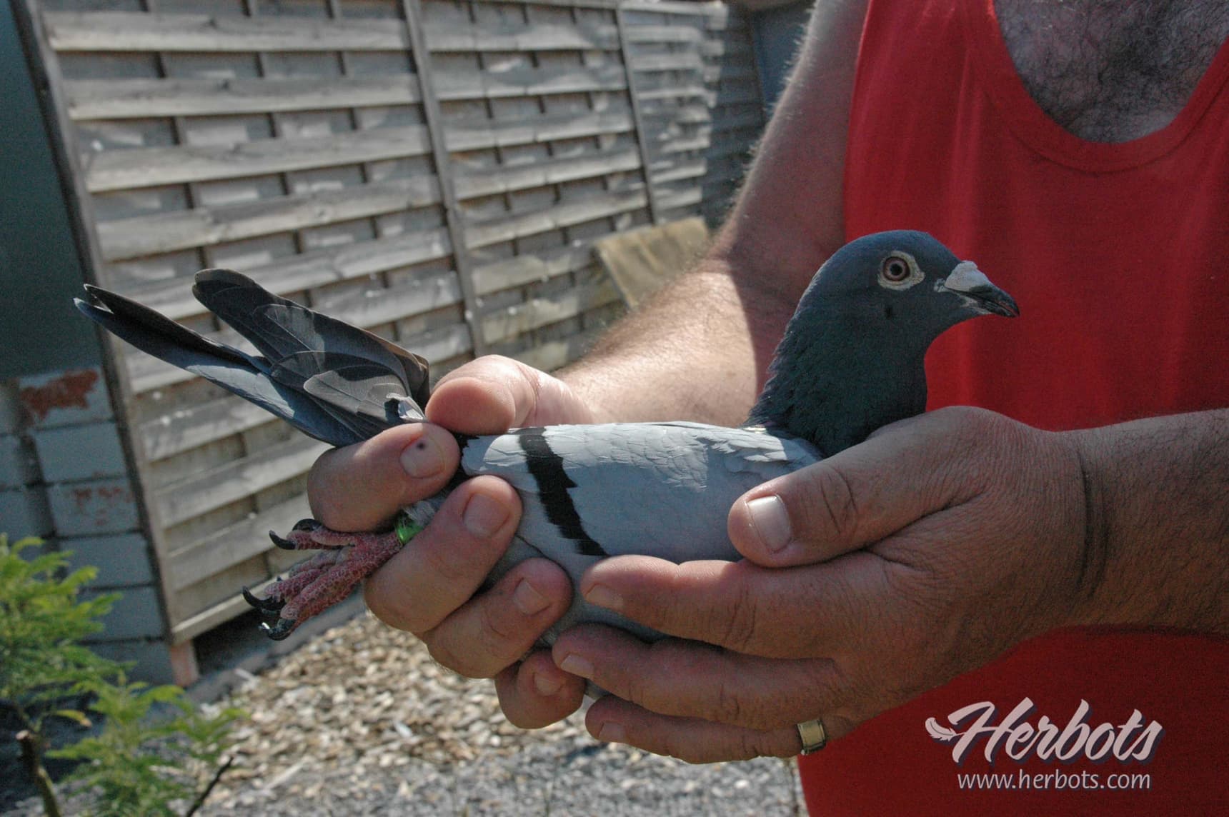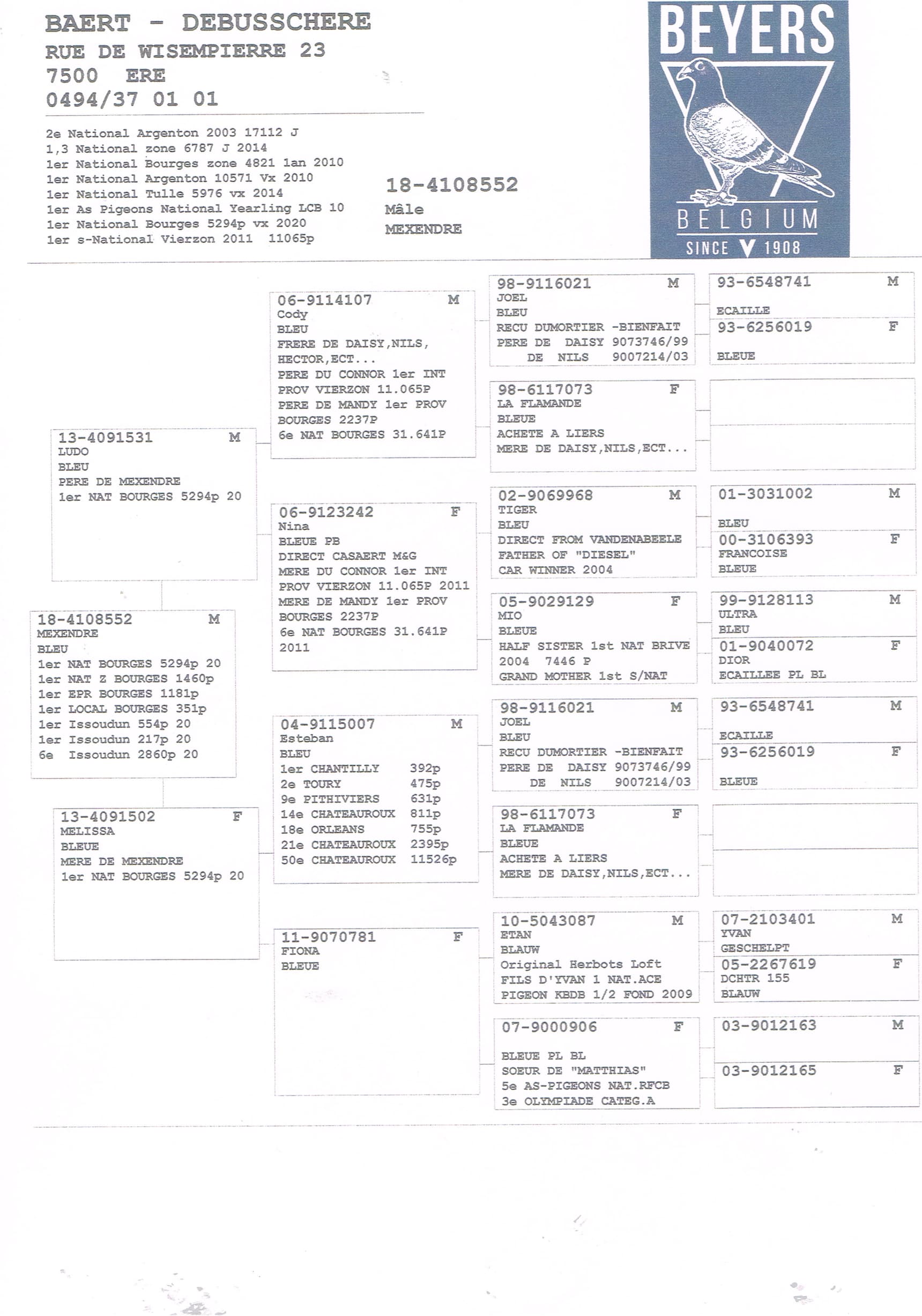 En dan nu… afgelopen WE… tijdens een van de warmste dagen van het jaar is het blauwe duiver “Mexendre” (B18-4108552) die alle 5.436 oude Bourgesvliegers het nakijken gaf. “Mexendre” stamt uit de goede oude kweeklijnen van Damien en dan spreken we over het superieure basis koppel “Joël” x “La Flamande”. “Joël” (B98-9116021) x “La Flamande” (B98-6117073 – gekocht op Lier markt) deden toentertijd de prestaties van de Baert kolonie de hoogte inschieten. Zij werden ouders van toppers zoals “Daisy” (1e Bourges 1.427d.) – “Nils” (1e Chateauroux 2.516d. – 1e La Souterraine 3.842d. – 1e Bourges 2.050d.) – “Hector” (1e Bourges 1.090d.) – “Ines” (1e La Souterraine 5.184d.) – “Harry” (3 x 1e) enzovoort. En ook nu hebben ze een groot aandeel in de genen van de nationale Bourges winnaar want “Mexendre” is een dubbele kleinzoon van hen, dit gekruid met duiven van Herbots Gebr. (lijn “Yvan” en “155”) en Maurice Casaert (grootmoeder “Nina” is o.a. moeder van 1e interprov. Vierzon 11.065d. en 6e Nat. Bourges 31.641d.)