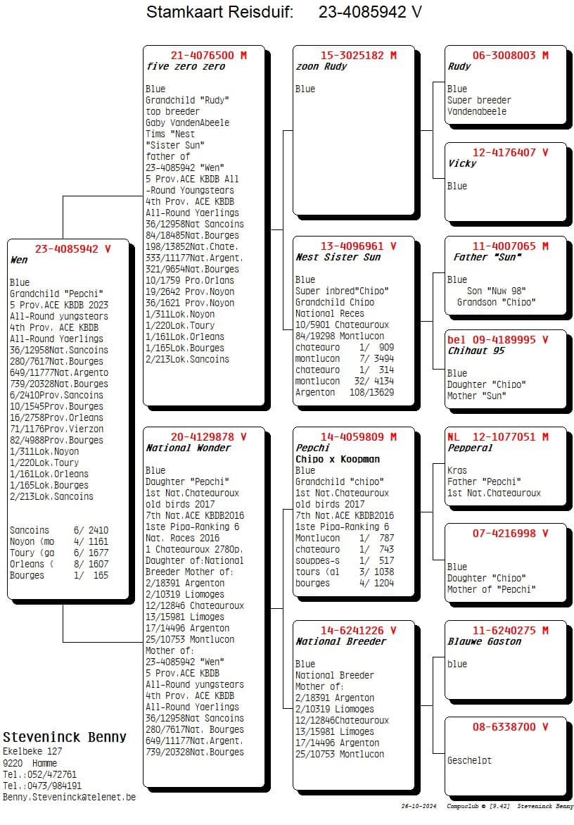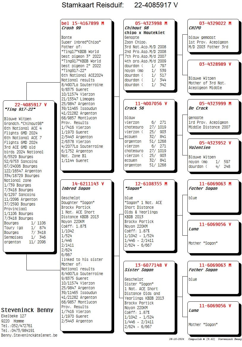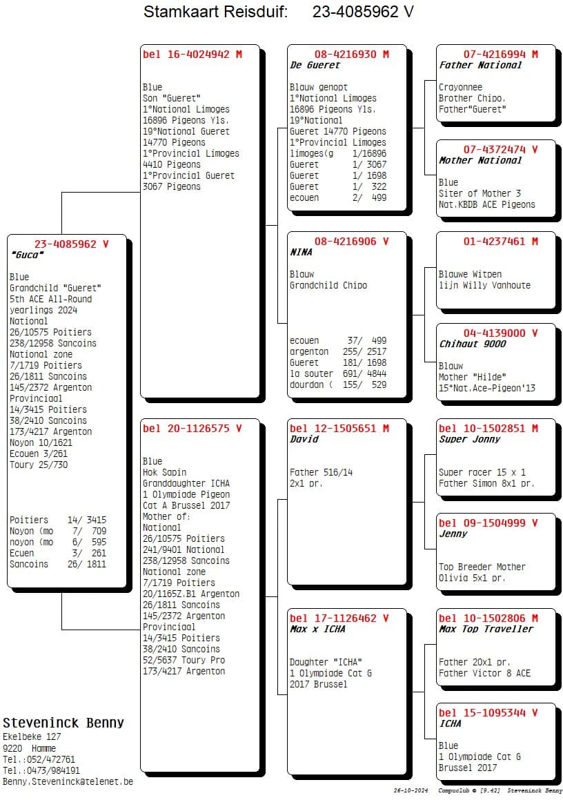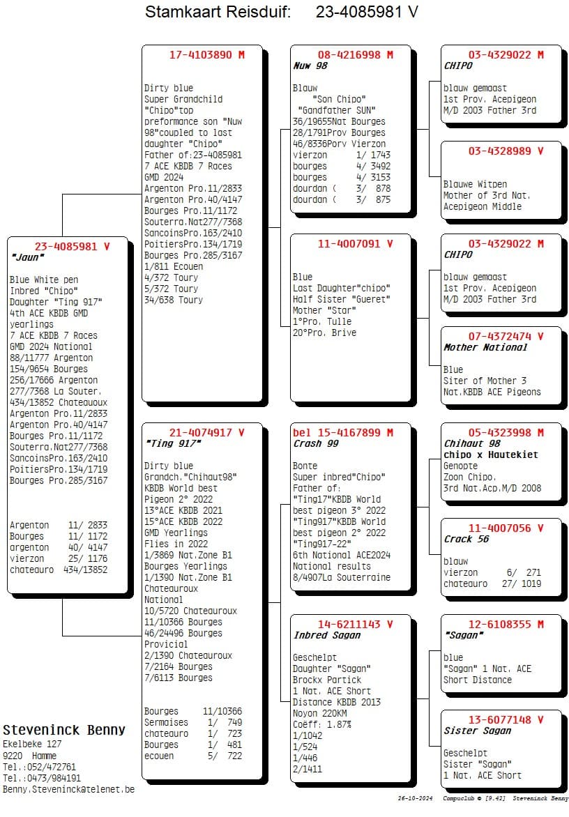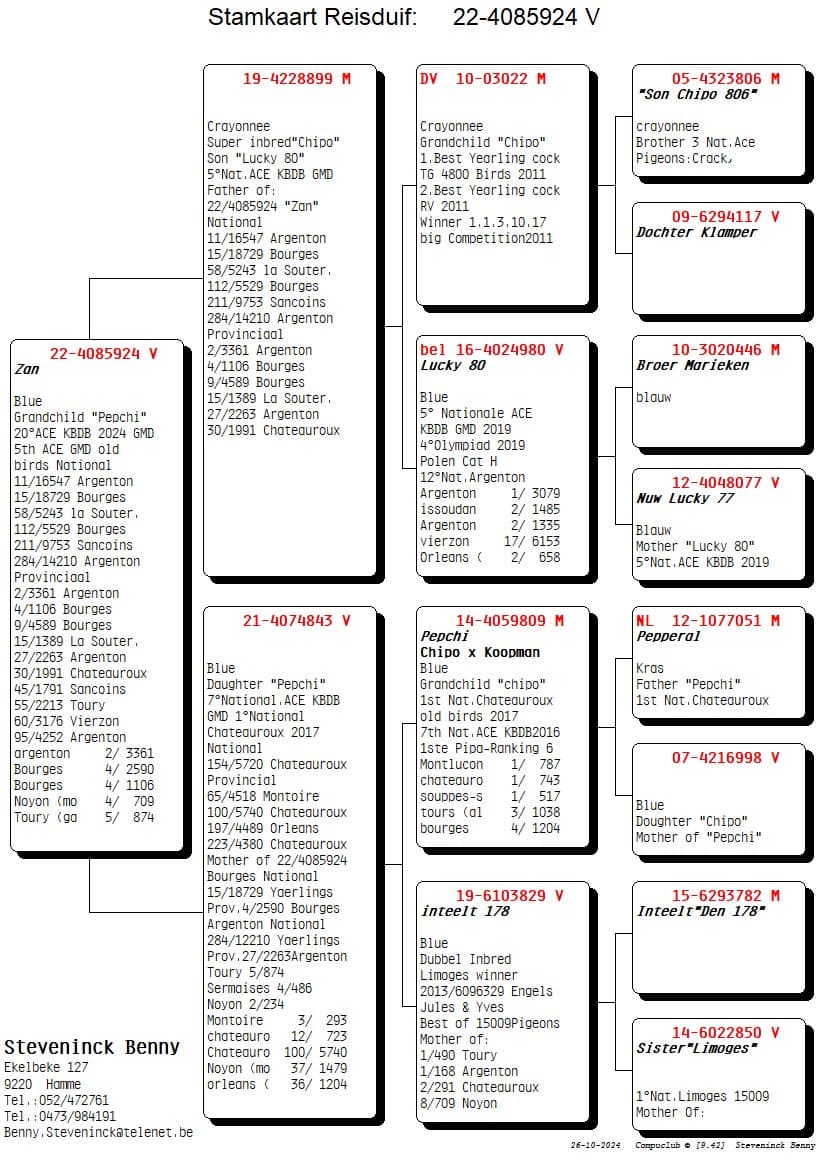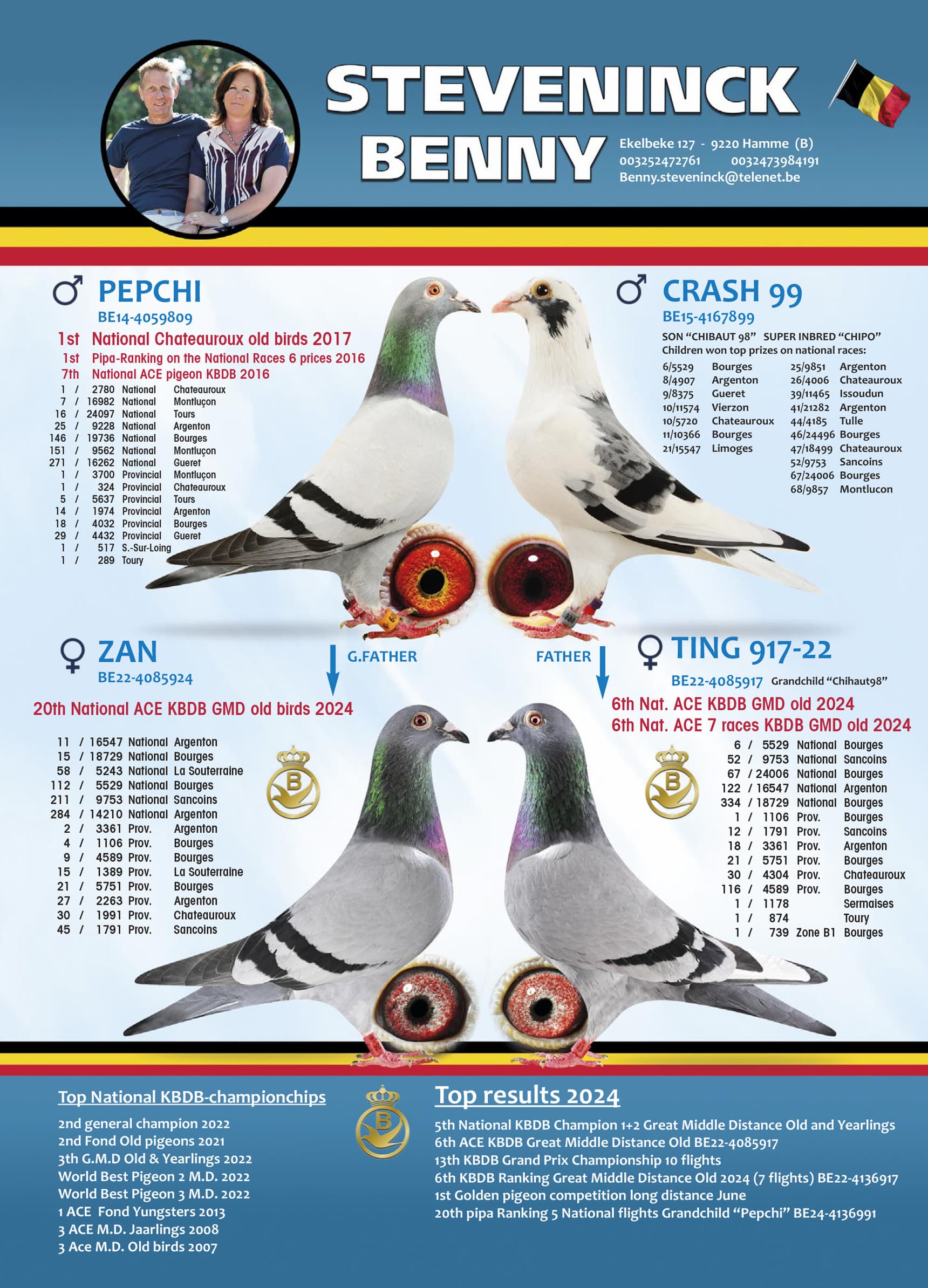 Benny gaat , als hij zijn kweekkoppels samenstelt, zeker en vast niet ondoordacht te werk. Er zit duidelijk een strakke en weldoordachte “taktiek” achter zijn kweekstrategie. Alles begint en staat met stambeer “Chipo”, een duiver welke in 2003 het levenslicht zag. Deze fantastische gemaasde duiver won als jonge duif 1ste Dourdan 571 d.,1ste Dourdan 375d., 2de Dourdan 1.316d., 9de Dourdan 1.268d., 9de Dourdan 339d., 10de Dourdan 964d. enz… en schopte het tot 1ste Provinciale Asduif Oost-Vlaanderen. Deze topper stamt langs vaderszijde uit een duif van Sylvain Verstraete x een dochter uit 1ste Nat. La Souterraine (Eddy Leutenez)... langs moederszijde uit een duif van Jozef Vandamme- Dendermonde. Ook als jaarse duif etaleerde hij zijn klasse! Zo won hij o.a. 1ste Dourdan 614d., 1ste Dourdan 213d., 1ste Dourdan 101d., 41ste Bourges 2306d., 17de Dourdan 848d., 14de Dourdan 425d., 24ste Dourdan 555d., enz. Iedere normale liefhebber zou deze topper na twee succesvolle jaren meteen naar het kweekhok sturen, maar dat is buiten de redenering van Benny gerekend. We schrijven het jaar 2005 en de “Chipo” liet opnieuw van zich horen: 3de Dourdan 217d., 7de Toury 427d., 5de Dourdan 194d., 9de Noyon 199d., enz. Ondertussen bleek dat ook zijn zonen eveneens ereprijzen begonnen te vliegen. Meermaals waren ze al voor hun vader thuis en daarom besloot Benny om de “Chipo” definitief een bak op het kweekhok toe te wijzen. Gekoppeld tegen B03-4328989 (een zuivere Michel Hautekiet- duivin) kweekten ze in meerdere generaties duiven die toch zo graag in de top van de uitslag vliegen.