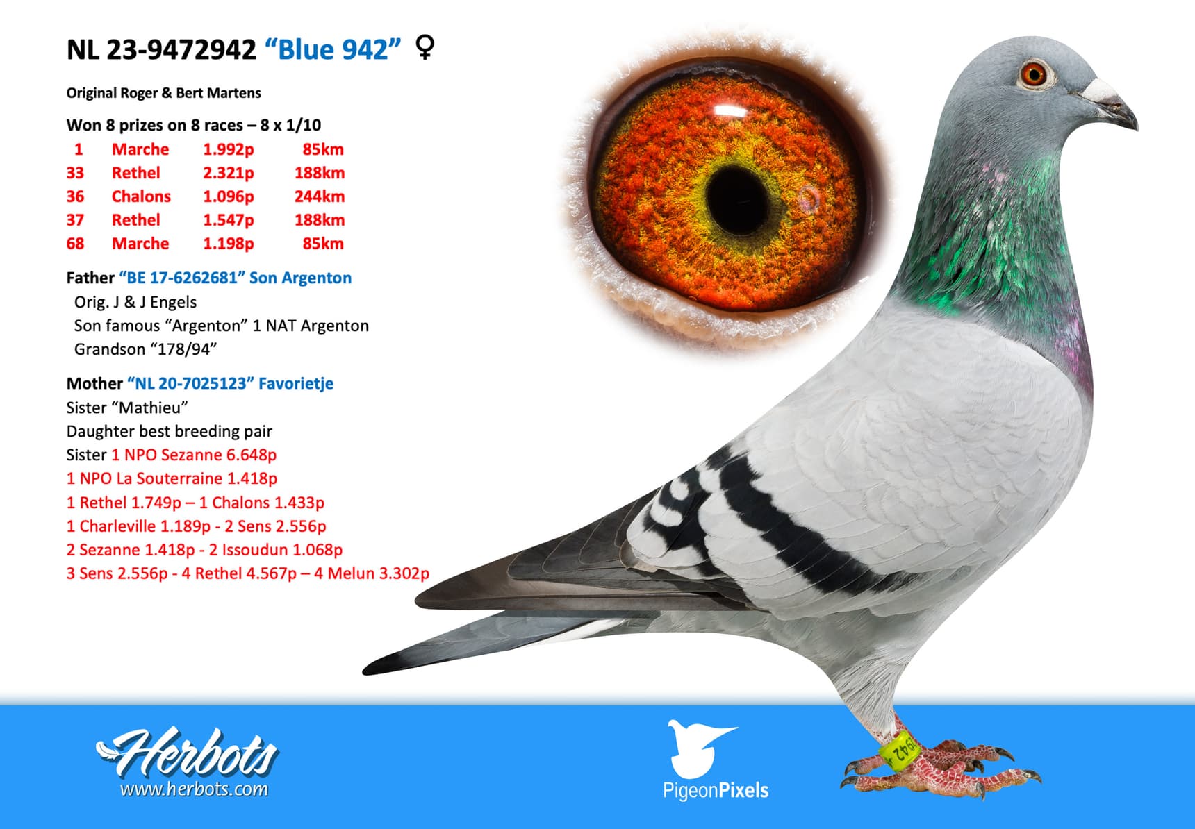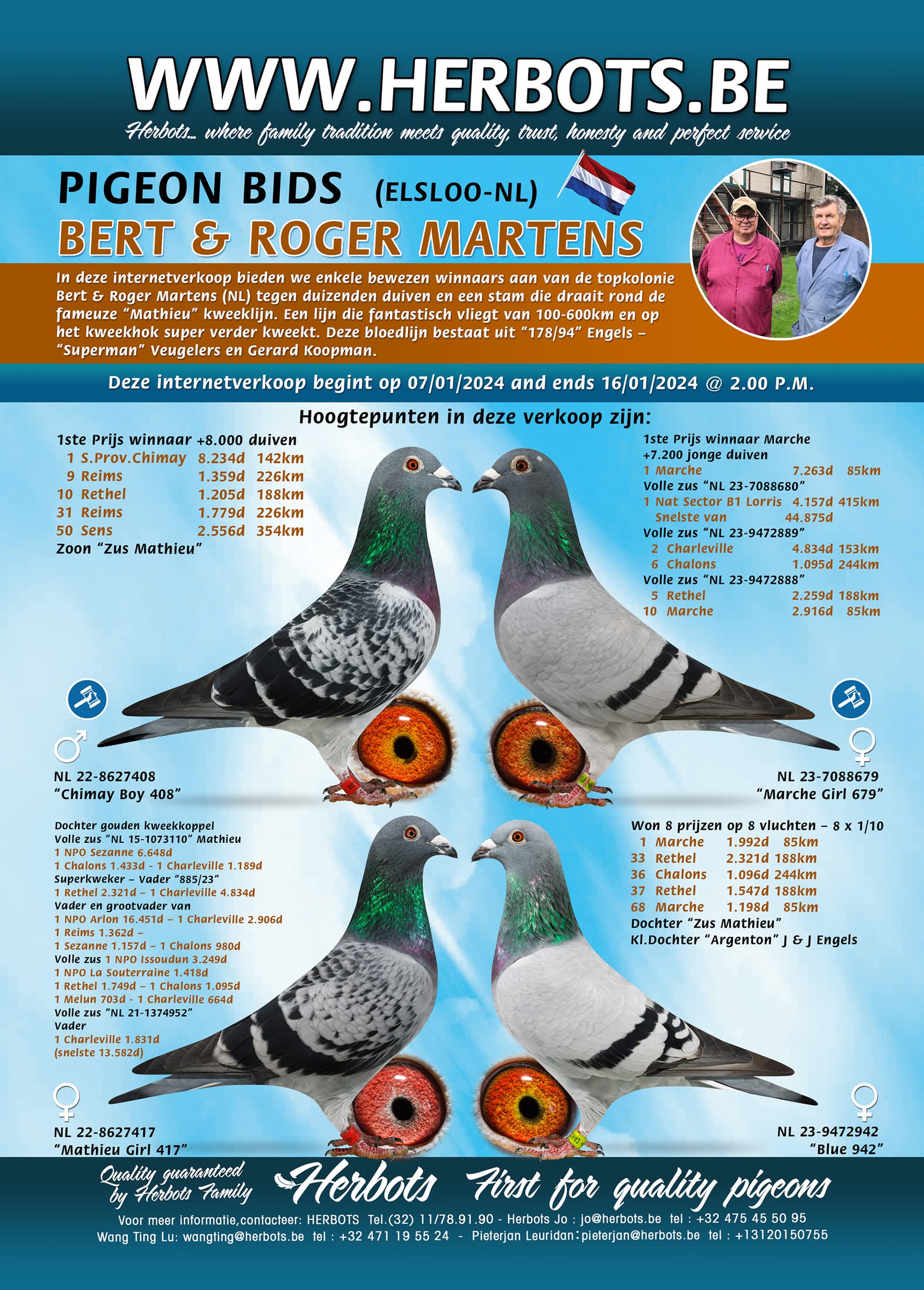 De vliegploeg Bert & Roger Martens uit het Nederlandse Elsloo was het voorbije seizoen heel constant en met meerdere eerste prijzen tegen veel duiven hebben ze een topseizoen achter de rug. De reeks 1ste prijzen zijn bijna niet meer bij te houden en de geweldige reeksen die ze neerzetten zijn echt fantastisch, dat belooft alvast voor hun vliegploeg van de jaarlingen voor aankomend seizoen. Vooral met de jonge duiven waren ze zeer sterk en op Lorris wonnen ze de 1ste Nat Sector B1 tegen 4.157 duiven, ze was tegen de snelste van 44.875 duiven. Haar nestzus won ook al de eerste op Marche tegen 7.200 duiven en ook 2 andere jonge duiven uit dit nieuw topkoppel presteerde zeer sterk en constant.