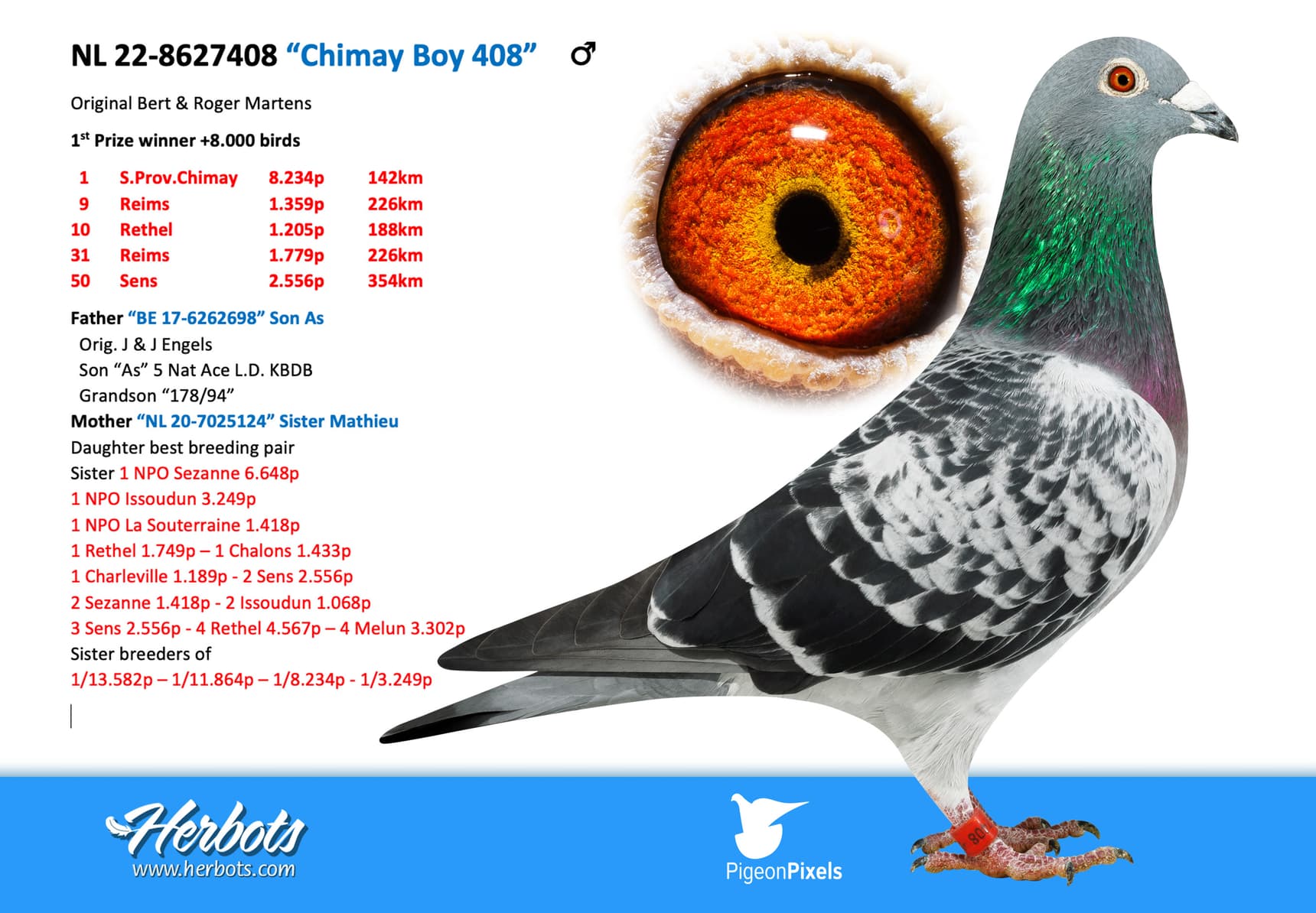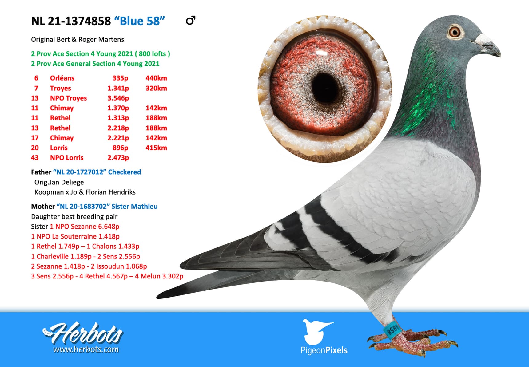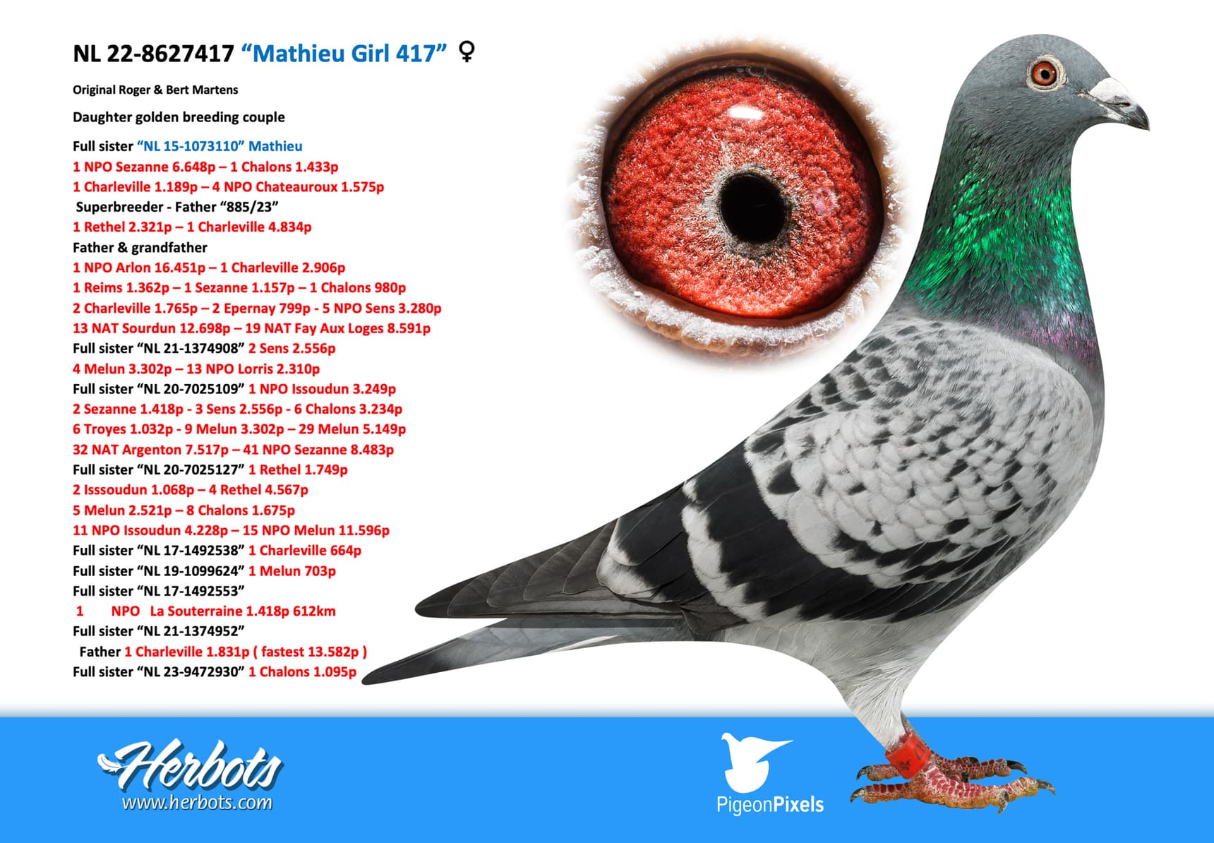De lijn van supervlieger “Mathieu” is hier ten huize Martens echt wel de rode draad door deze kolonie, NL 15-1073110 “Mathieu” was zelf een supervlieger met 1 NPO Sezanne 6.648d , 1 Chalons 1.433d, 1 Charleville 1.189d, 4 NPO Chateauroux 1.575d, 4 Sens 1.667d – 5 Marche 1.630d – 7 Charleville 1.671d