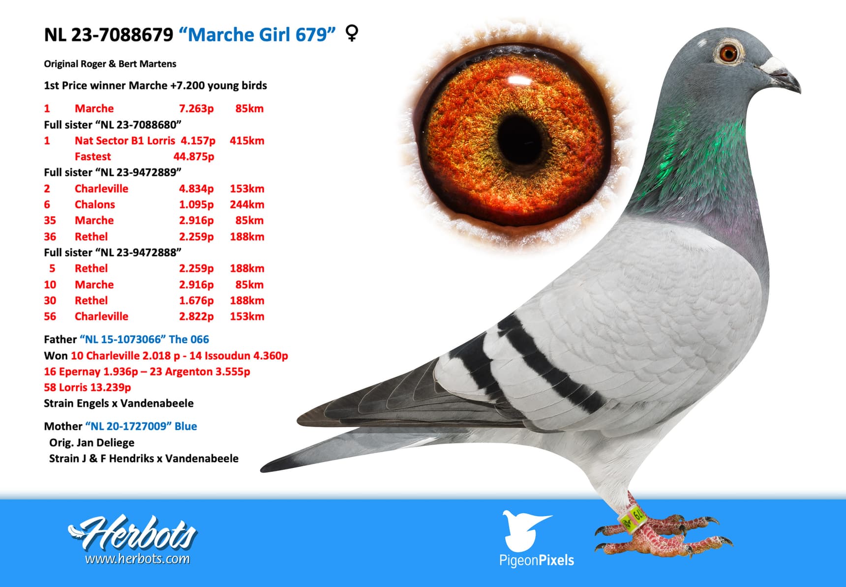 Zus “NL 23-9472889” 2 Charleville 1.938d ( 2de snelste van 4.834d na hokgenoot ) – 6 Chalons 1.095d - 29 Marche 1.992d – 35 Marche 2.916d – 36 Rethel 2.259d