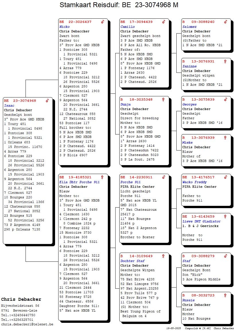 Met “Isaac” bezit Chris Debacker een topper uit de duizenden. Een kerel waarop je wekelijks mag rekenen, een crack die het werkelijk in de vleugels heeft om de concurrentie een mokerslag toe te dienen. “Isaac”, naast een ongelofelijke prestatie duif tevens een streling voor het oog.