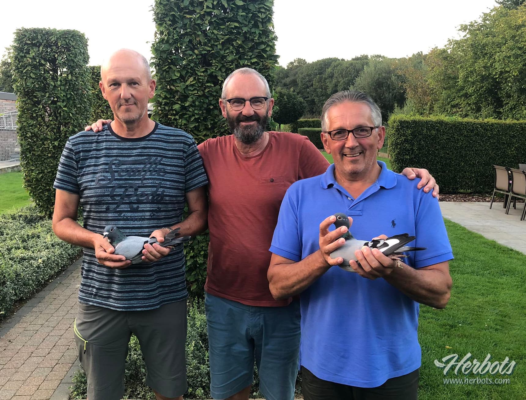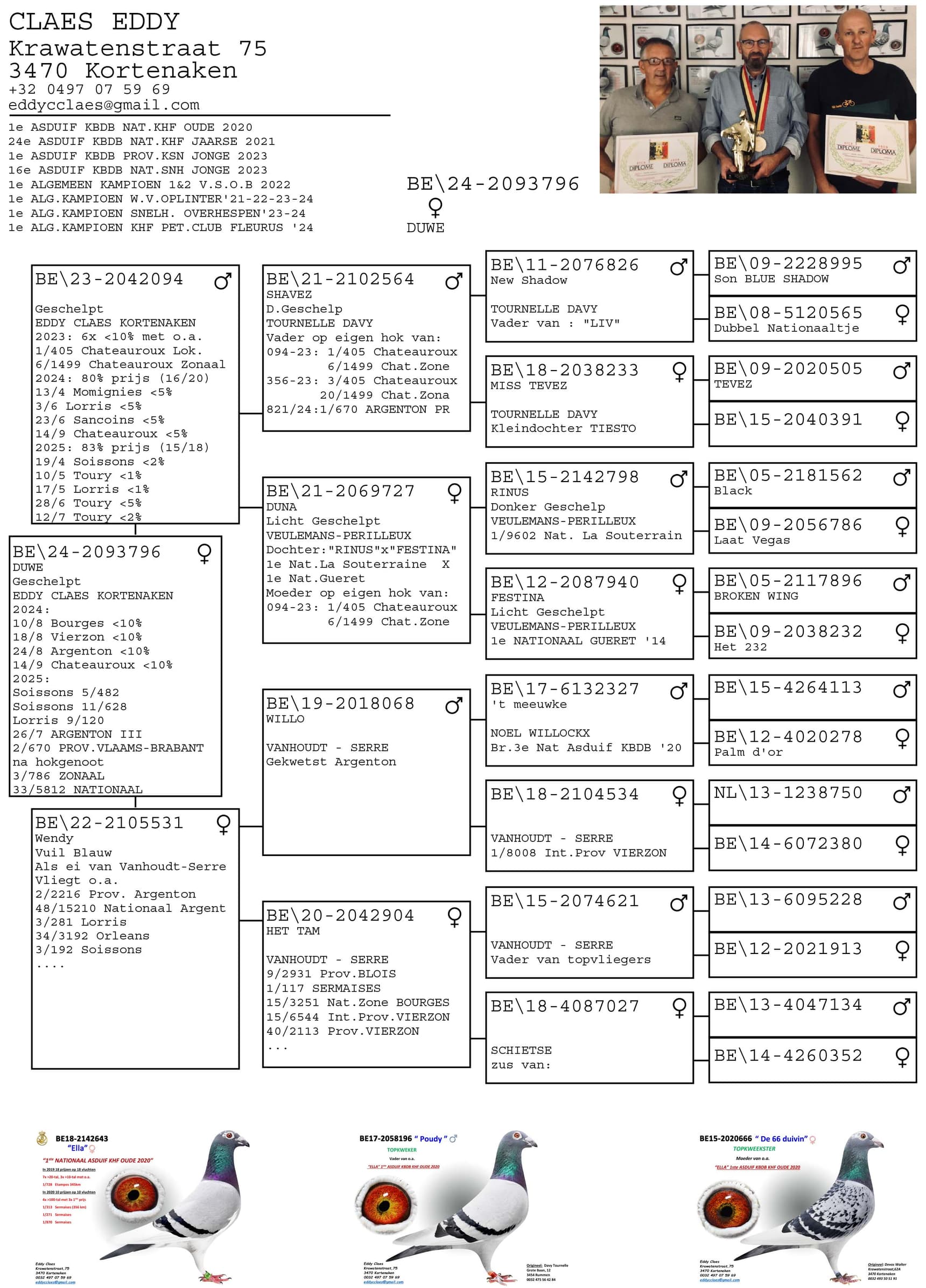 Op de nationale vlucht vanuit Argenton kwamen 2 duiven gelijk toe bij de kolonie van Eddy Claes in het Vlaams Brabantse Kortenaken. De 2 duiven werden geklokt en bij het binnengaan van het hok vlogen ze beide dezelfde bak in. Het waren dus duiver en duivin van hetzelfde koppel die elkaar dus onderweg zijn tegengekomen en zo samen naar huis zijn gevlogen. Het wordt nog meer een familie onderonsje omdat de vader van de 2de duif een volle broer is van de 1ste duif zelf. Dus dezelfde familie was algemeen op een hoog niveau in hetzelfde weekend.