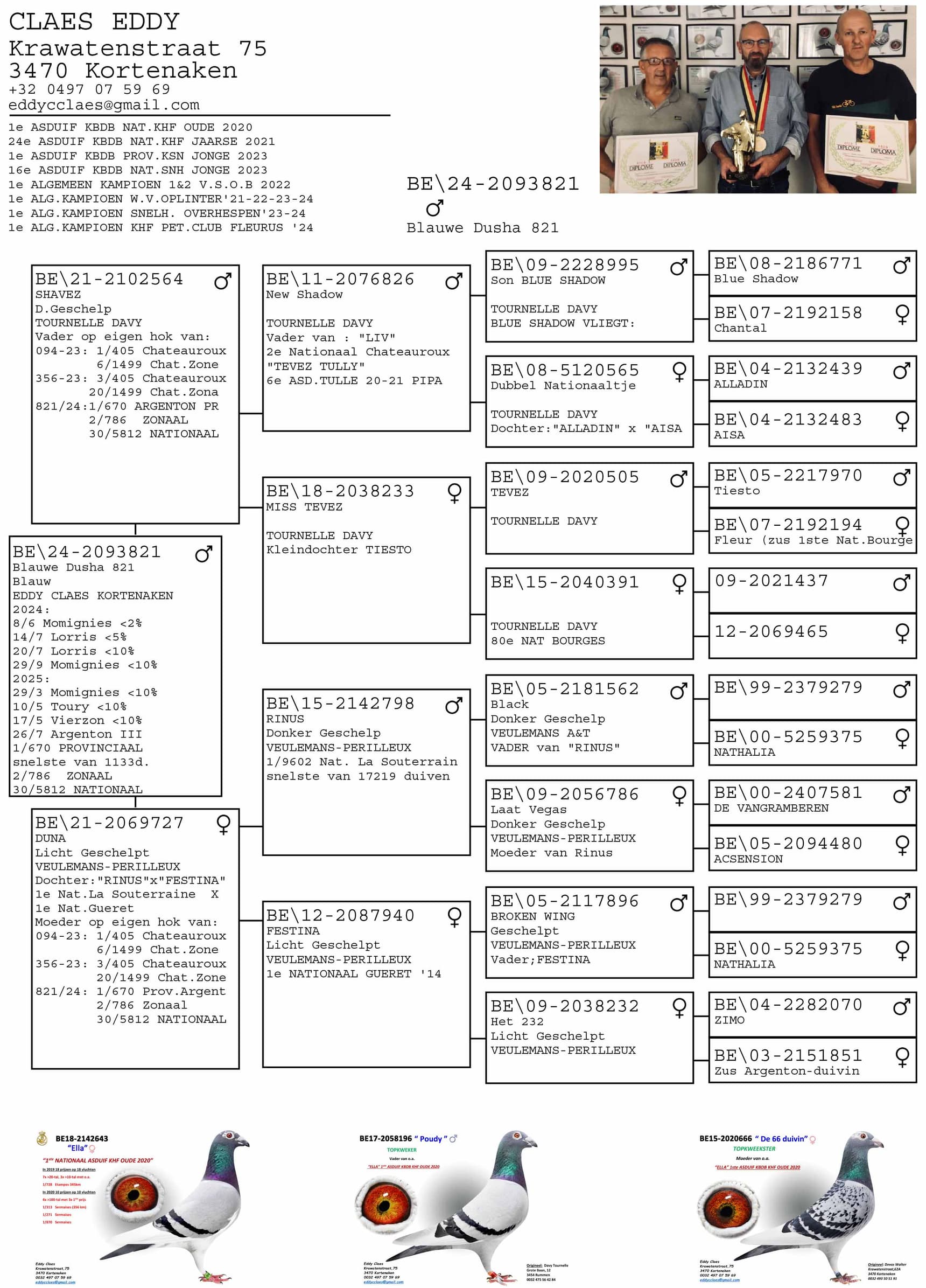 Zoon van “564/21” Shavez Davy Tournelle is kleinzoon Tevez x “727/21” Duna Veulemans – Perilleux is dochter van “Rinus” 1 Nat La Souterraine 9.602d x “Festina” 1 Nat Gueret 2.431d