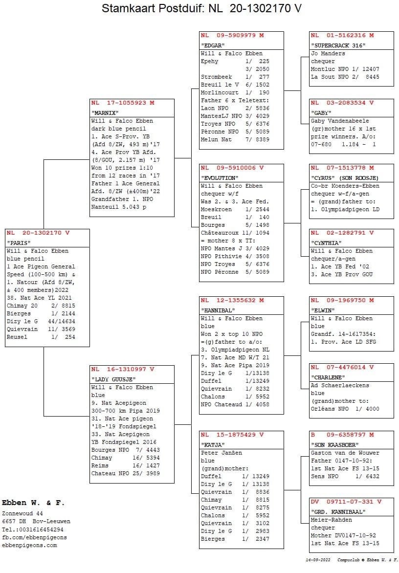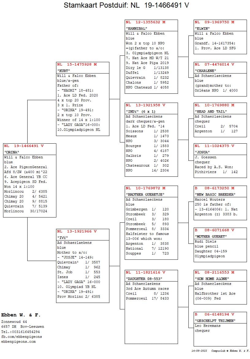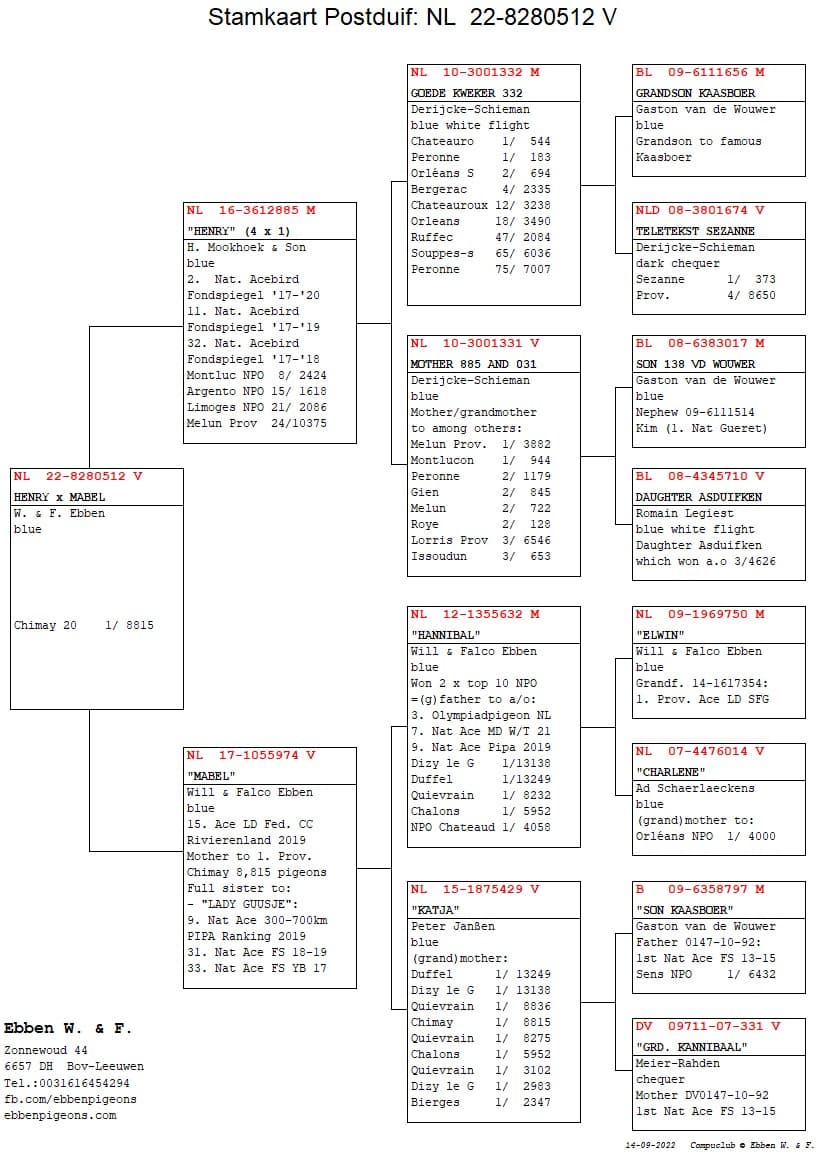 “Linus” (NL16-1310994) won zelf o.a. 1e Nat. Chateaudun 12.511d. – 4e Niergnies 12.624d. - 6e Niergnies 10.693d. en is de huidige stambeer ten huize Ebben.