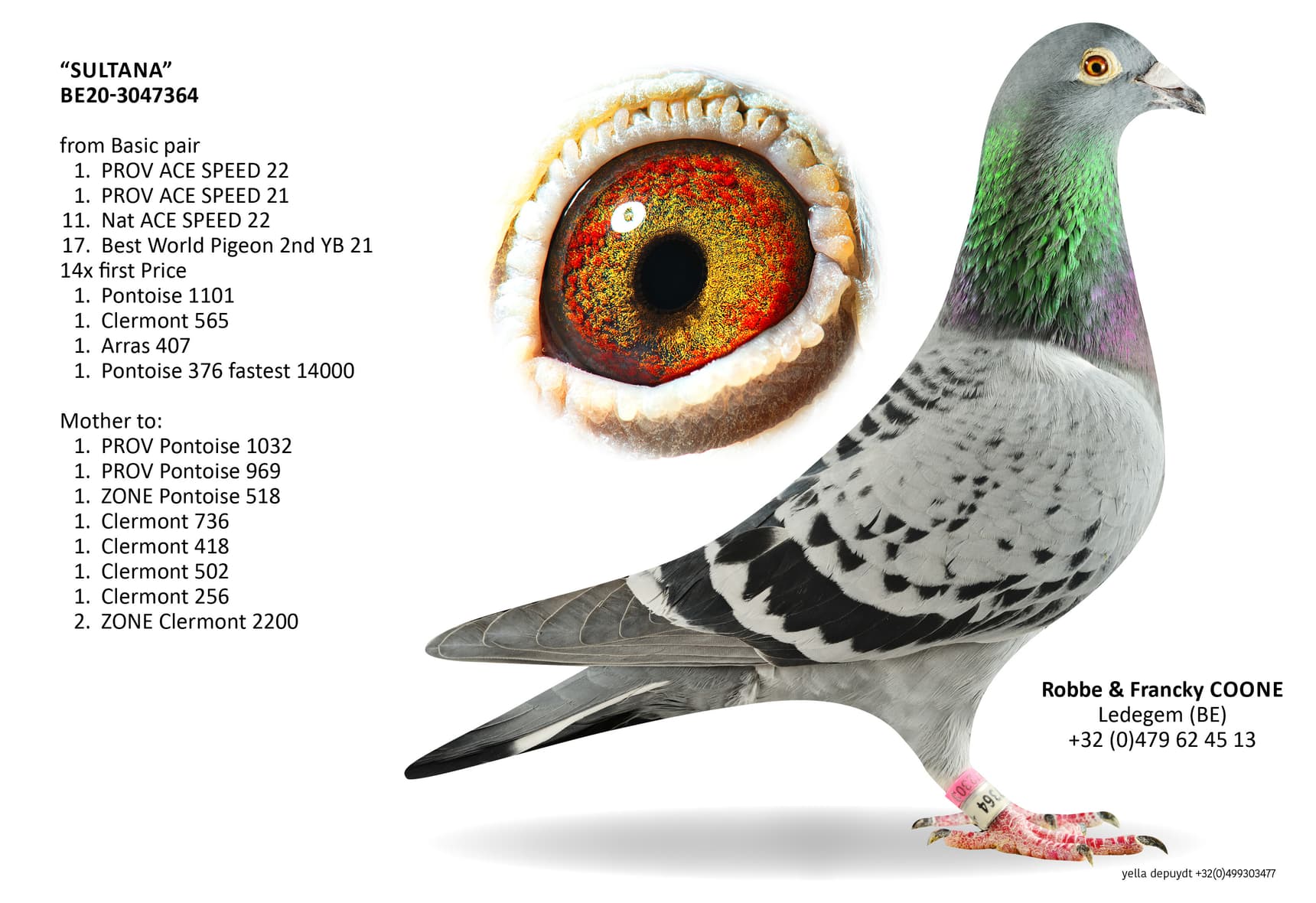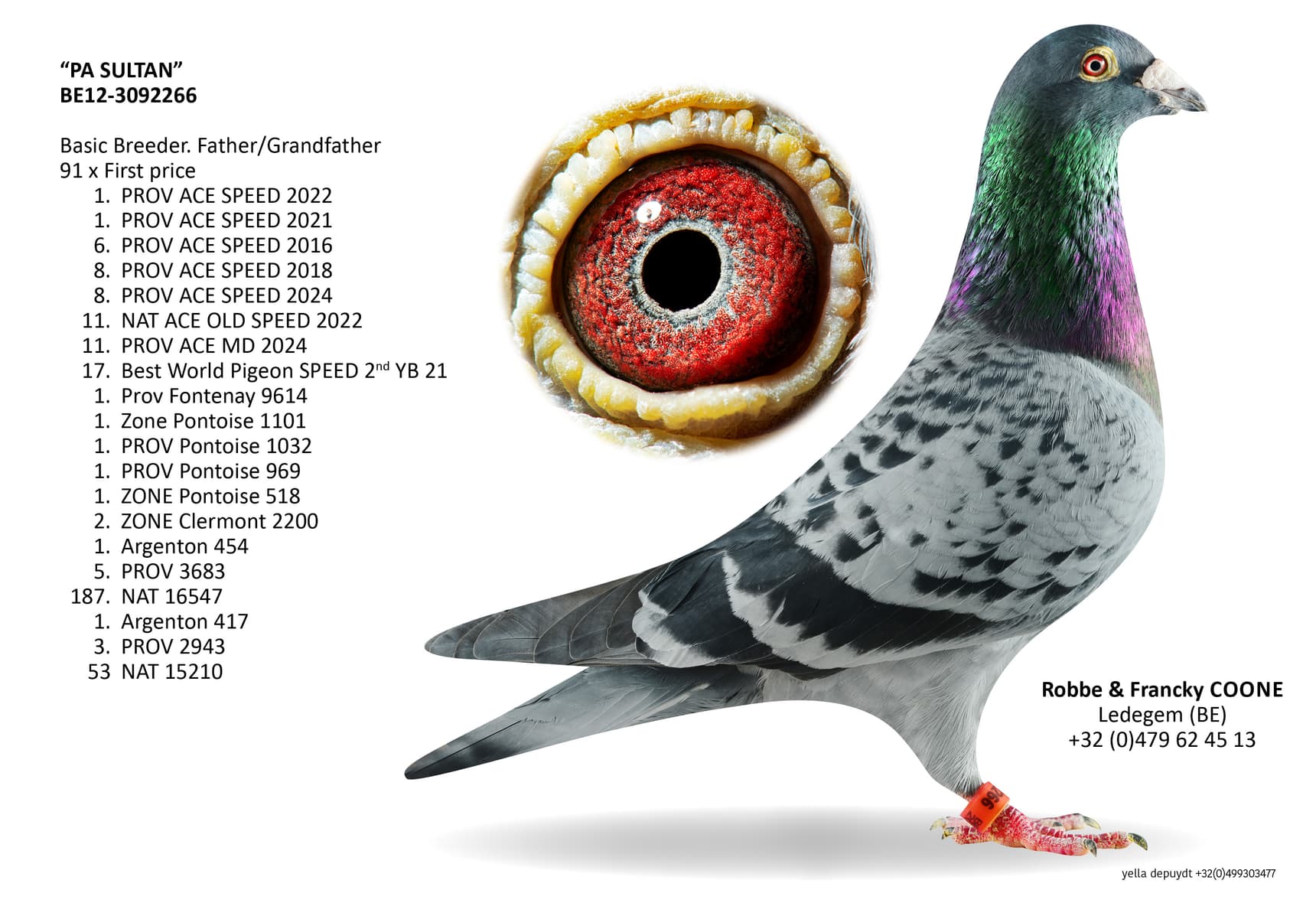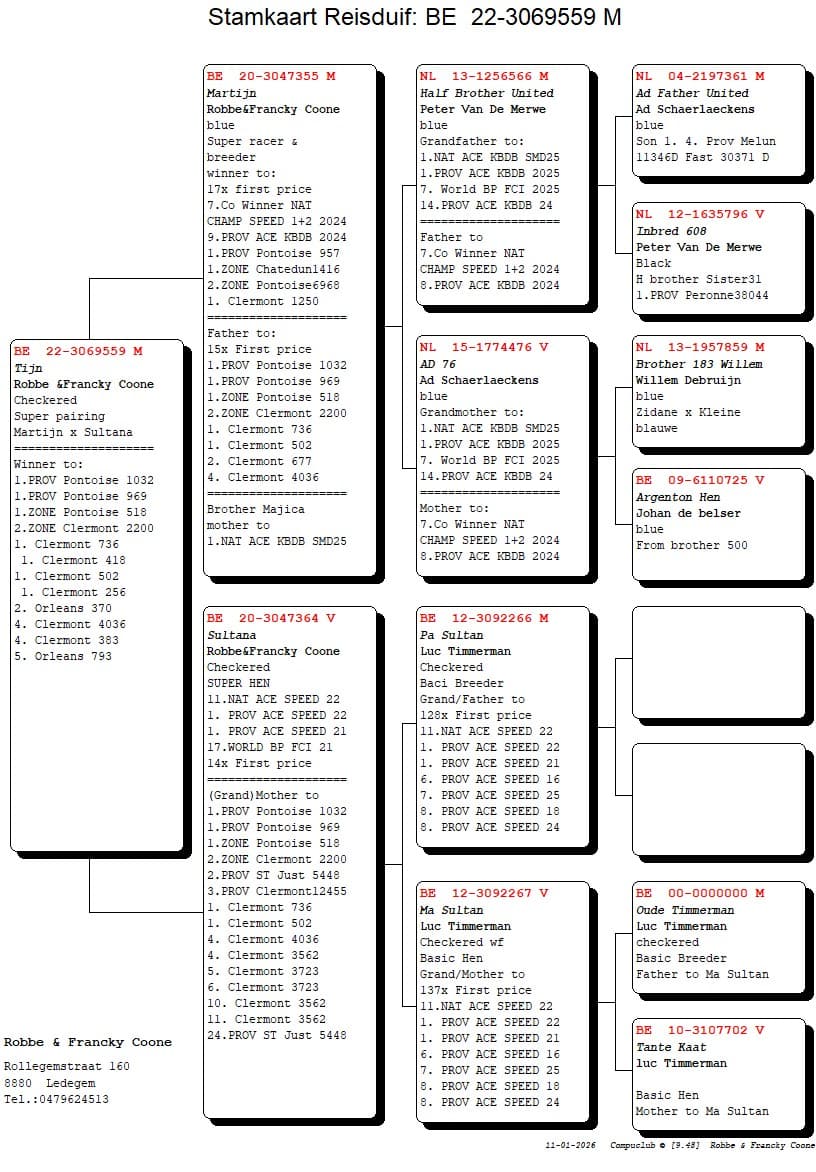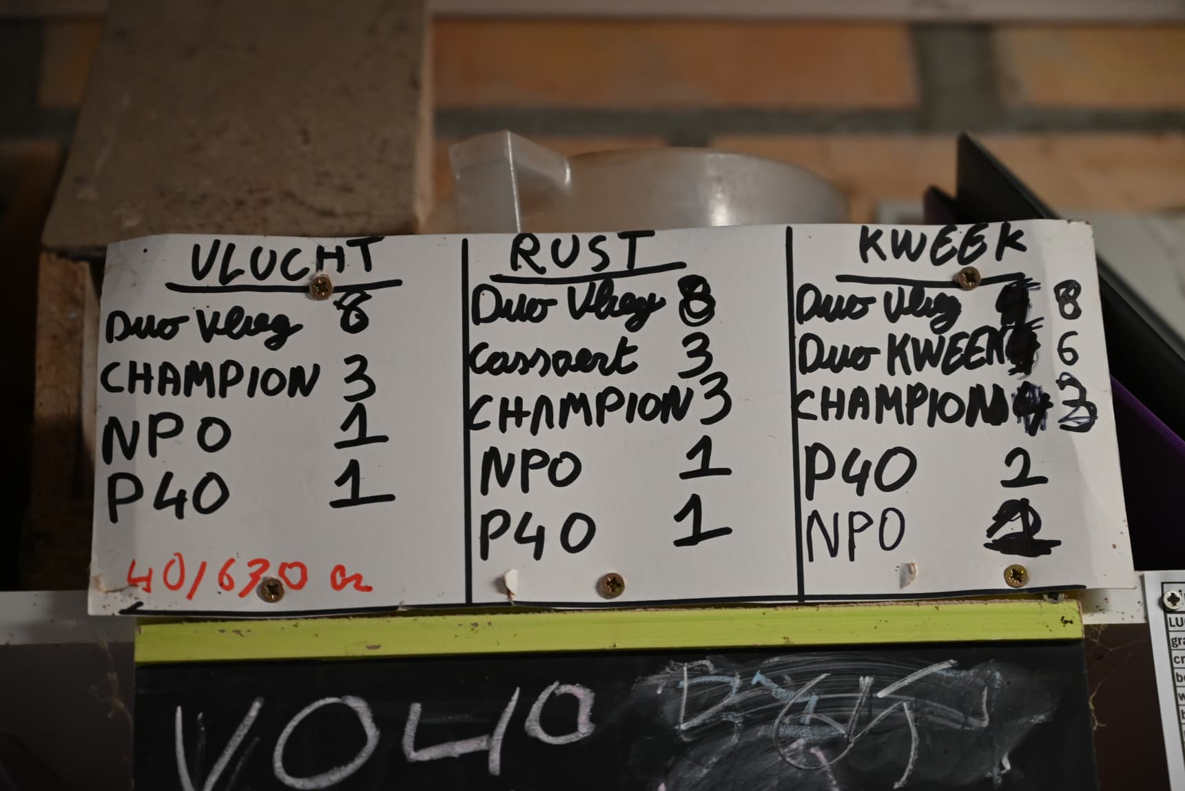 Francky: “Op het kweekhok huizen 30 kweekkoppels. Voor het seizoen 2026 hebben we voor eigen gebruik 60 jonge duiven en een 40-tal jonge duiven zijn naar Liedekerke verhuisd waar Robbe ze gaat testen op de hokken van De Ridder - Van Den Brande. Wat de basis van onze kolonie betreft kunnen we alles herleiden naar originele duiven van Luc Temmerman, Ad Schaerlaeckens (enkele rechtstreekse, maar meeste via via zoals via Johan Delanghe) en sinds 2-tal jaar Sioen Hilde & Luc.  Mijn basiskoppel komt van eerstgenoemde Luc Temmerman. Het was Robbe die suggereerde om duiven bij Luc te gaan kopen. Luc was niet de beste liefhebber van onze club maar Robbe – die als inkorver hielp in het lokaal – was steeds onder de indruk van de kwaliteit vande Temmerman duiven als hij de duiven van Luc ingekorfd had. In eerste instantie kochten we een bon van Luc en die duif werd 5e provinciale asduif KBDB snelheid. Deze duif is onze “Sultan” en aangezien we zo succesvol waren hebben we de ouders van “Sultan” gekocht. Dit koppel is  “Pa Sultan” (B12-3092266) x “Ma Sultan” (B12-3092267) zijn ondertussen al ouder/grootouder van 120 eerste prijzen! Als men als liefhebber het geluk heeft om onmiddellijk zulk kweekkoppel te ontdekken, dan zit je al direct op het juiste pad.