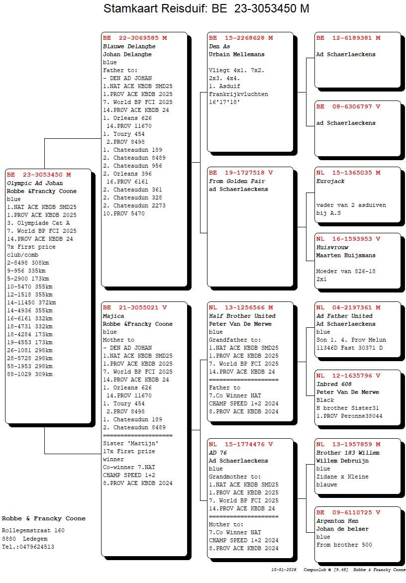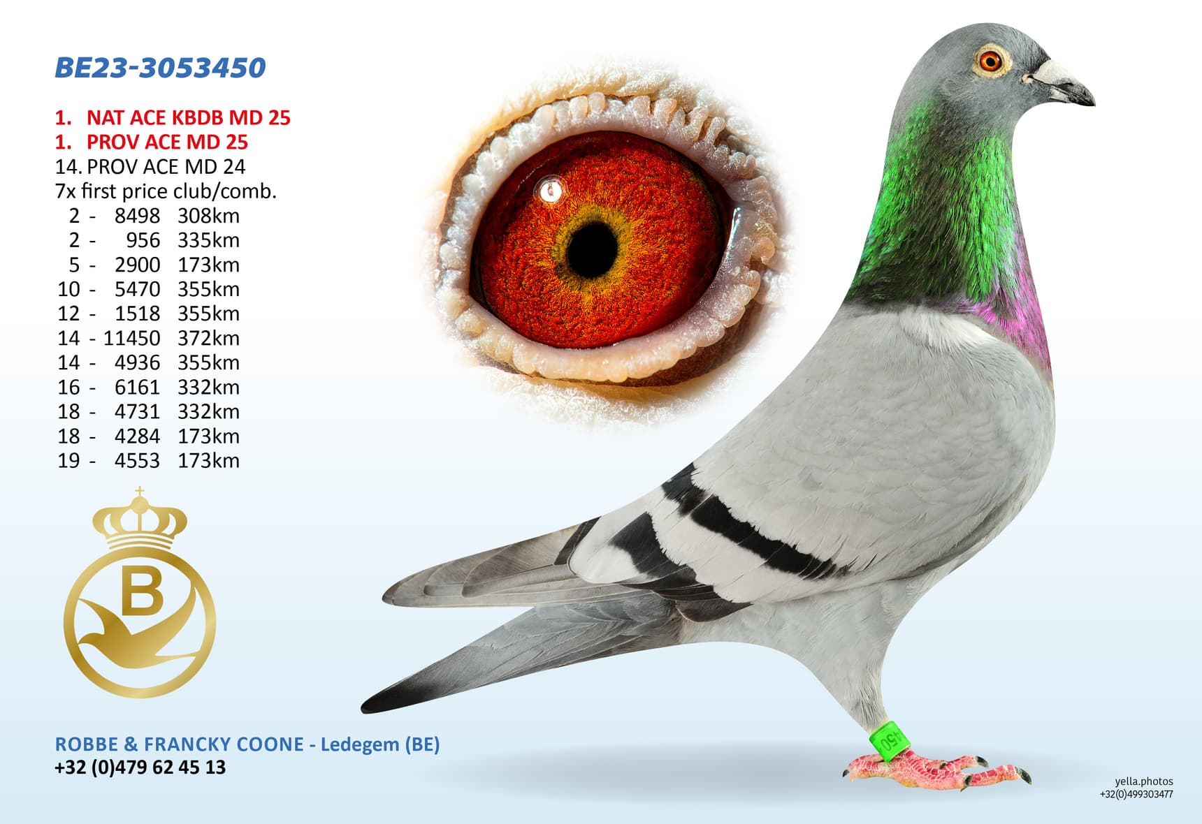 Ledegem : Op bezoek bij de nationale asduif winnaar oude halve fond KBDB 2025… hiervoor dienden we de neus van onze wagen richting West-Vlaanderen en meer specifiek Ledegem te zetten. Familie Coone is sinds generaties lang een echte duivenfamilie. Vroeger was er Roger, de papa van Francky, die er alles aan zou gedaan hebben zodat zijn zoon geen duivenliefhebber zou geworden zijn. In eerste instantie lukte hij perfect in zijn opzet, want Francky was als bouwvakker overdag een hele dag op een of andere werf en voor de duiven was er geen tijd. Maar Roger had geen rekening gehouden met kleinzoon Robbe. In 2011 vulde Robbe zijn eerste hoklijst in en enkele dagen later mocht hij pronken met zijn “KBDB lidkaart”.  Papa Francky zag een unieke kans om toch met de duiven te beginnen en haalde zijn werkmaterialen van zijn camionette. Er werd een eerste bescheiden duivenhokje gebouwd. Maar wat bleek… vanop dit hok gingen bijna alle duiven verloren en met de “overblijvers” wou het maar niet lukken om eens een paar weken na elkaar een mooie uitslag op papier te zetten. De reden waarom dit eerste hokje een “verdoemd” hok was, is nog steeds niet gekend maar de oplossing werd gevonden door de vroegere tuinhokken van papa/grootvader Roger te verhuizen en neer te poten aan de andere kant van de tuin dan waar hun eerste hok staat en sindsdien gaat het crescendo met de uitslagen met als voorlopig hoogtepunt het behalen van de 1e nationale asduif KBDB. Het “verdoemde hok” werd ondertussen omgevormd tot een kweekhok en hiervoor doet het blijkbaar wel zeer goed dienst.