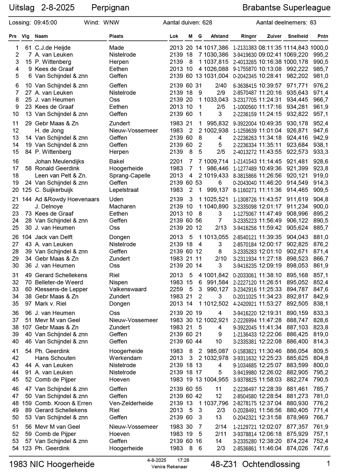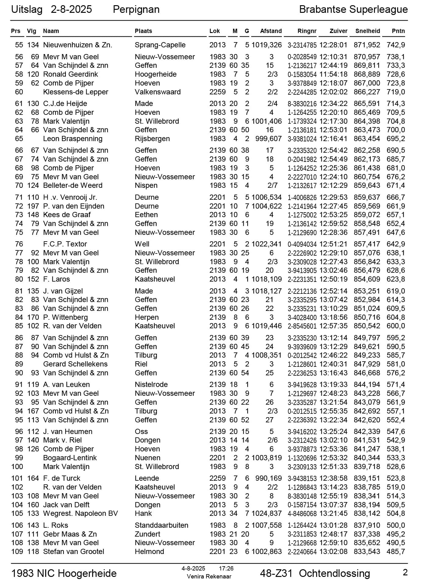 Wat de reden ook moge zijn ’s avonds werden er in Frankrijk geen duiven aangemeld, dus de volgende morgen lag het hele speelveld nog open. Om 8.11.35 uur snelde de “383” van 2021 bij sportvriend Cor de Heijde in Made het hok in alsof hij persoonlijk door de duvel op de hielen werd gezeten. Met 1114 mpm op een afstand van 1017 km bleek hij schier onklopbaar, niet één duif onder de Brabantse hemel zou een beter resultaat kunnen overleggen, de overwinning was binnen. Gelukkig weer een lichtpuntje voor Cor, die de laatste tijd in de privésfeer genoeg voor zijn kiezen heeft gekregen. De de Heijde-duif manifesteert zich met alle soorten weer, dat heeft Cor op deze Perpignan weer overduidelijk aangetoond. Onze felicitaties gaan naar de Fresiastraat in Made, waar Cor trots mag zijn op het behaalde resultaat.