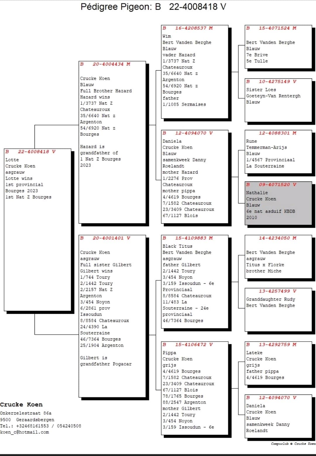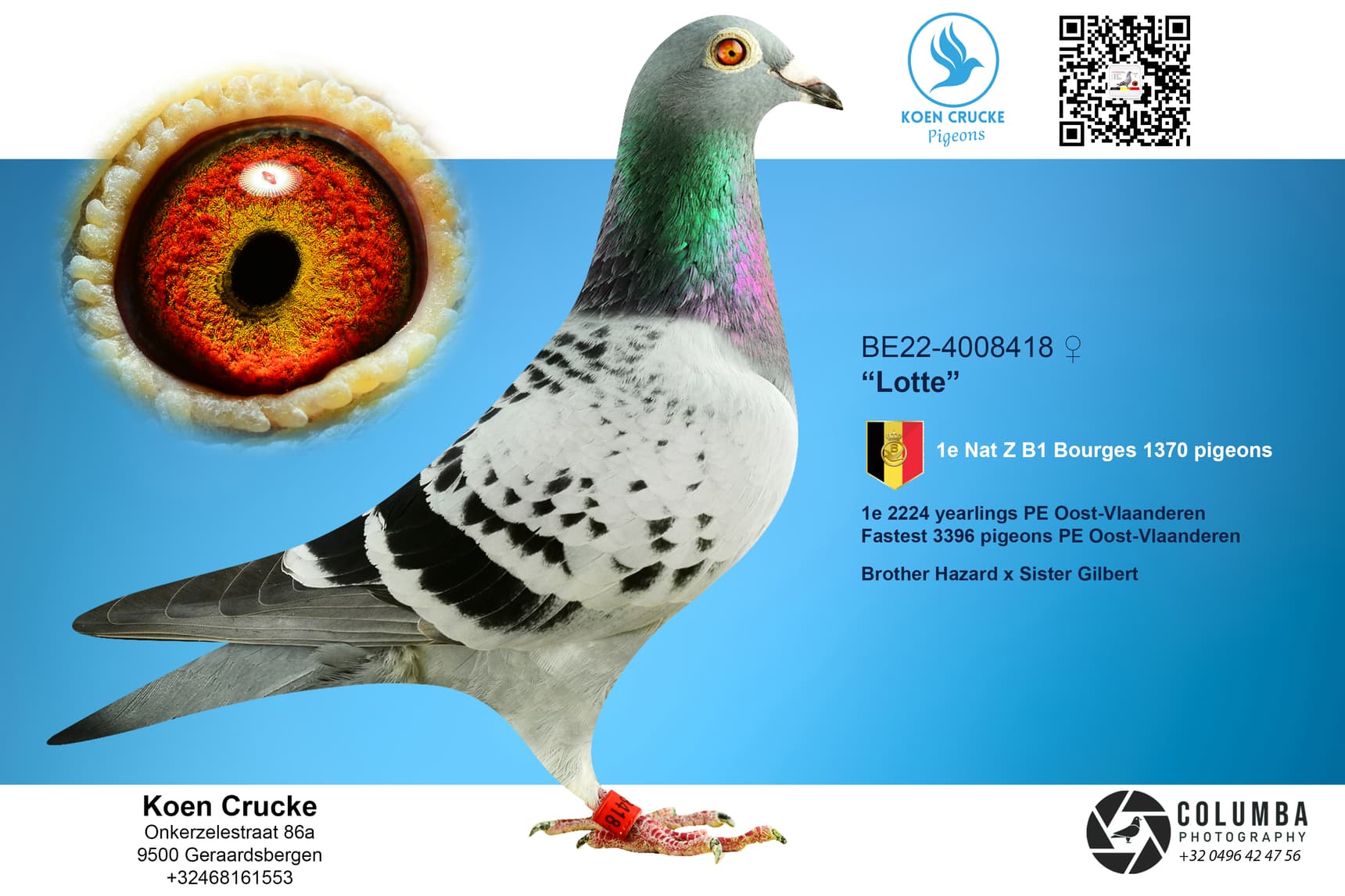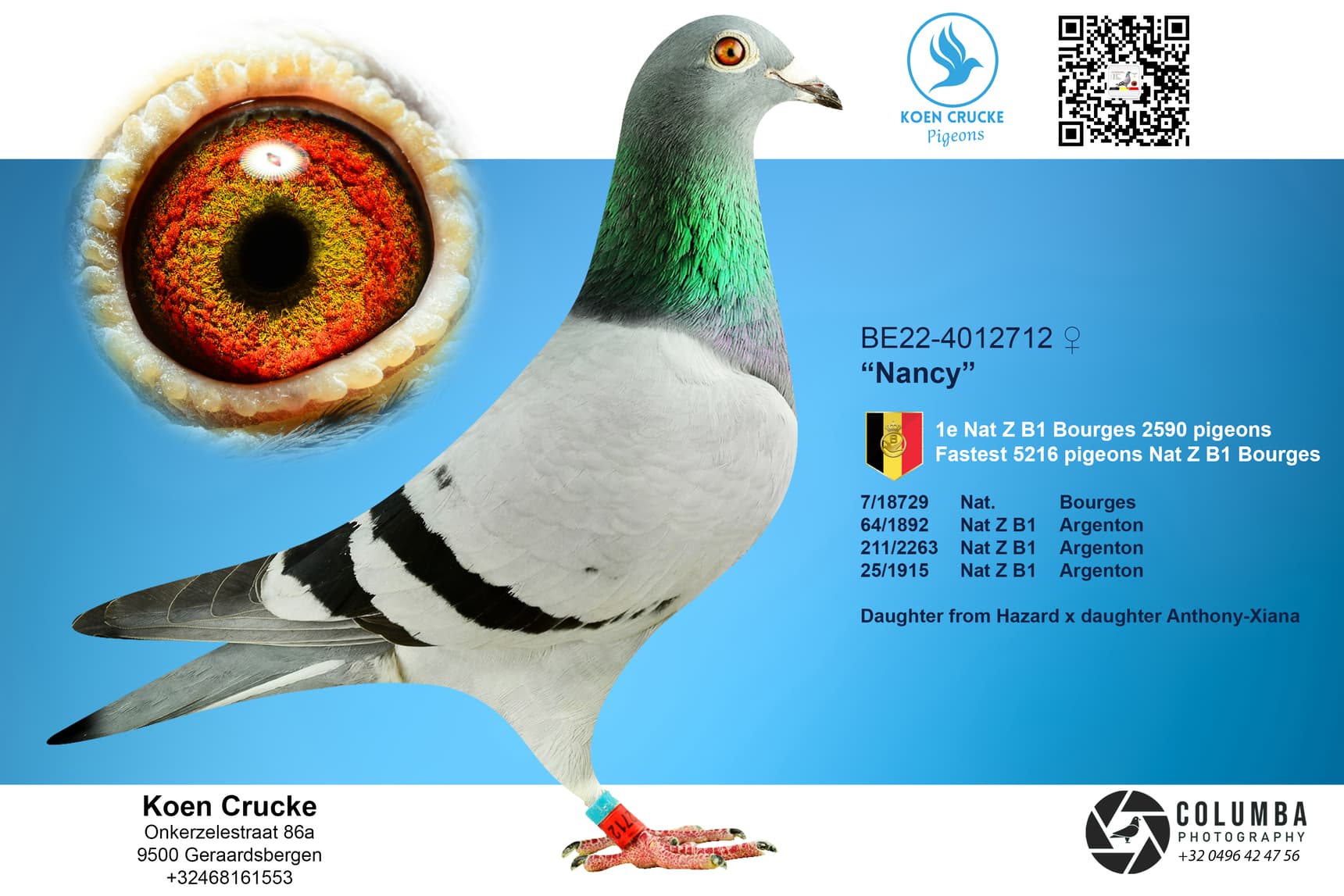 Onkerzele, deelgemeente van mattentaartenstad Geraardbergen, gelegen tussen in het wielermilieu gekende “Muur” en “Bosberg”, daar is het dat Koen jaarlijks zijn provinciale en nationale zone zeges verzamelt. Ook dit seizoen is het al “bingo” geweest. Alles begon op de eerste nationale Bourges/Vierzon vlucht. Toen was het duivin “Nancy” (B22-4012712) die het laken naar zich toe trok en met de nationale zone overwinning ging pronken. Nationaal vonden we haar ringnummer op plaats 7 tegen 18.729 jaarse duiven terug.