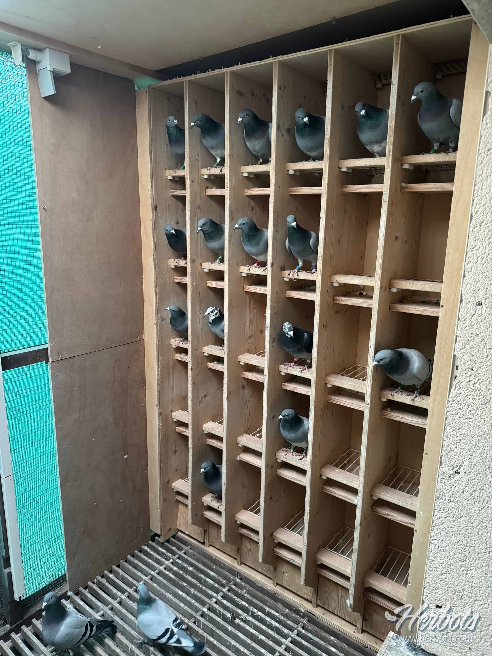 De jonge duiven worden hier wel verduisterd tot 10 juni ( 18u ’s avonds tot 8u00 ’s morgens ) en worden van begin augustus bijgelicht. Ze worden de eerste 4-5 vluchten gewoon gespeeld en gaan pas daarna op de schuifdeur die 45 minuten opengaat bij inkorving. Na de vlucht mogen ze dan naargelang de tijd die we hebben samenblijven tot ’s avonds ofwel de dag nadien ’s morgens.