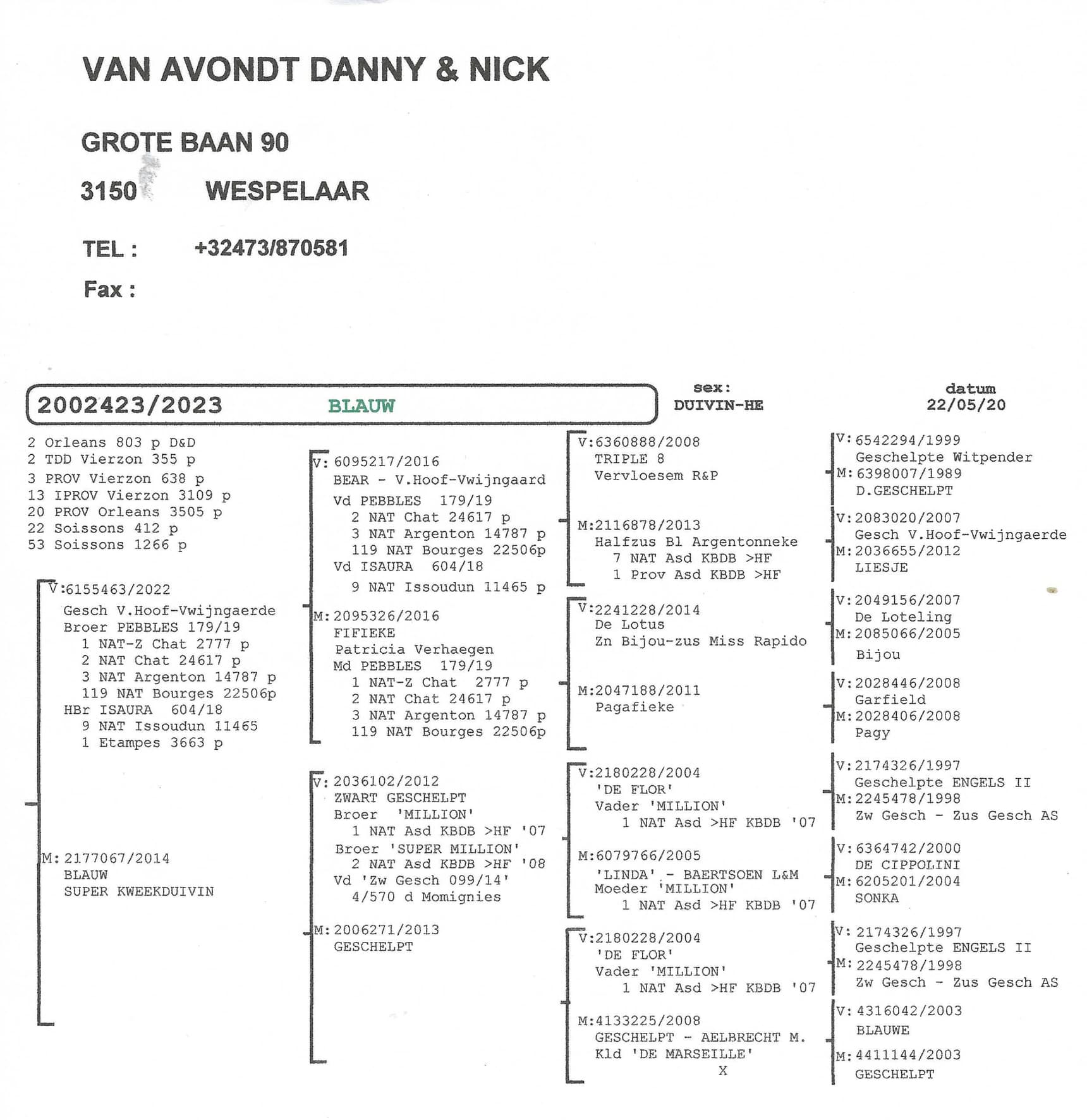 Op de eerste interprovinciale vlucht vanuit Vierzon deden de jaarlingen van Nick & Danny Van Avondt het fantastisch. Ze winnen niet alleen 1ste Provinciaal tegen 638 jaarlingen maar ook 3de en 8ste, in totaal winnen ze 12 prijzen van hun 15 duiven. Opnieuw is het hier de lijn van “Million” & “Super Million” die nog steeds de rode draad vormen in deze kolonie.