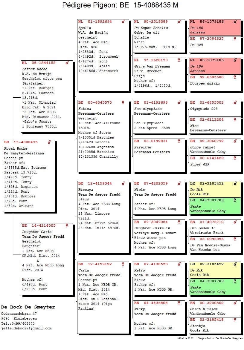 Royal Roche (BE15-4088435) is een combinatie van De Bruiyn met Team De Jaeger en is vader diverse duiven die 1e prijs vlogen en bovenal vader van de 1e nationaal Bourges !