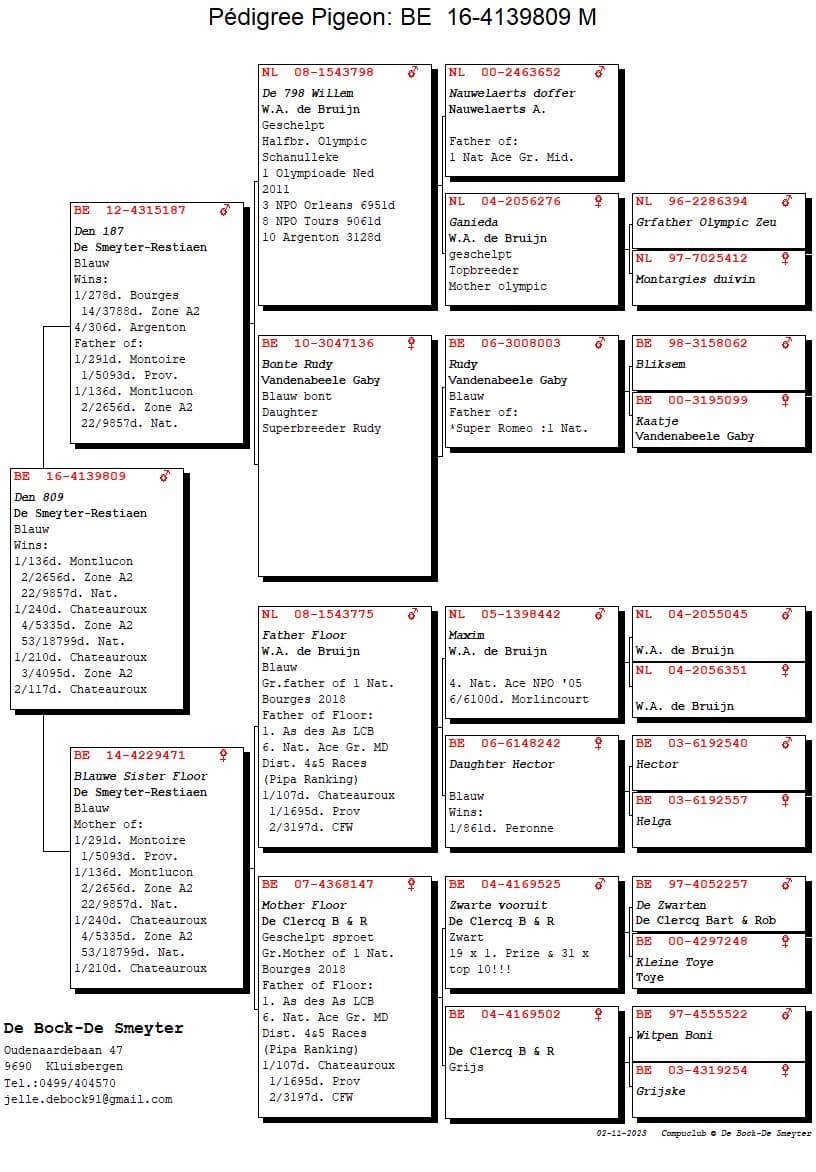 - Den 809 (BE16-4139809) was een begenadigd vlieger met toppen op Chateauroux, Montluçon-nationaal. Hij is een mix van de duiven van Willem De Bruyn en Gaby Vandenabeele en de niet te versmaden lijn van de Super Zwarten van Robert en Bart De Clercq.