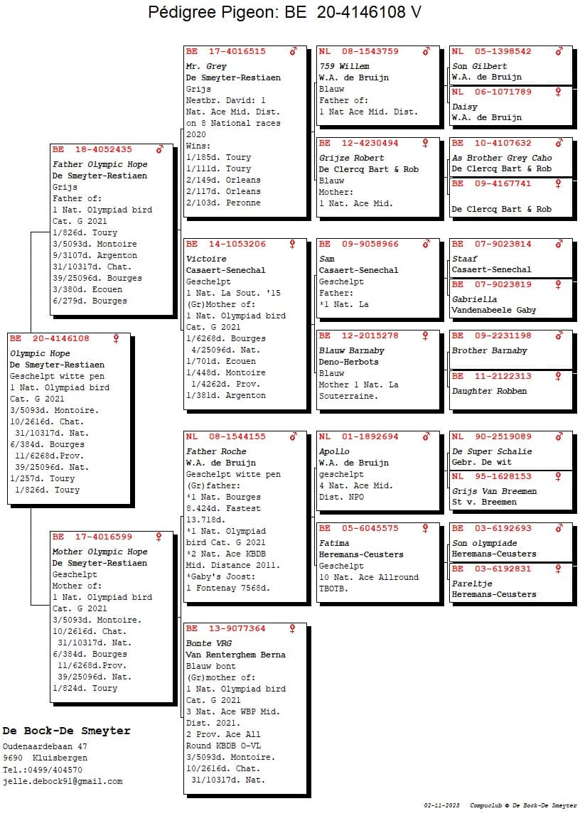 Olympic Hope (BE20-4146108) of de 1e nationale Olympiade-duif Cat G 2021. Een eer om zo een duivin te mogen bezitten. Ze vloog top op alle zware halve fondvluchten waaraan ze deelnam, blonk uit in regelmaat en in kopvliegen. Haar afstamming is Willem De Bruiyn, Bart en Robert De Clercq, Casaert, en Bernard Van Renterghem.