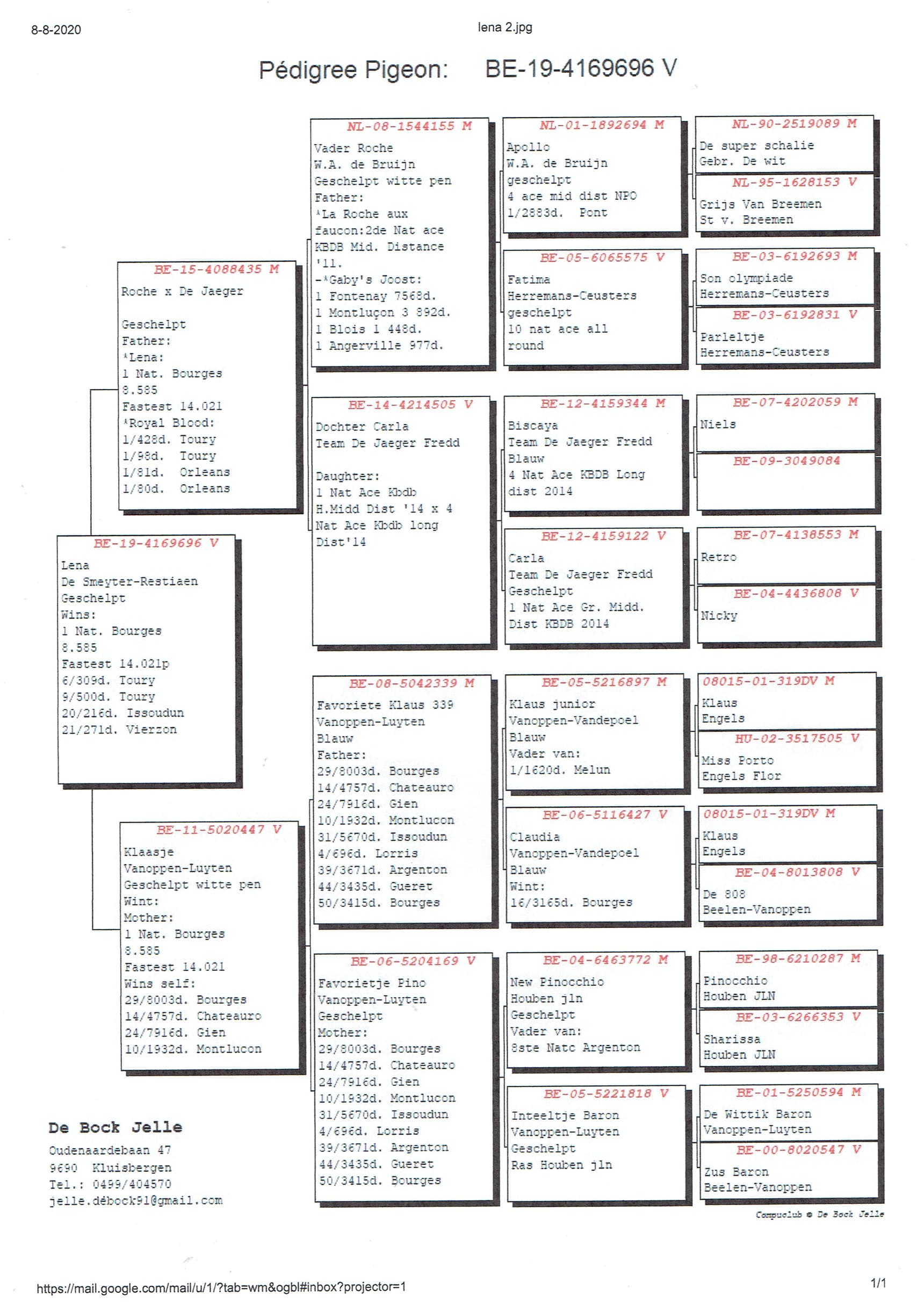 Hij is omringd door mensen met heel veel ervaring (zijn pa, zijn schoonpa, Joost…) maar gaat heel goed zijn eigen weg en doet dit met verve. Duivin Lena (BE19-4169696) behaalde de nationale zege op een zeer mooie Bourges-vlucht van 8.585 jaarduiven. Wanneer we naar de afkomst van Lena kijken dan vinden we namen terug zoals Willem De Bruijn, Vanoppen-Luyten, enz….