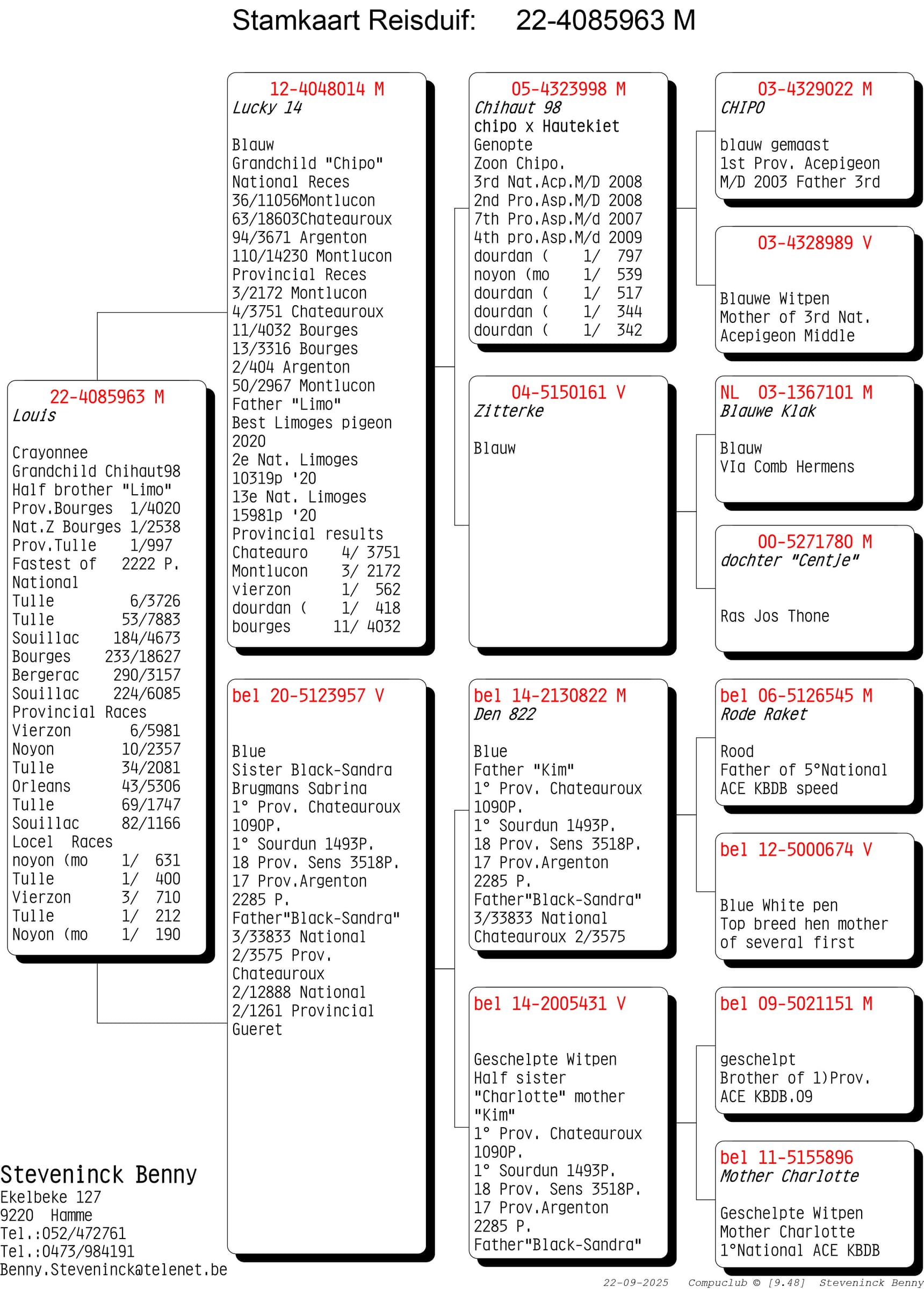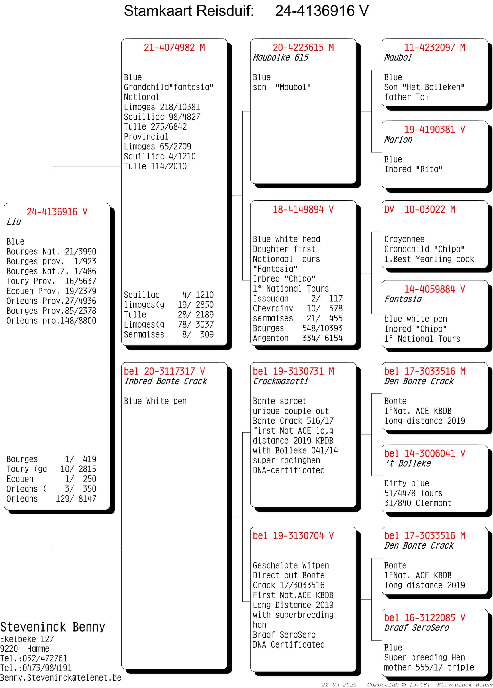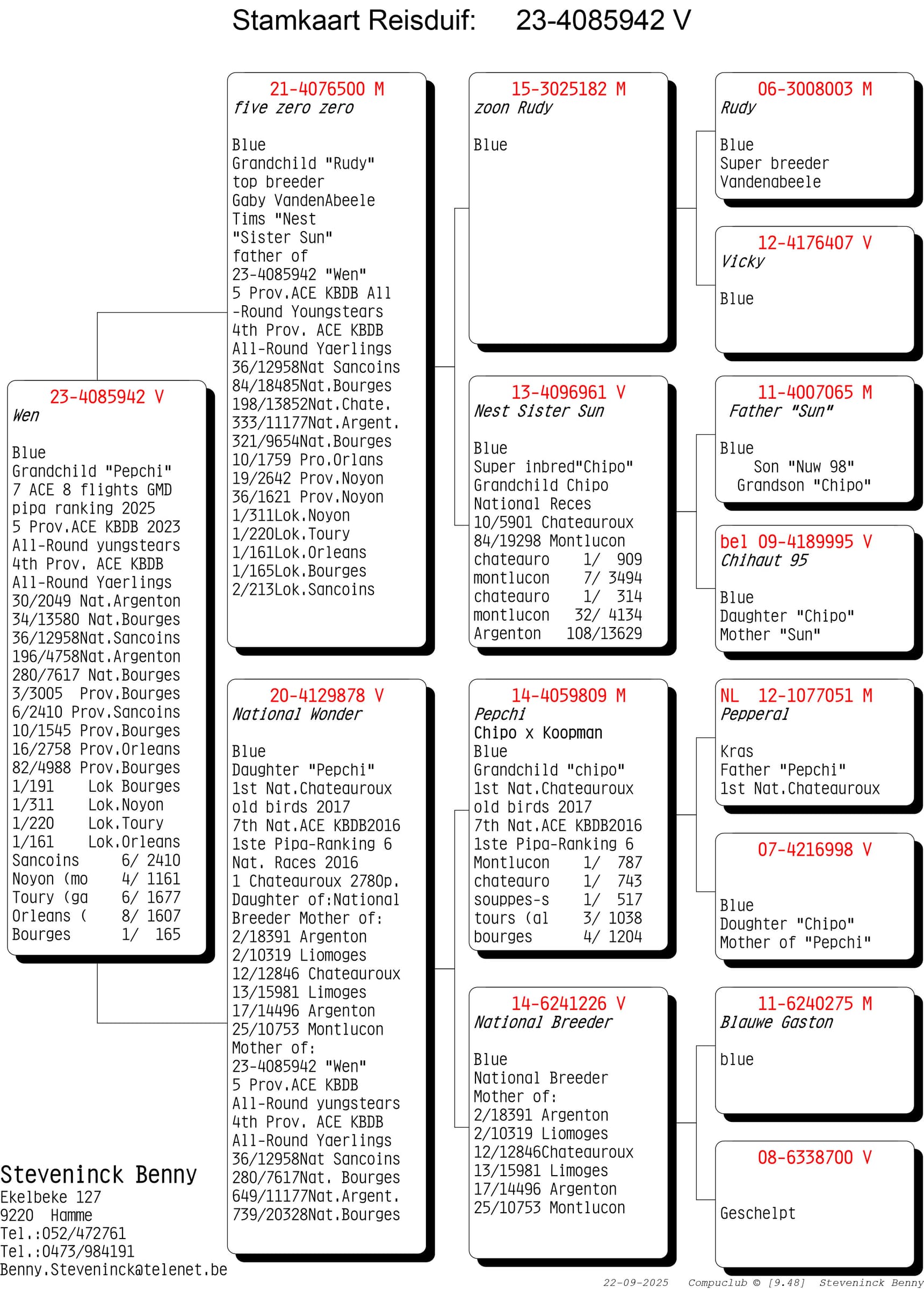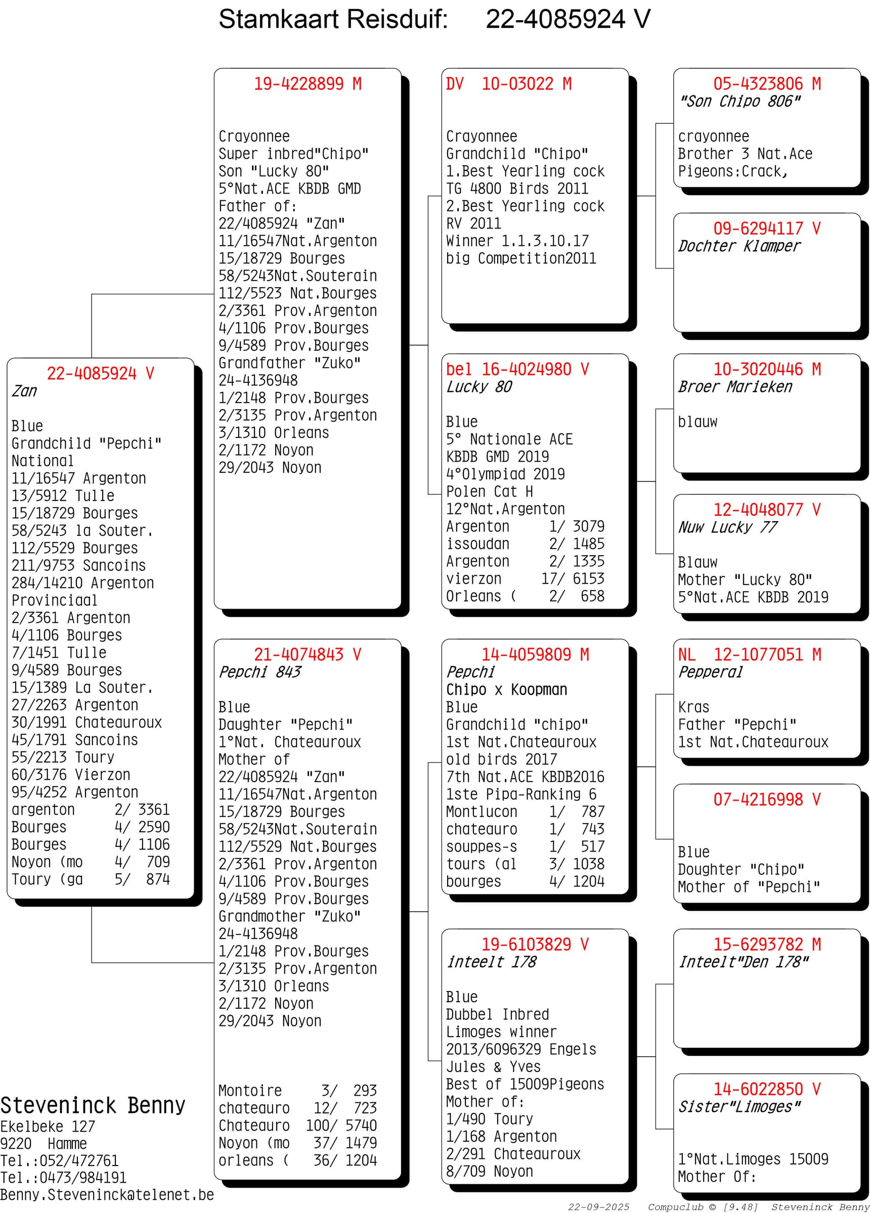 Wat opvalt is dat de kracht van de Steveninck duiven niet stopt na 1 generatie. Nee…de voorbeelden waarbij er na 2, 3 en zelfs meerdere generaties kampioenen gekweekt worden is ongekend. Maar weinig kolonies in België kunnen zulke referenties op tafel leggen. De rode draad door de kolonie blijft “Chipo” en zijn talloze kinderen en het mooie aan het verhaal is dat deze lijn zich perfect laat kruisen. De “winnende genen” van de Chipo lijn aanvaardt verrijking.