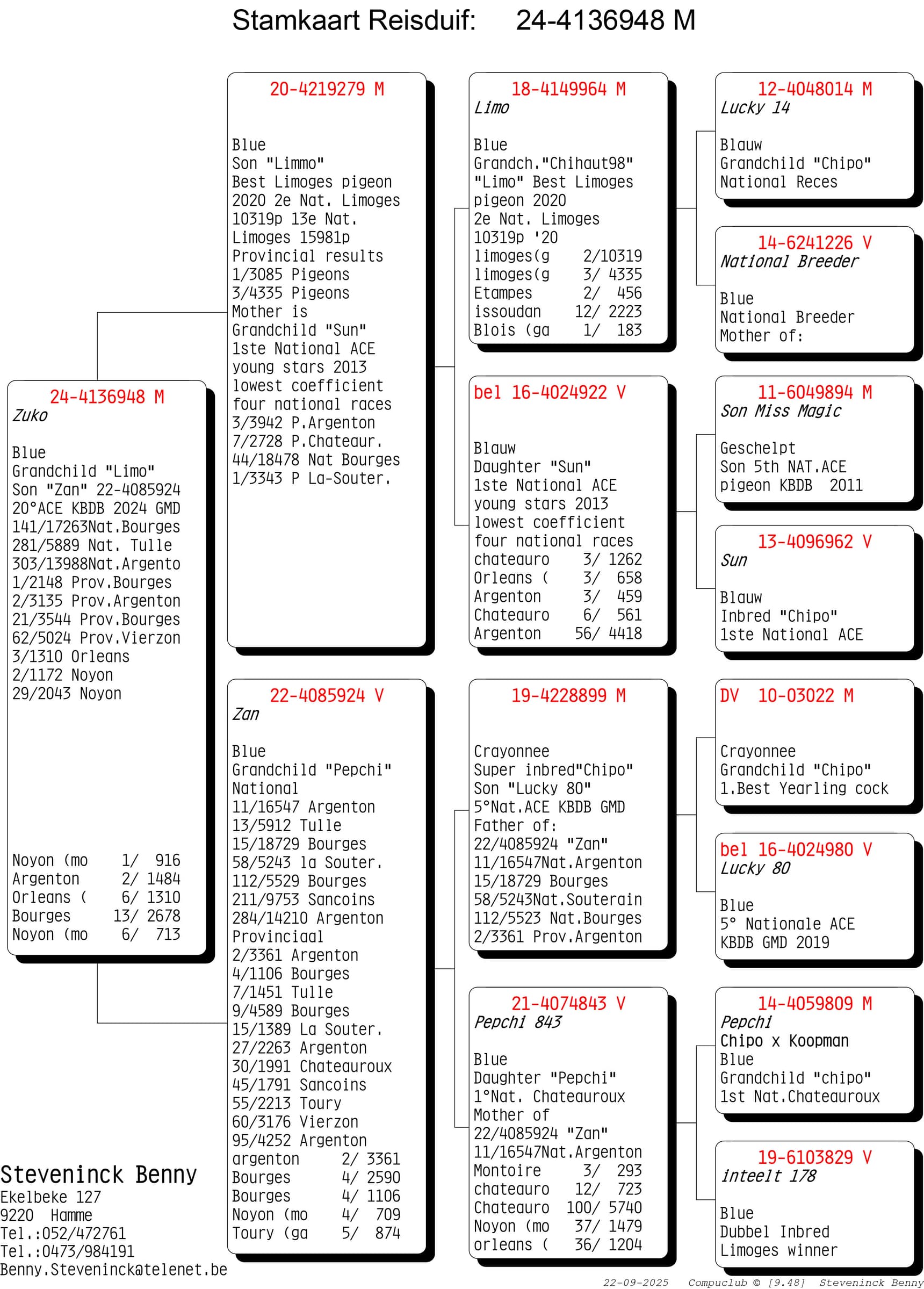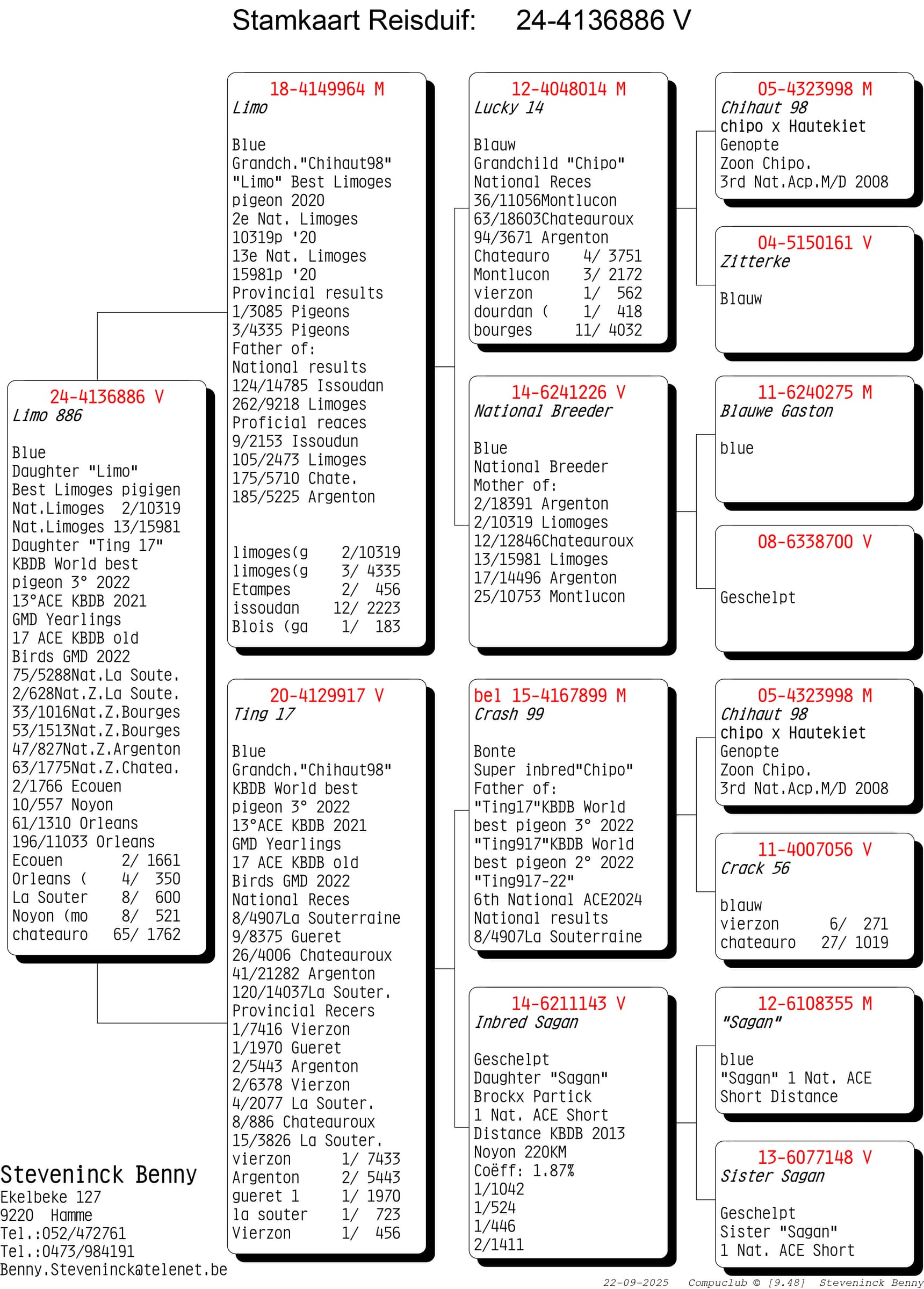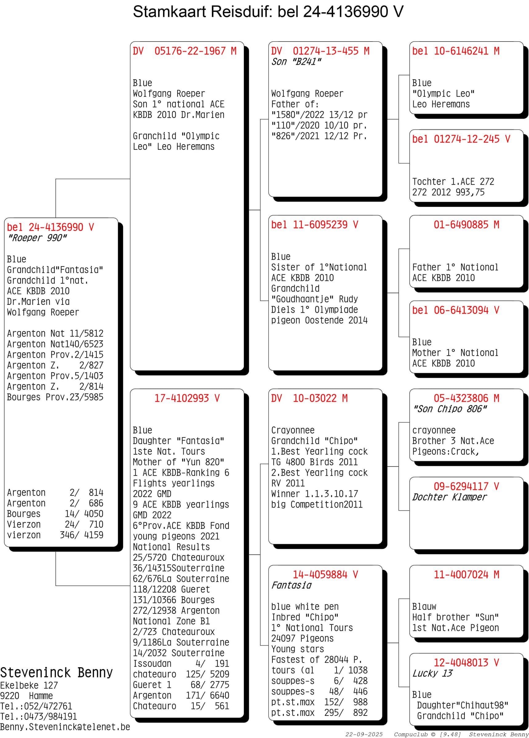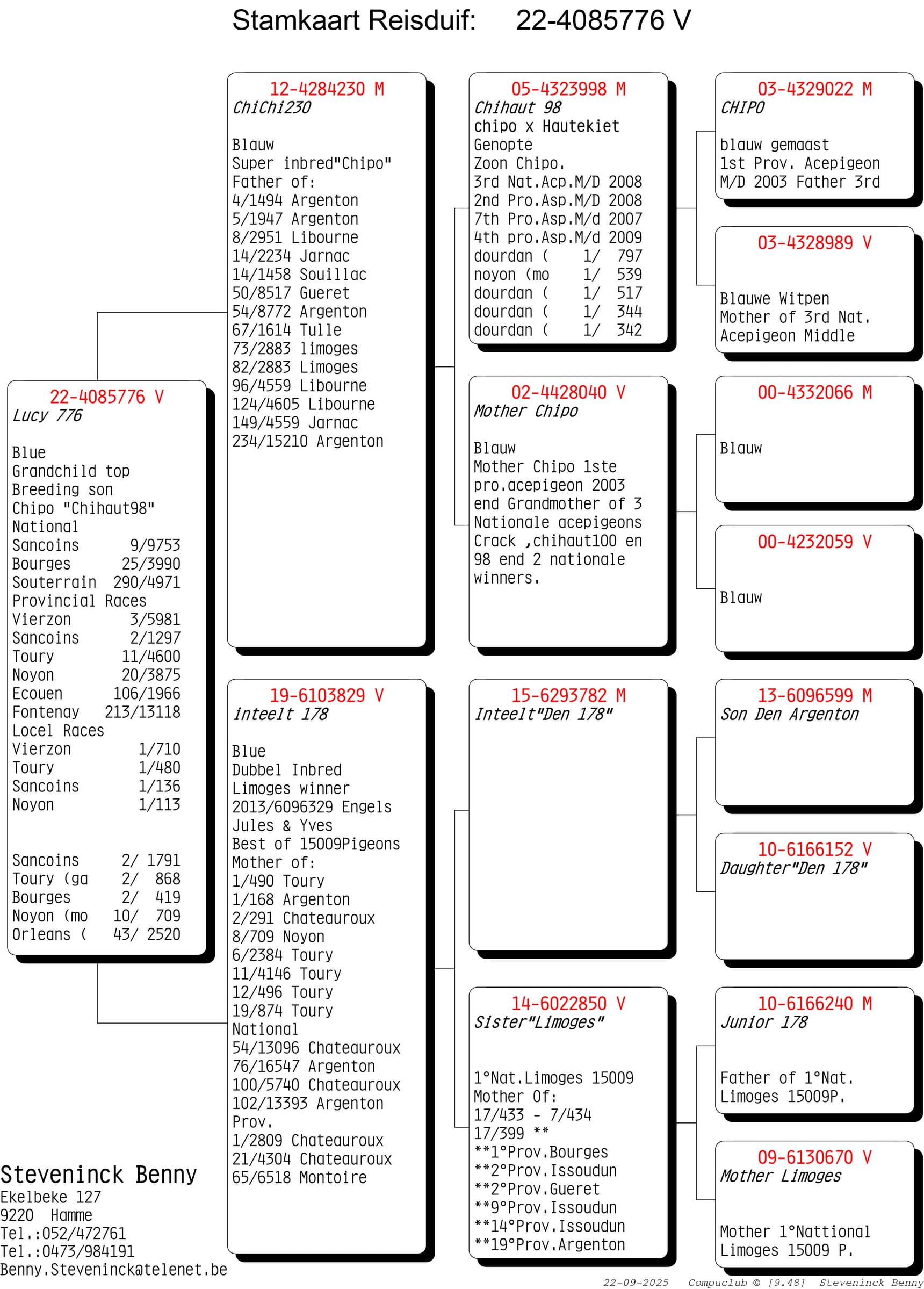 Wat opvalt is dat de kracht van de Steveninck duiven niet stopt na 1 generatie. Nee…de voorbeelden waarbij er na 2, 3 en zelfs meerdere generaties kampioenen gekweekt worden is ongekend. Maar weinig kolonies in België kunnen zulke referenties op tafel leggen. De rode draad door de kolonie blijft “Chipo” en zijn talloze kinderen en het mooie aan het verhaal is dat deze lijn zich perfect laat kruisen. De “winnende genen” van de Chipo lijn aanvaardt verrijking.