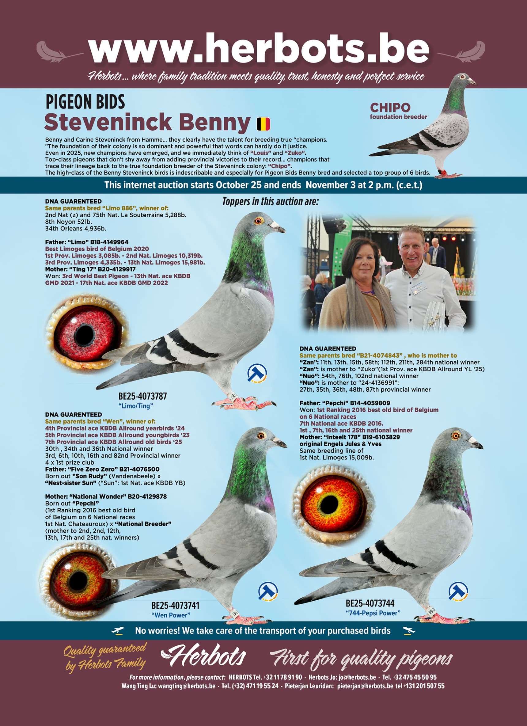 BENNY BIEDT OP INTERNETVERKOOP PIGEON BIDS EEN UNIEKE GROEP VAN STRENG GESELECTEERDE DUIVEN AAN